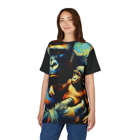 Gorilla Holding Baby Art Tee | Colorful Unisex Cut & Sew T-Shirt, Wildlife Apparel, Unique Graphic Tee, Birthday Gift