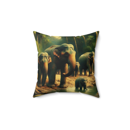 Elephant Throw Pillow featuring Asiatic Elephant Herd at Watering Hole, in Post-Impressionist Style Art