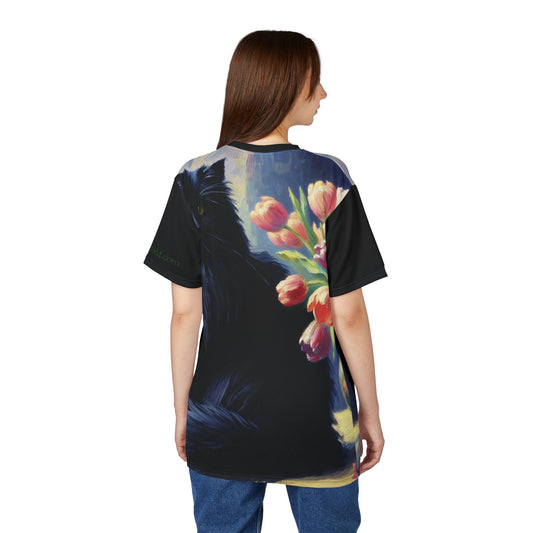 The Artist's Black Cat with Pink Tulips Vibrant Art Tee | Colorful Unisex Cut & Sew T-Shirt, Wildlife Apparel, Unique Graphic Tee, Birthday GiftRegular price From $ 54.95 USDRegular priceUnit price / per-