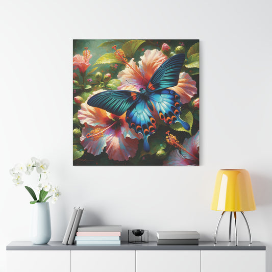 Butterfly Canvas Wall Art - Blue Butterfly with Hibiscus, Impressionist Art Style