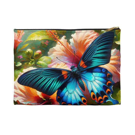 Blue Butterfly with Hibiscus Makeup Bag, Butterfly Accessory Pouch, Nature-Themed Gift, Floral Storage Bag, Craft Supply Pouch