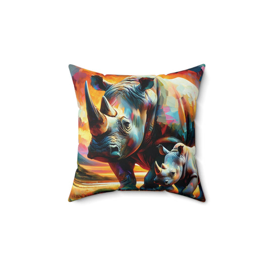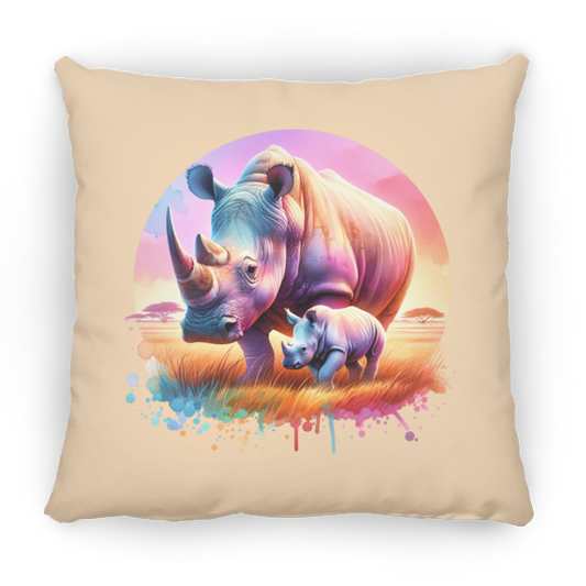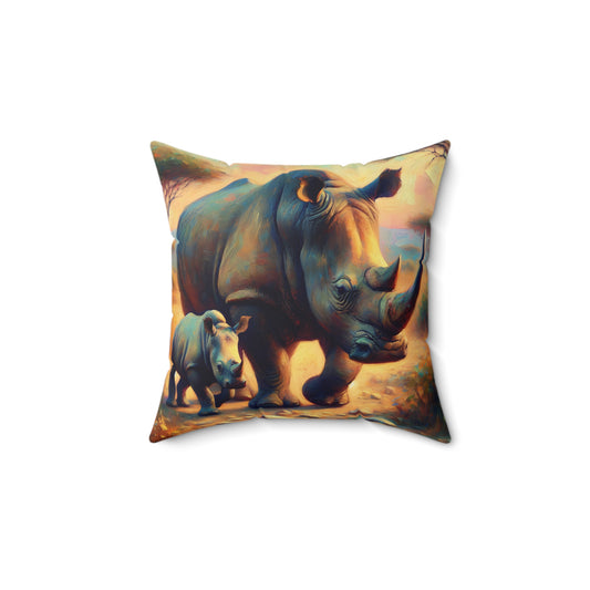 Rhino Throw Pillow - Rhino with Baby Impressionist Style Art on Faux Suede Square Pillow