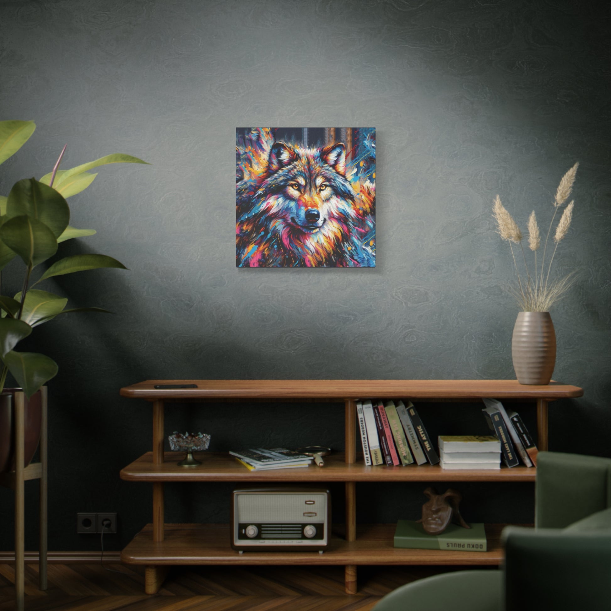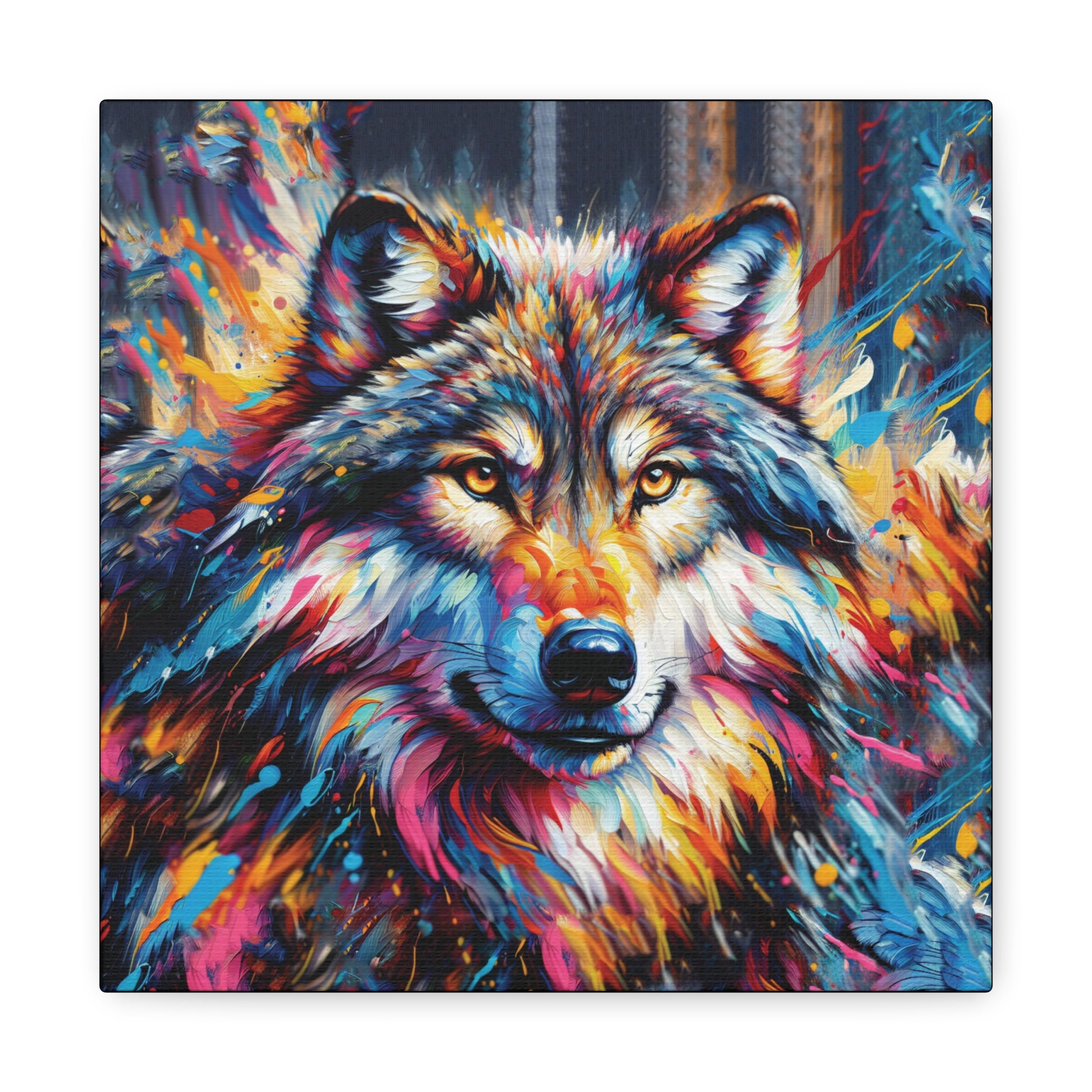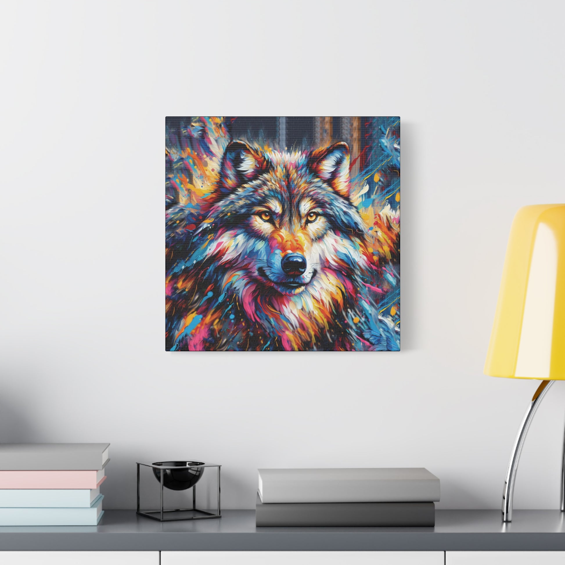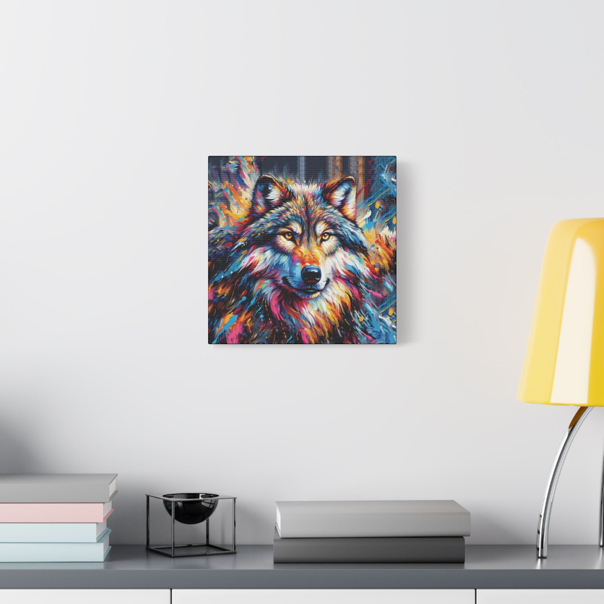 Bold, beautiful, stunning. This colorful portrait of an alpha wolf will add a touch of benevolent strength to any room. Wolf collectors would be ecstatic to receive this as a gift! Ideal for home decor, office spaces, or as a gift for nature enthusiasts.