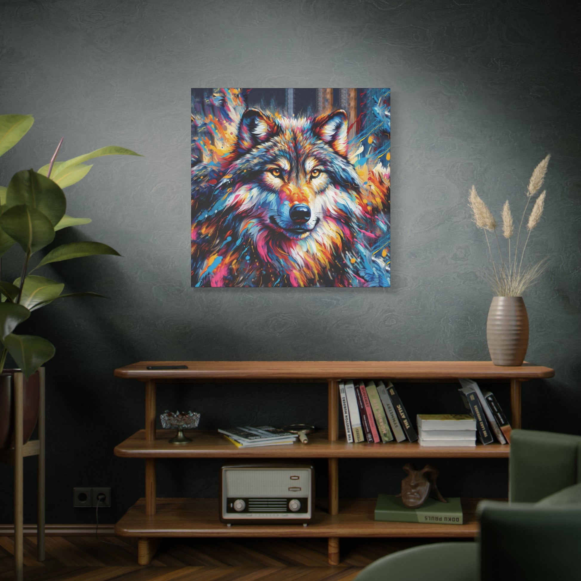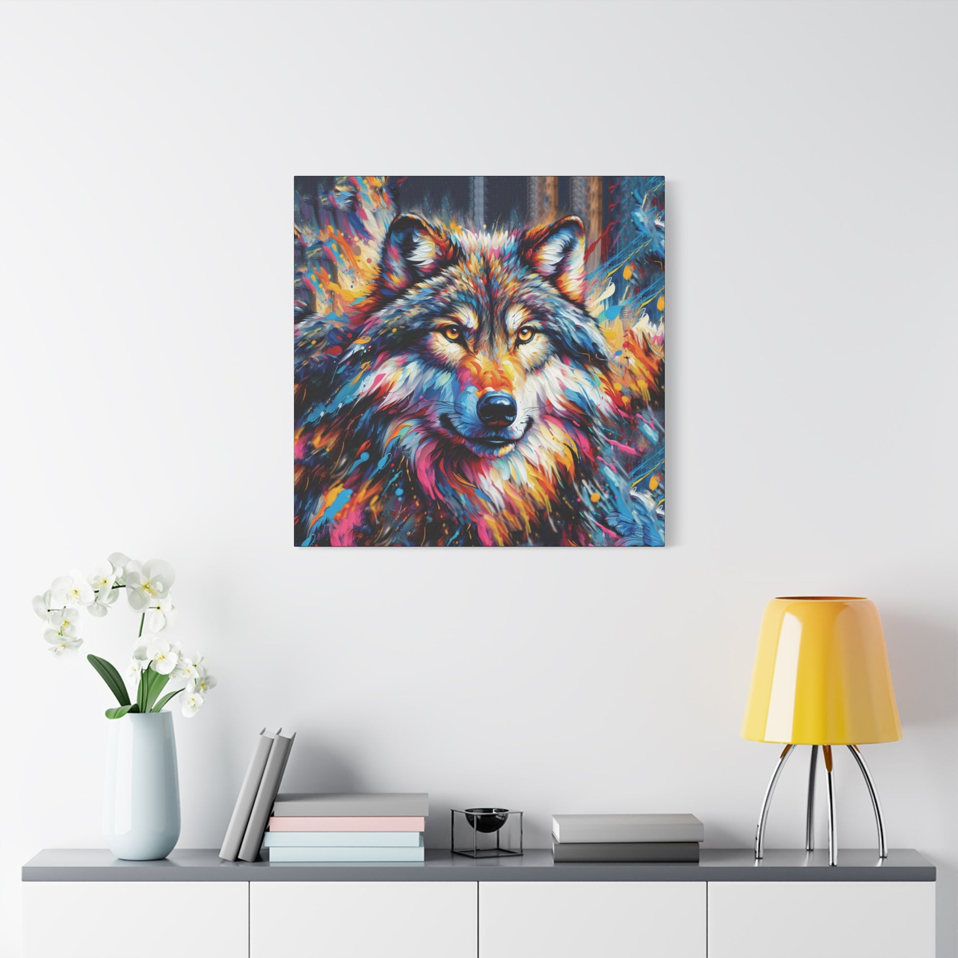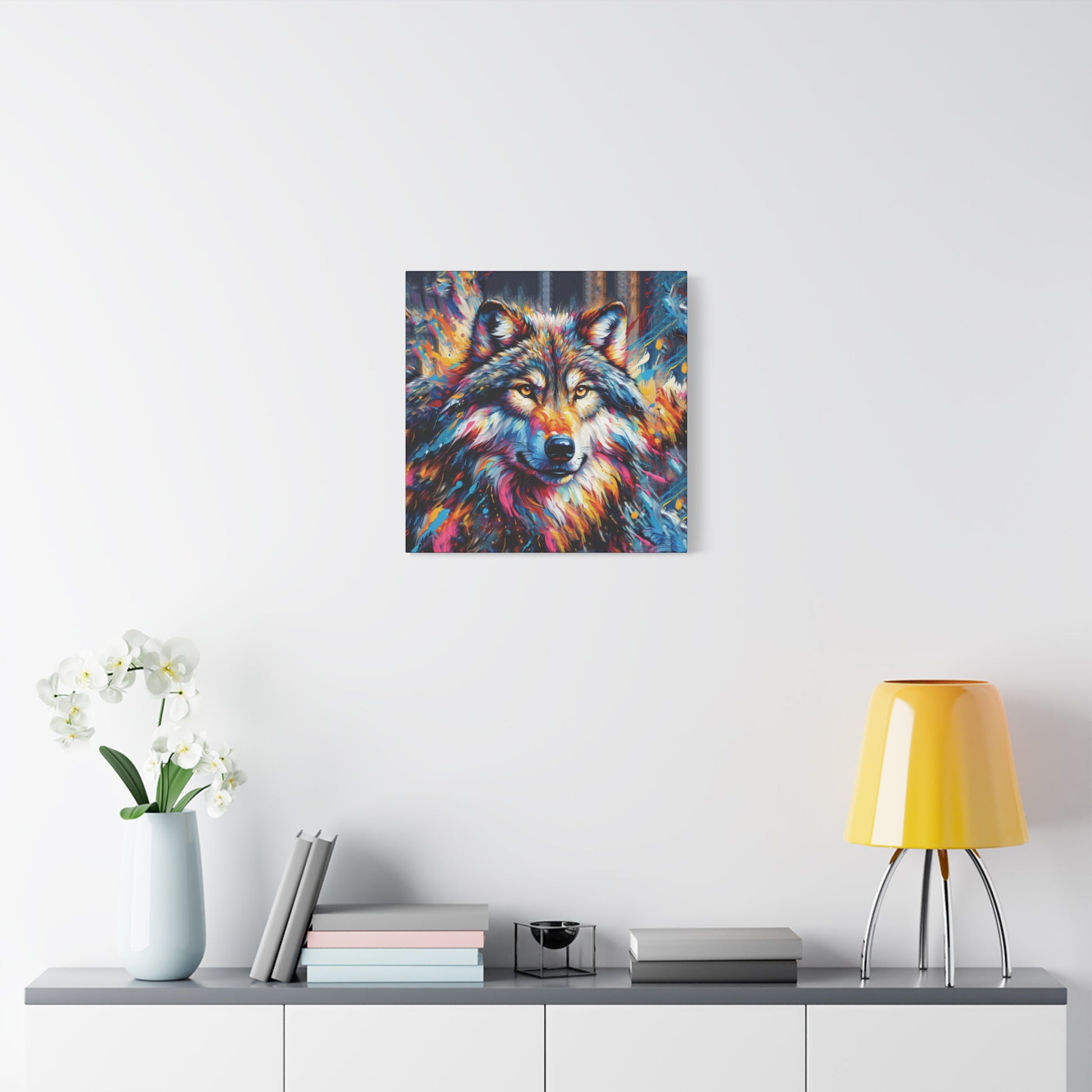 Bold, beautiful, stunning. This colorful portrait of an alpha wolf will add a touch of benevolent strength to any room. Wolf collectors would be ecstatic to receive this as a gift! Ideal for home decor, office spaces, or as a gift for nature enthusiasts.