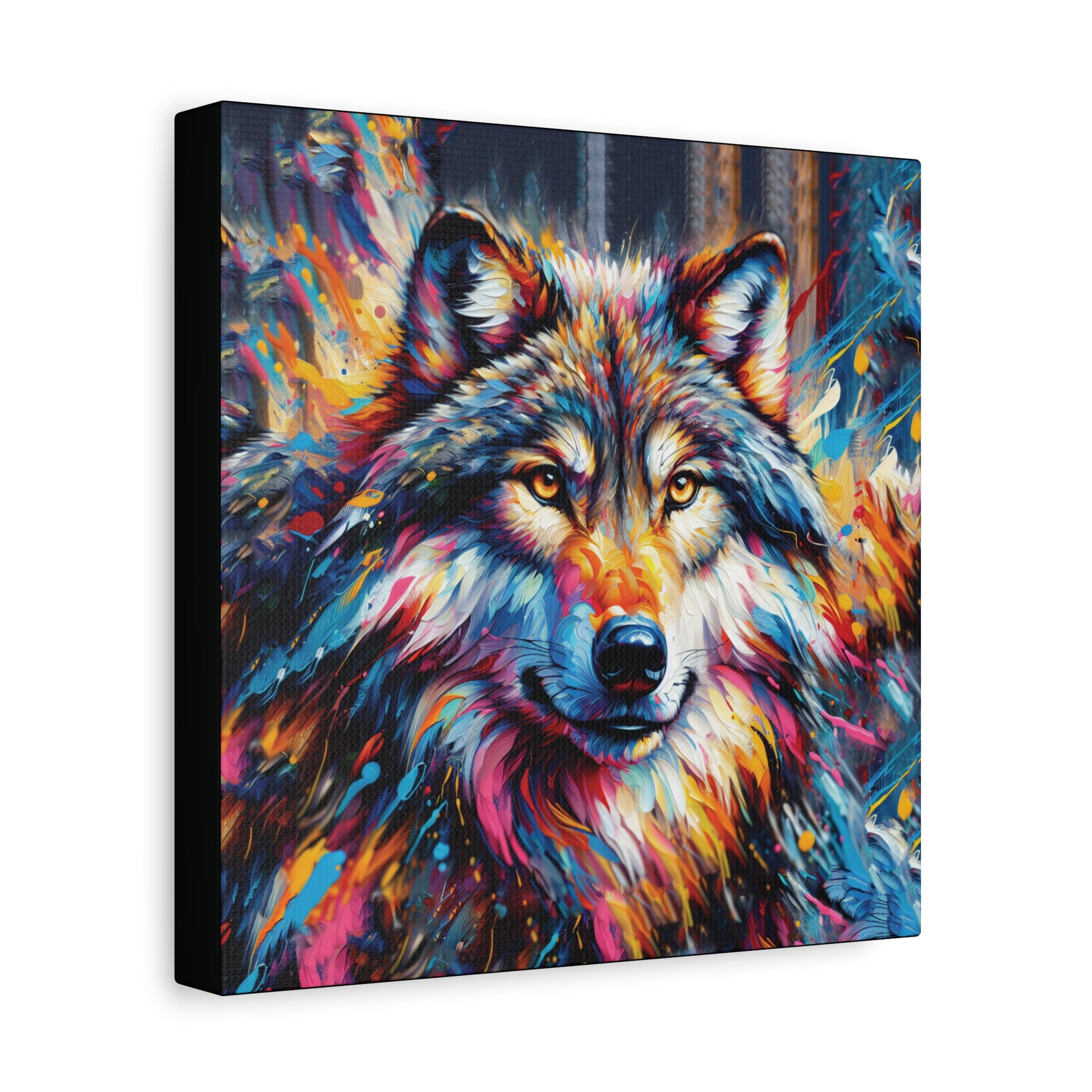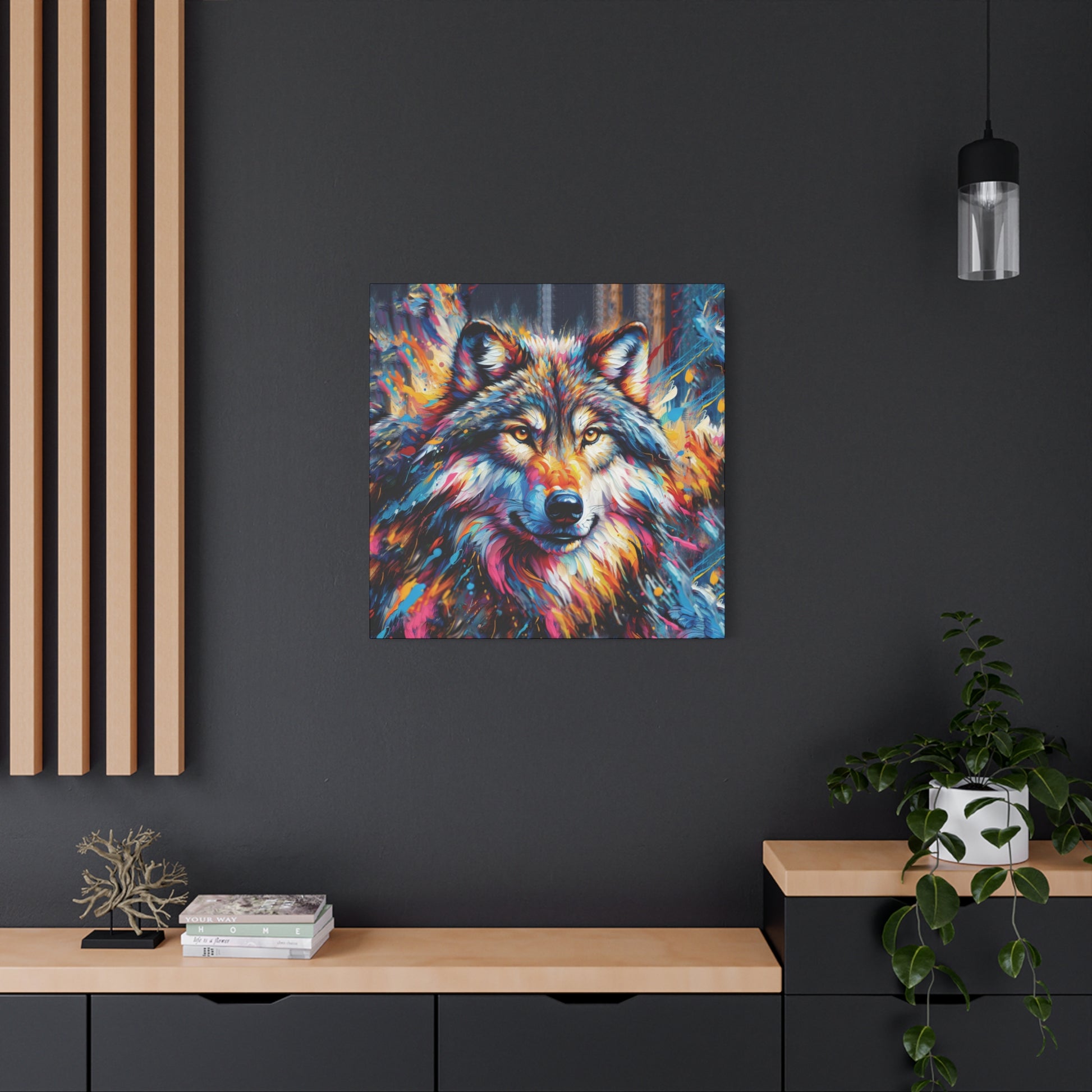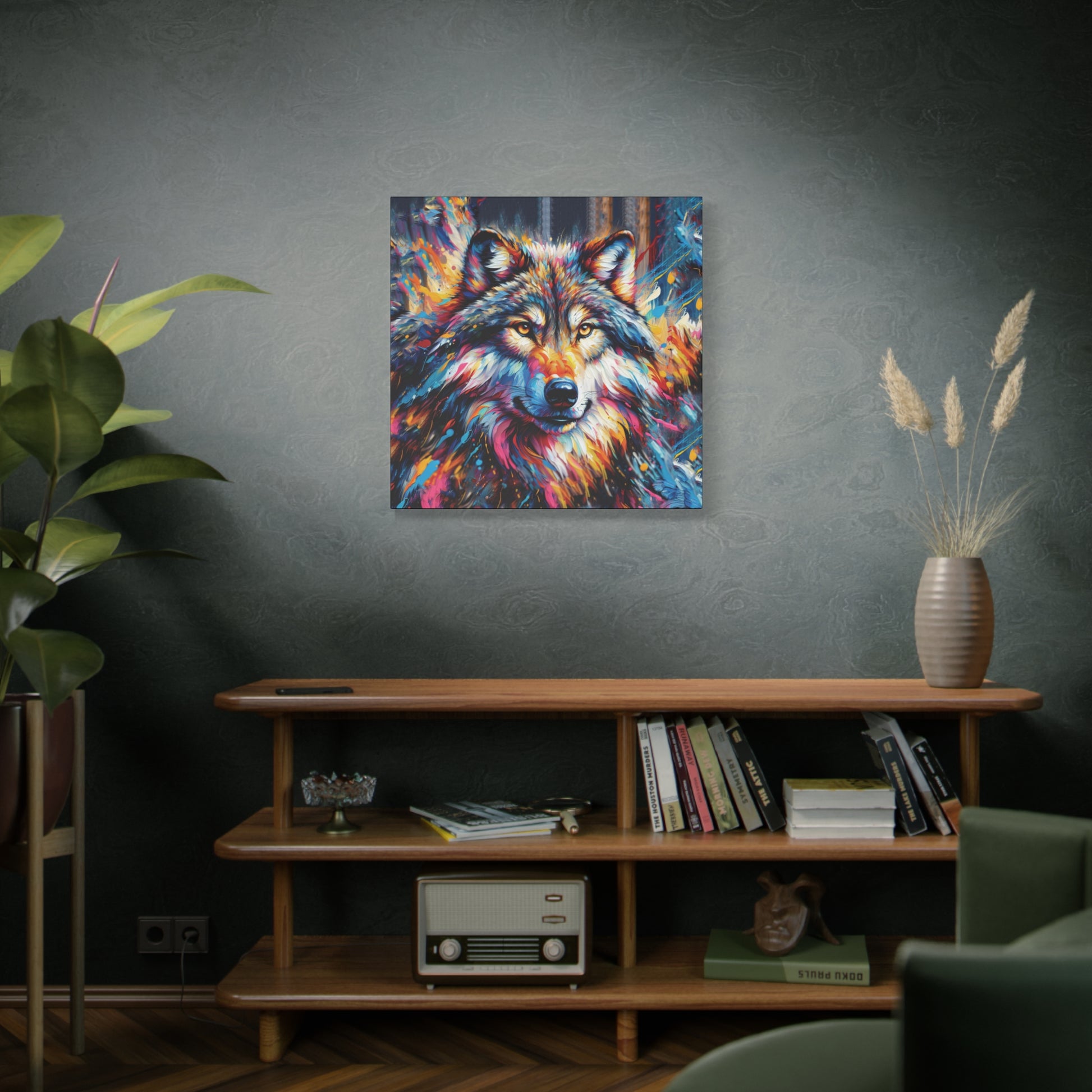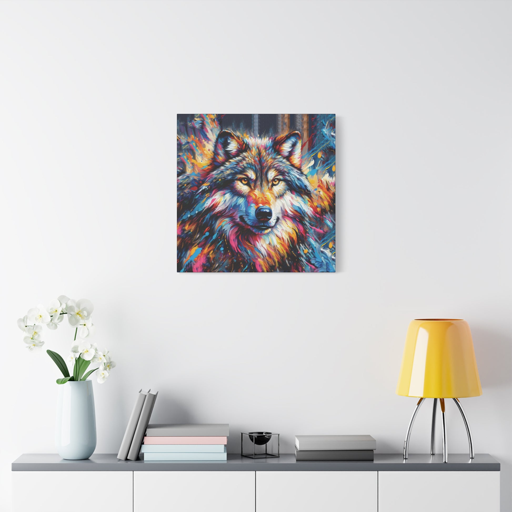 Bold, beautiful, stunning. This colorful portrait of an alpha wolf will add a touch of benevolent strength to any room. Wolf collectors would be ecstatic to receive this as a gift! Ideal for home decor, office spaces, or as a gift for nature enthusiasts.
