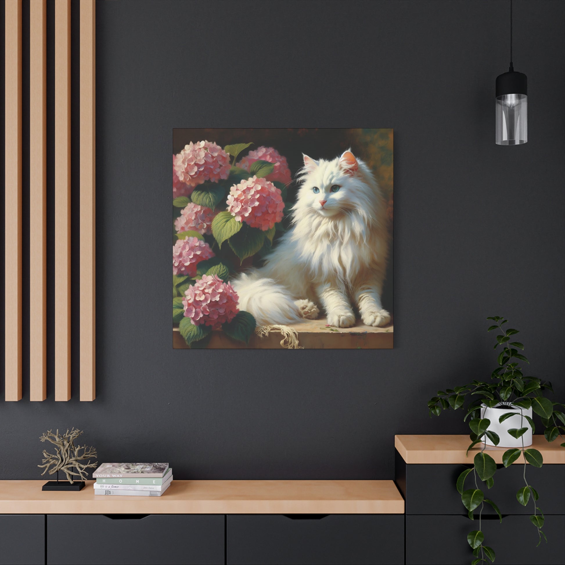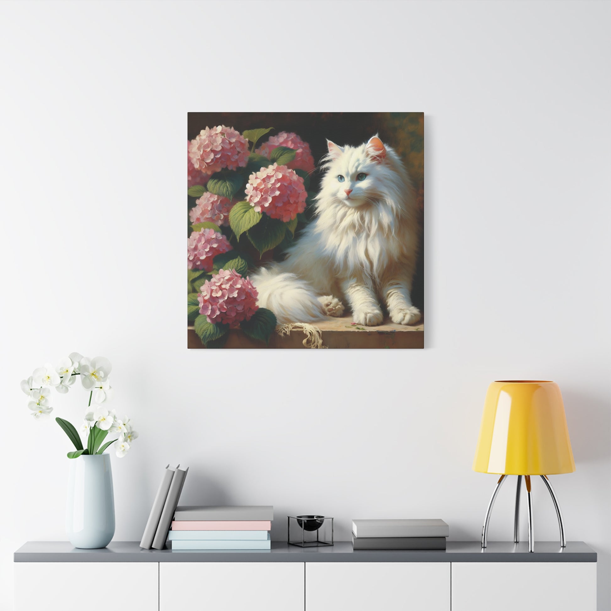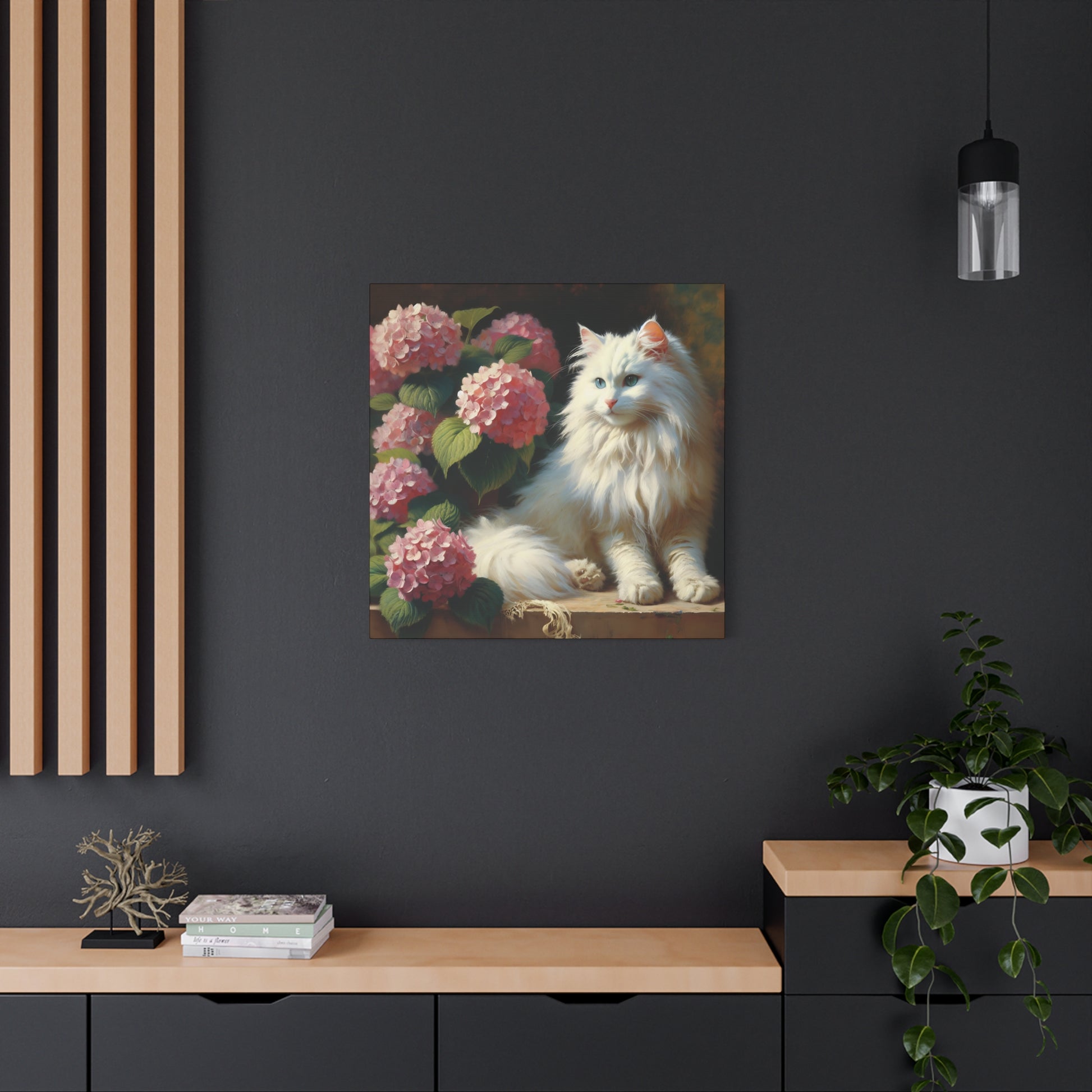 Elevate your home decor with this beautiful Canvas Wall Art featuring a blue-eyed white cat surrounded by pink hydrangeas in an impressionist style square print. This piece gives a cozy and artistic vibe, perfect for cat lovers and art enthusiasts. This canvas print is purrfect for decorating homes, offices, and cat-themed spaces; ideal for occasions like birthdays, holidays, and housewarmings.