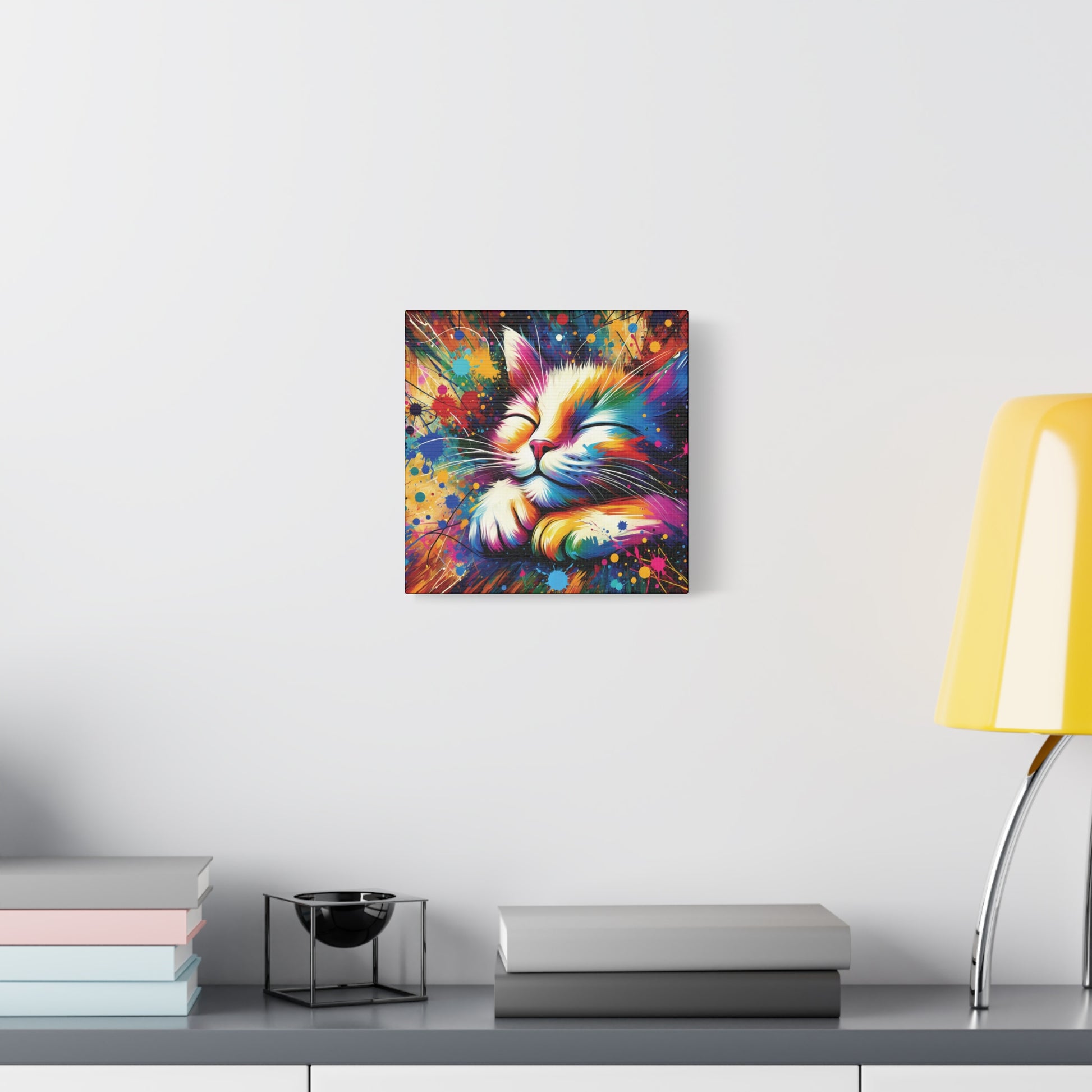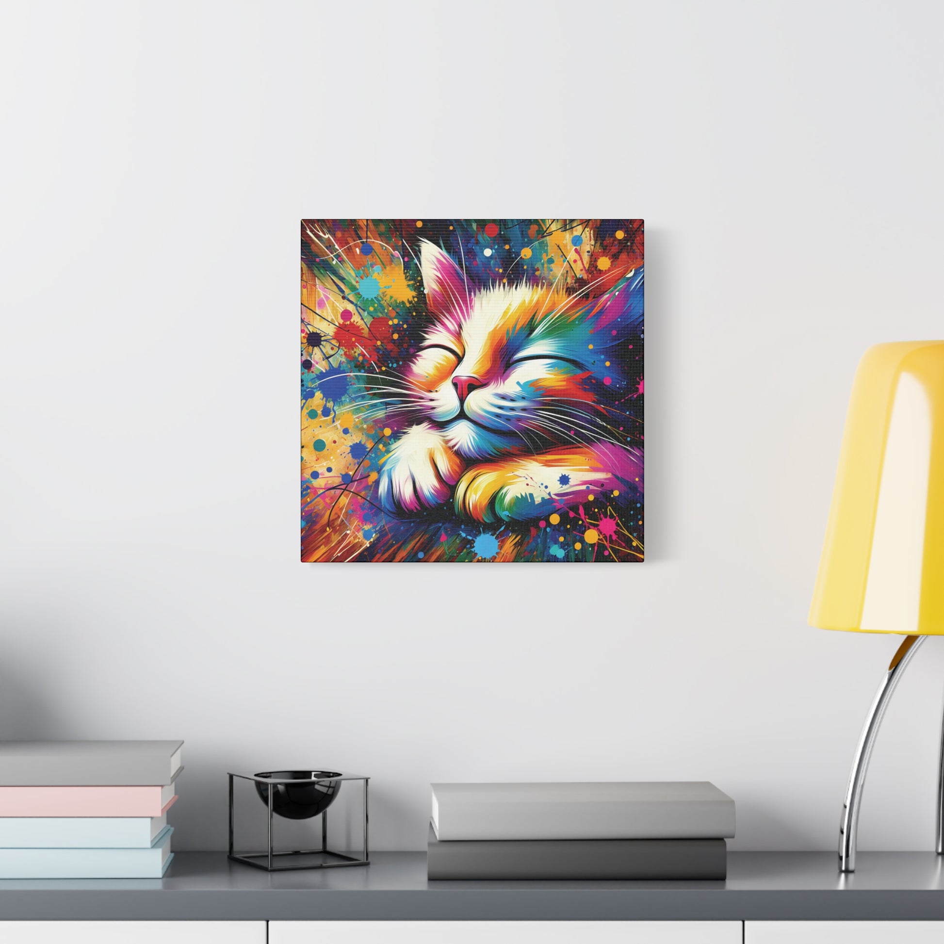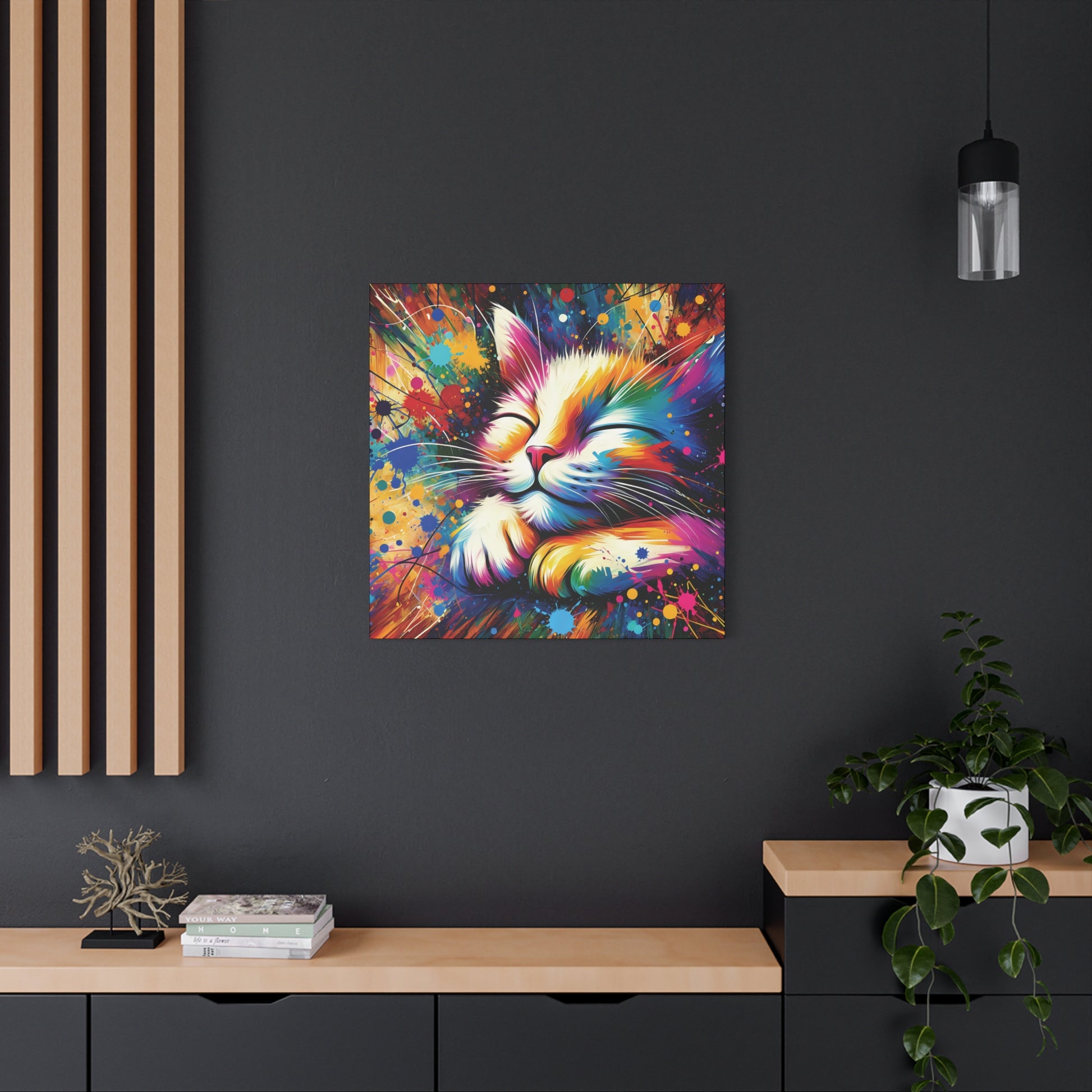 Snuggled and content, this cat is comfortable no matter what is going on around him! Add a touch of whimsy and happiness to your everyday life with this bright and comfortable canvas wall art. Perfect for cat lovers and those looking to add a fun element to their decor. Ideal for gifting on birthdays, housewarmings, or to celebrate a pet. Perfect for Cat Moms and Dads!