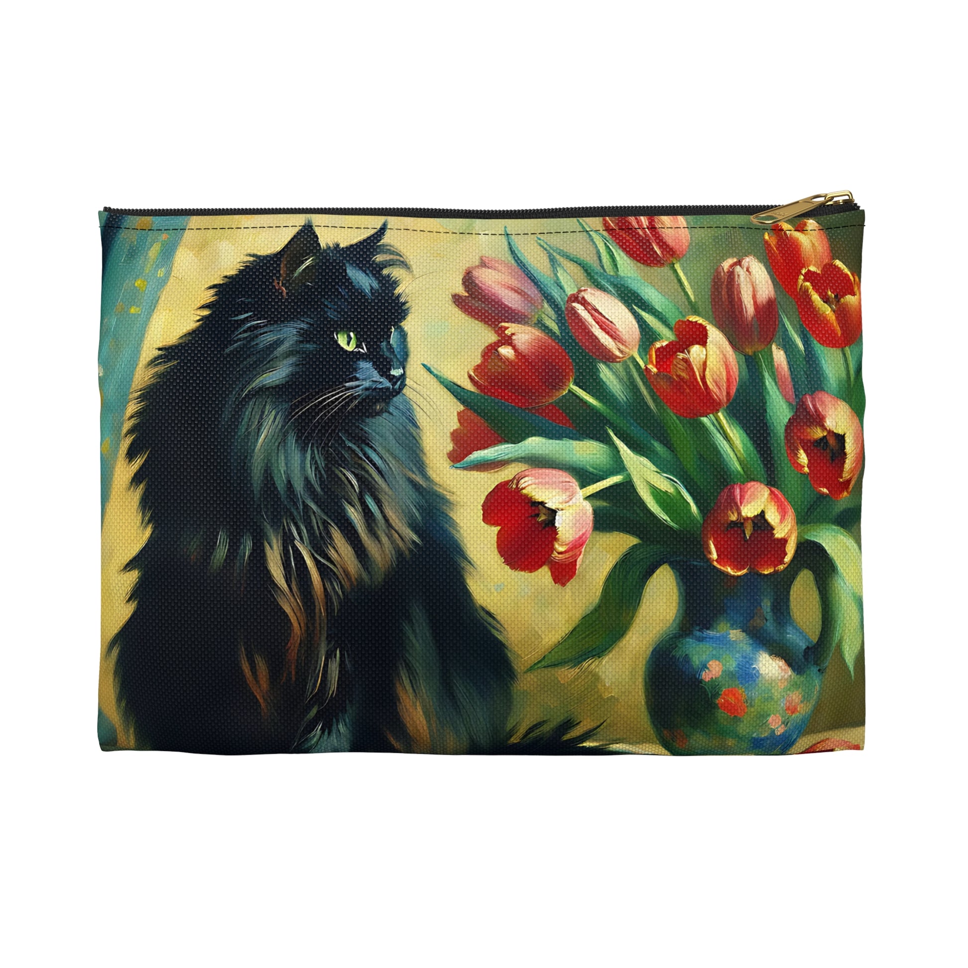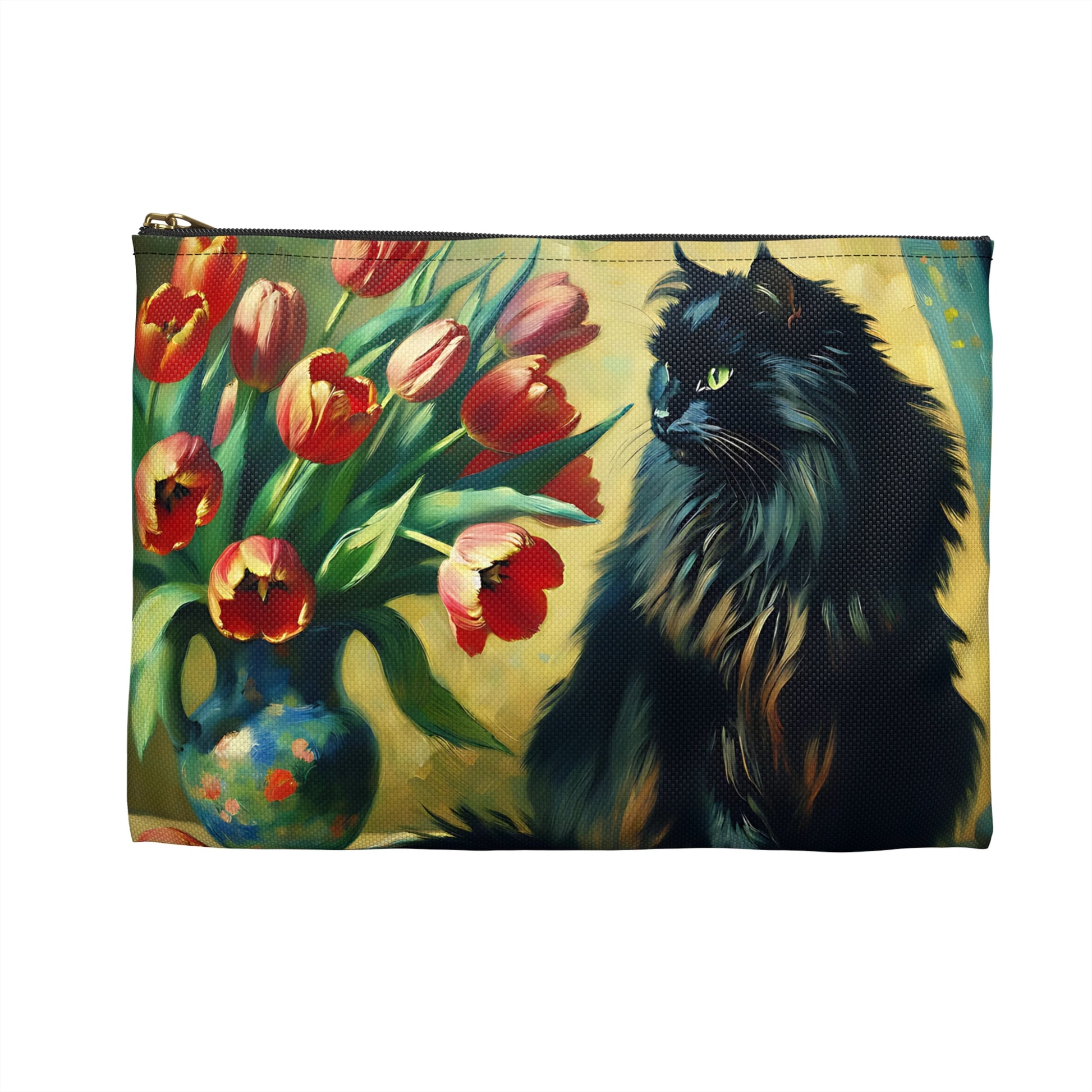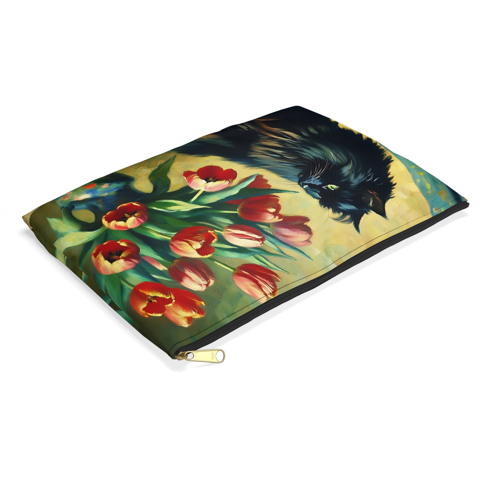 Cat Lover's Accessory Pouch, Artists Black Cat with Red Tulips, Cute Cat Makeup Bag, Pet-Themed Gift, Floral Storage Bag, Cat Mom Essential