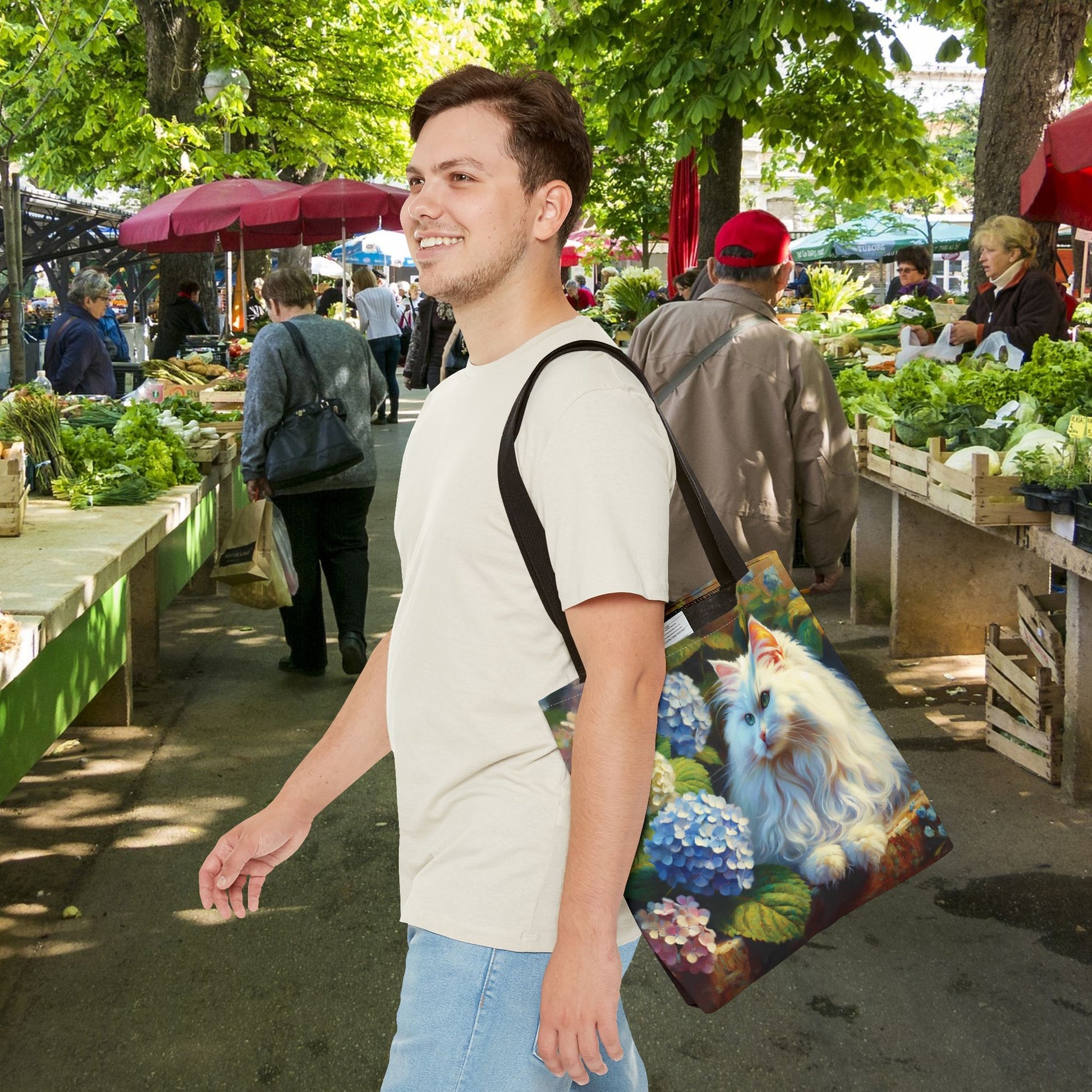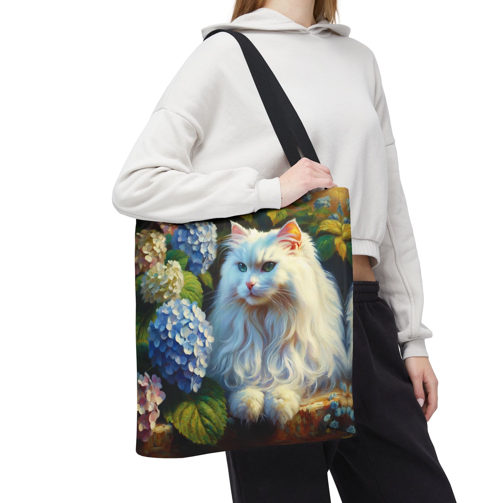 This Cat Tote Bag features Impressionist Style Art of The Artist's White Cat with Hydrangeas, perfect for cat lovers and art enthusiasts. The design gives off a whimsical and artistic vibe, adding a touch of elegance to your everyday errands. Ideal for carrying groceries, books, or any essentials in style. Great for cat-themed holidays, birthdays, or as a thoughtful gift for cat owners.