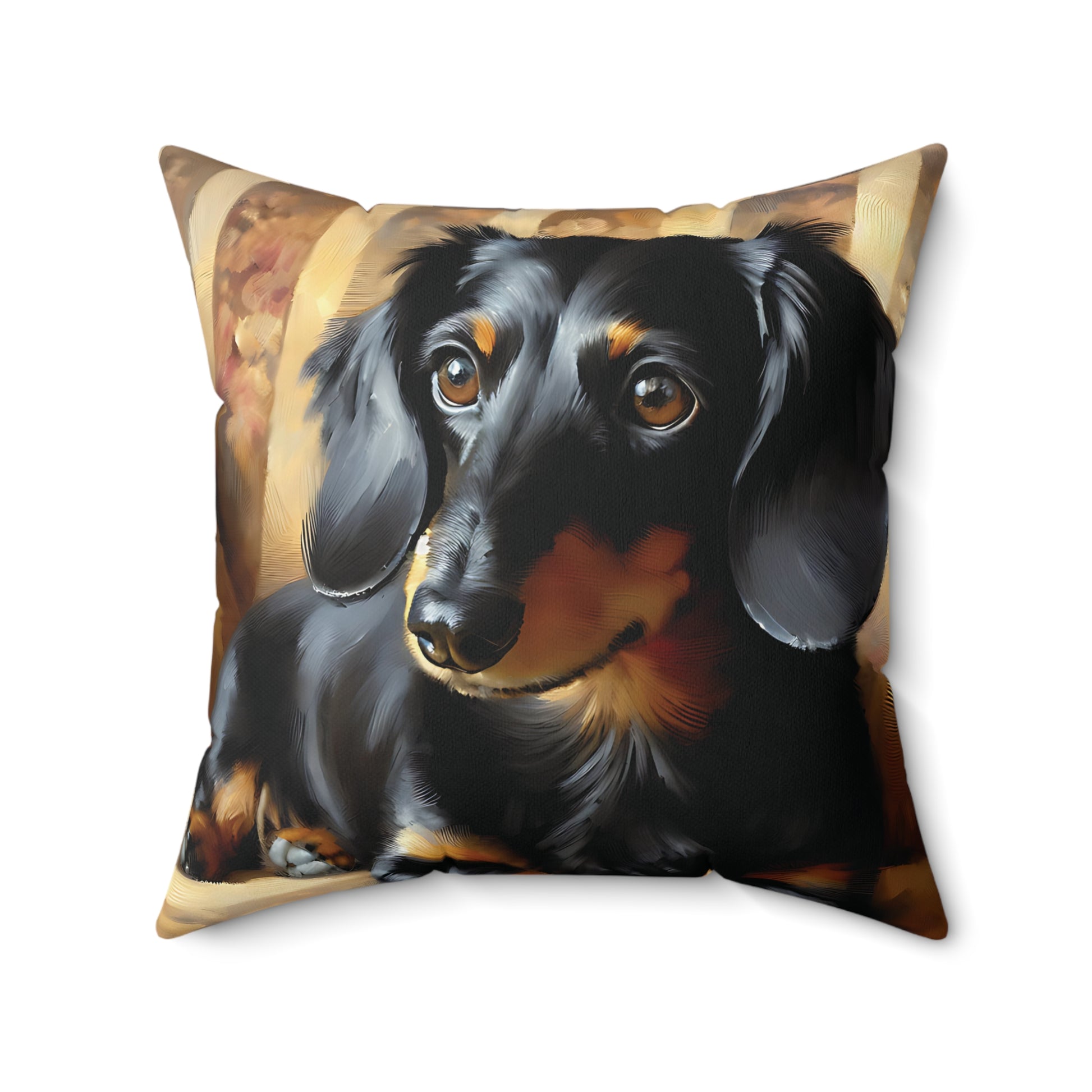 This Dachshund Pillow features a black and tan Dachshund in an impressionist art style on a faux suede square pillow. It adds a cozy and artistic touch to any living space, perfect for dog lovers and art enthusiasts. Ideal for decorating the home during holidays, birthdays, or any special occasion. What Doxie Mom could resist?