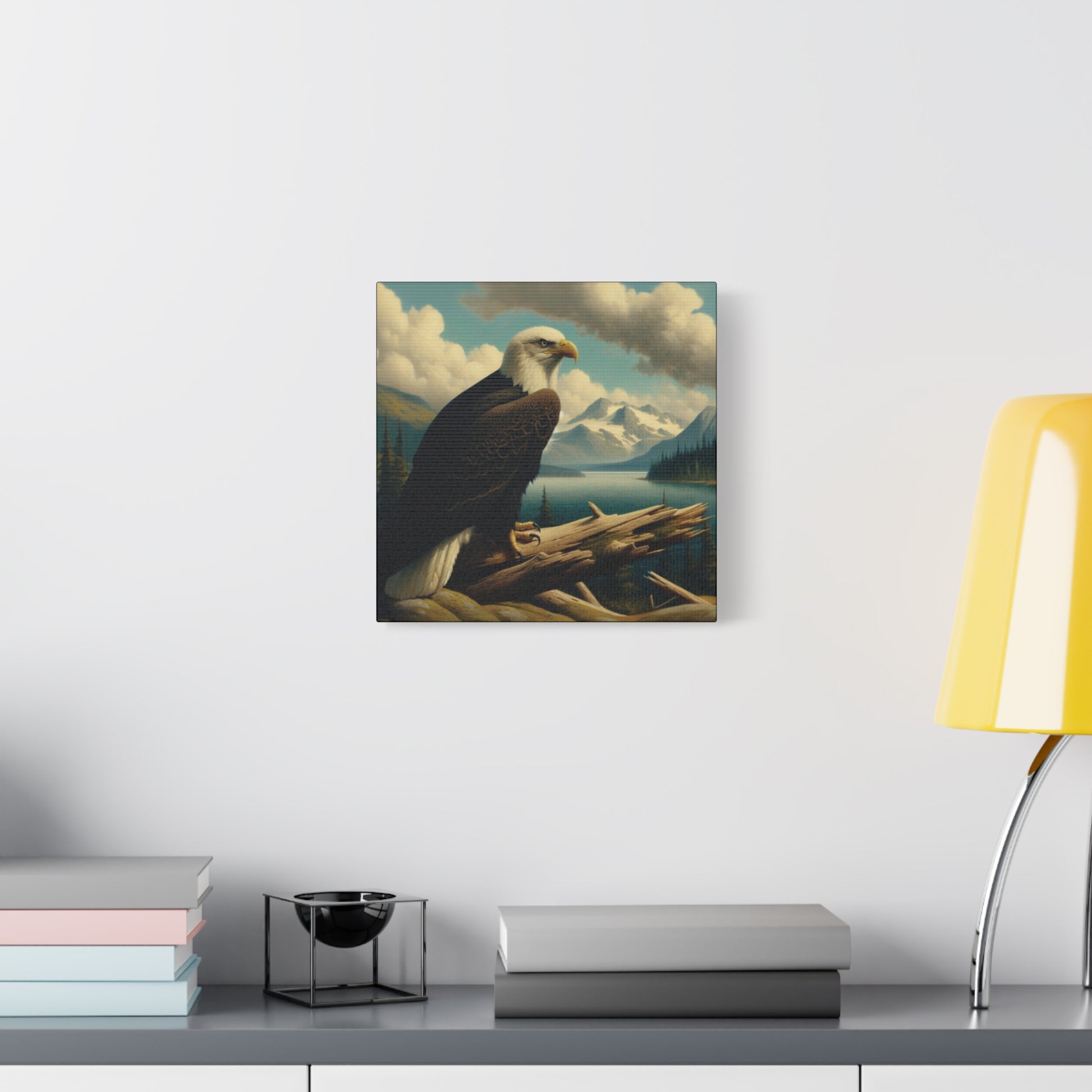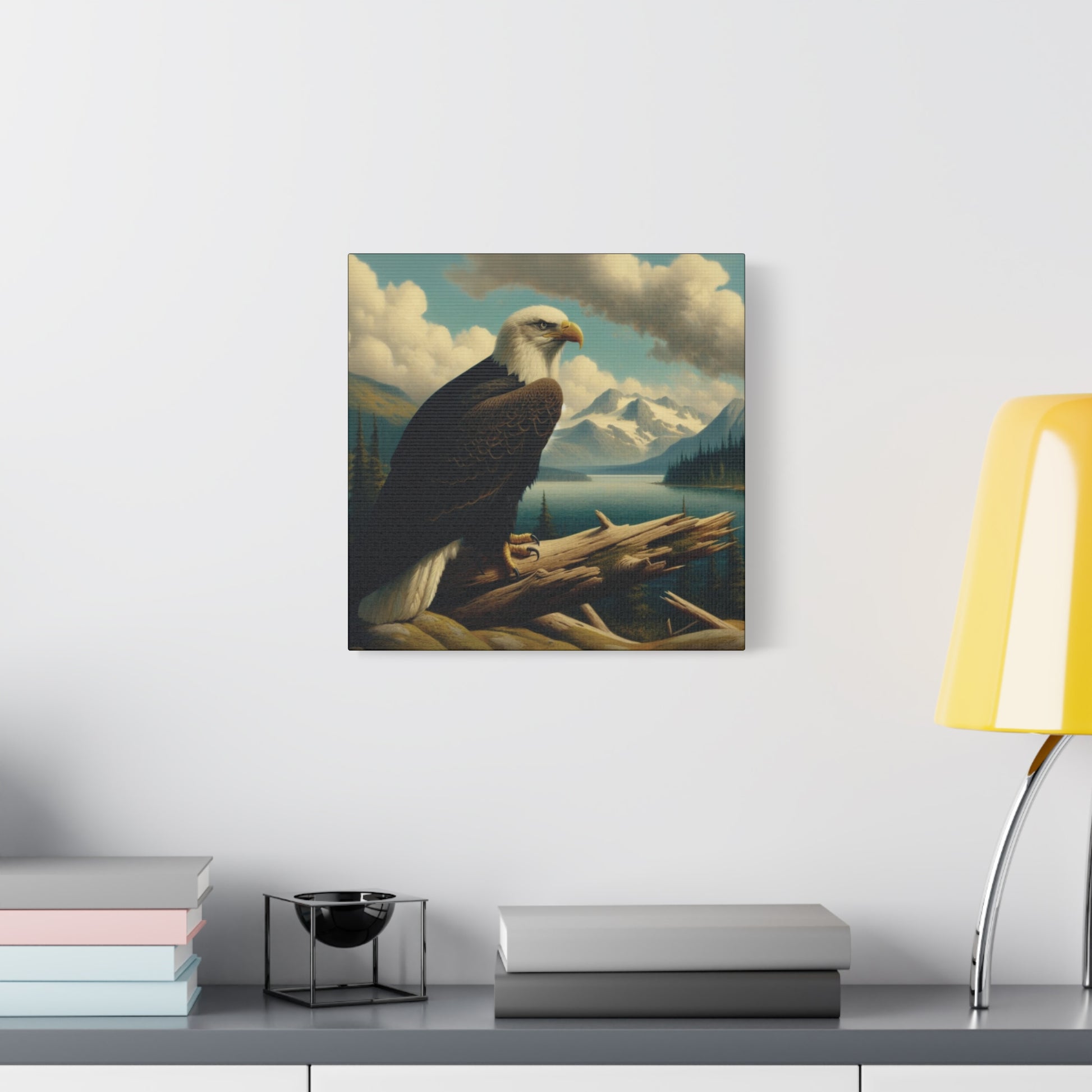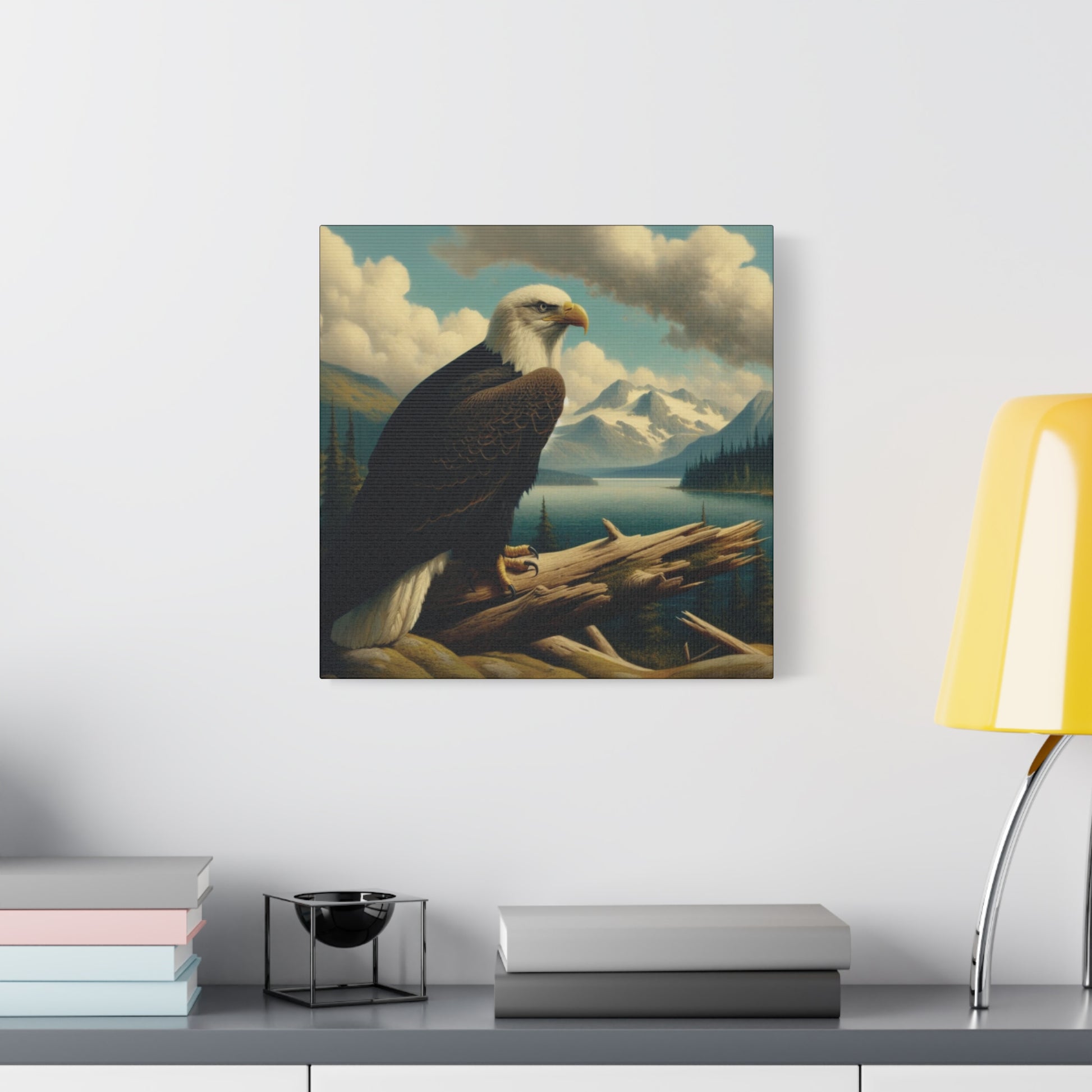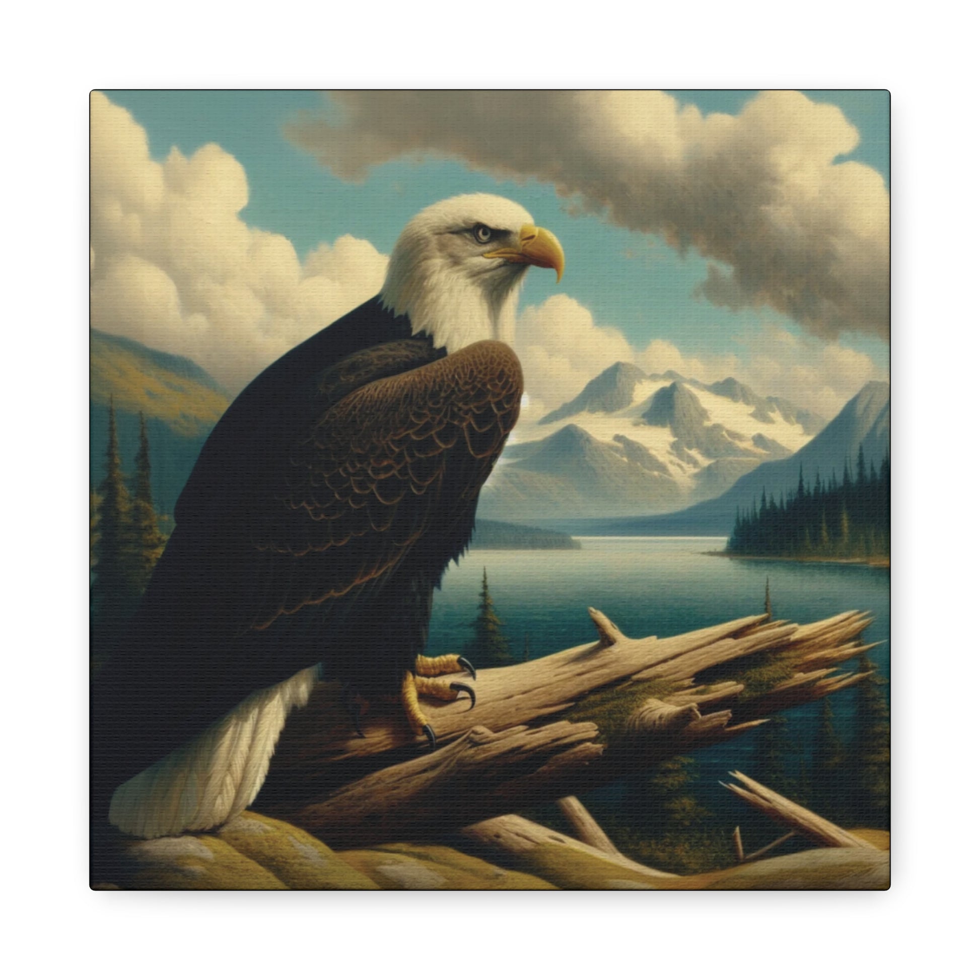 This canvas print features a bald eagle overlooking a serene lake below a snow-topped mountain, evoking a sense of peace and nature's beauty. Perfect for nature lovers and fans of Hudson River School style paintings. Ideal for home decor, cabin getaways, and wilderness-themed spaces. Great for gifting on birthdays, holidays, and housewarmings.