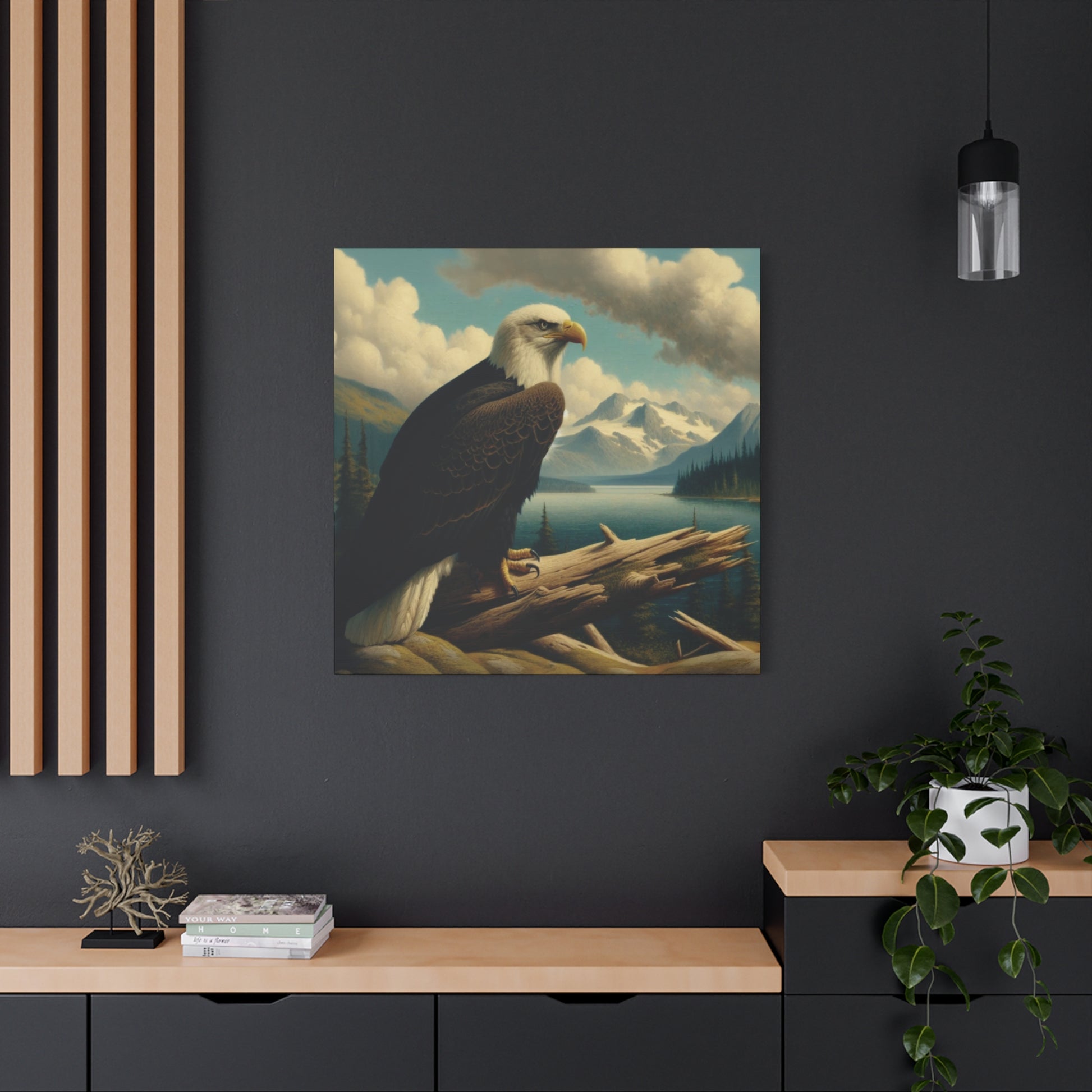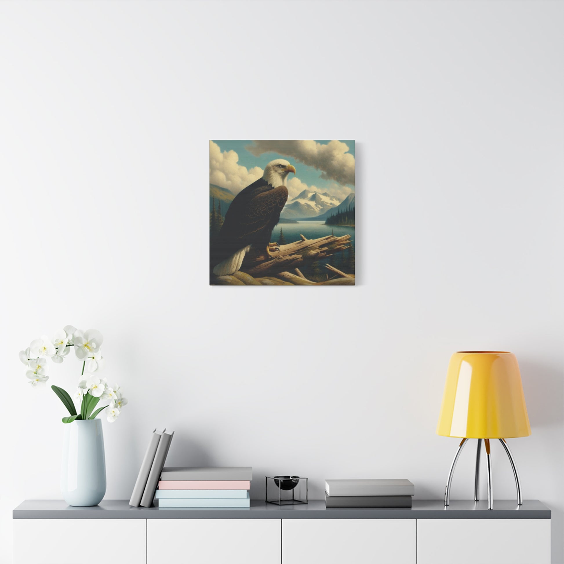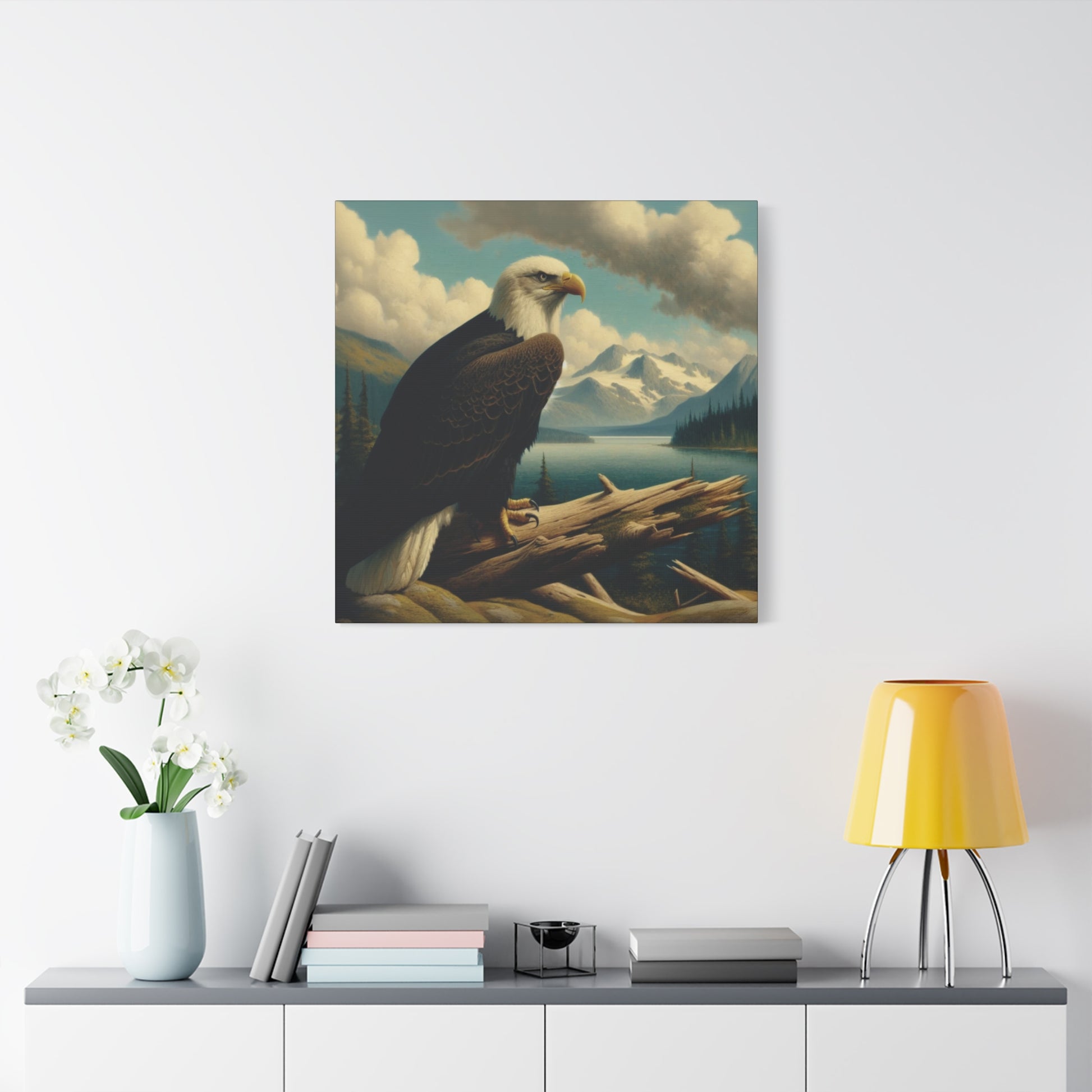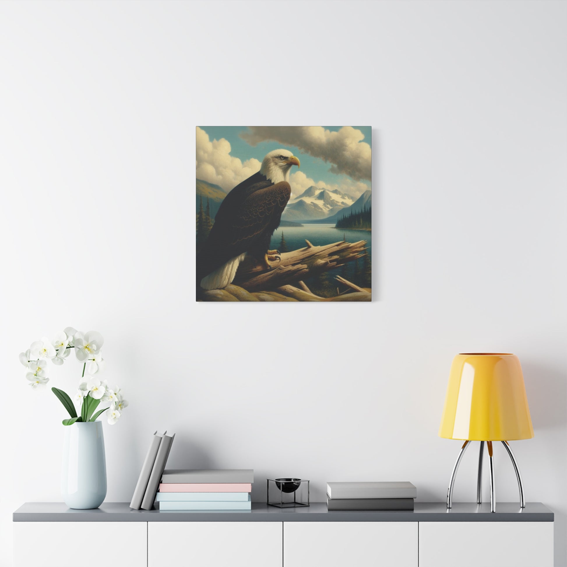 This canvas print features a bald eagle overlooking a serene lake below a snow-topped mountain, evoking a sense of peace and nature's beauty. Perfect for nature lovers and fans of Hudson River School style paintings. Ideal for home decor, cabin getaways, and wilderness-themed spaces. Great for gifting on birthdays, holidays, and housewarmings.