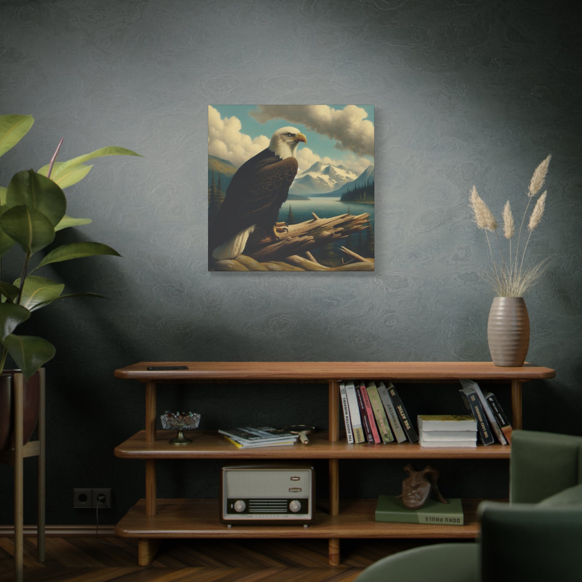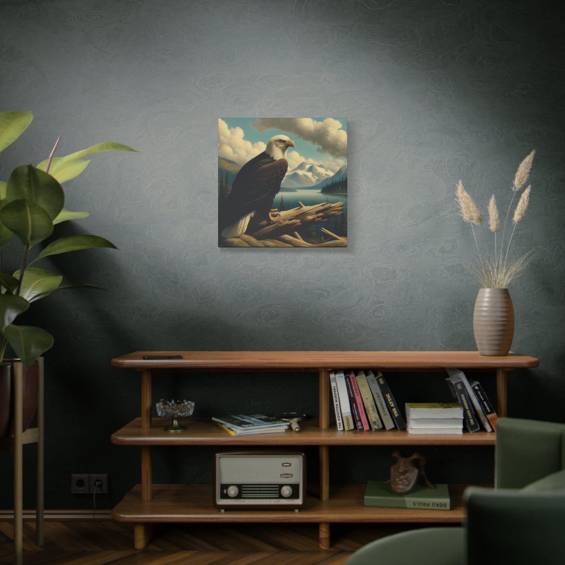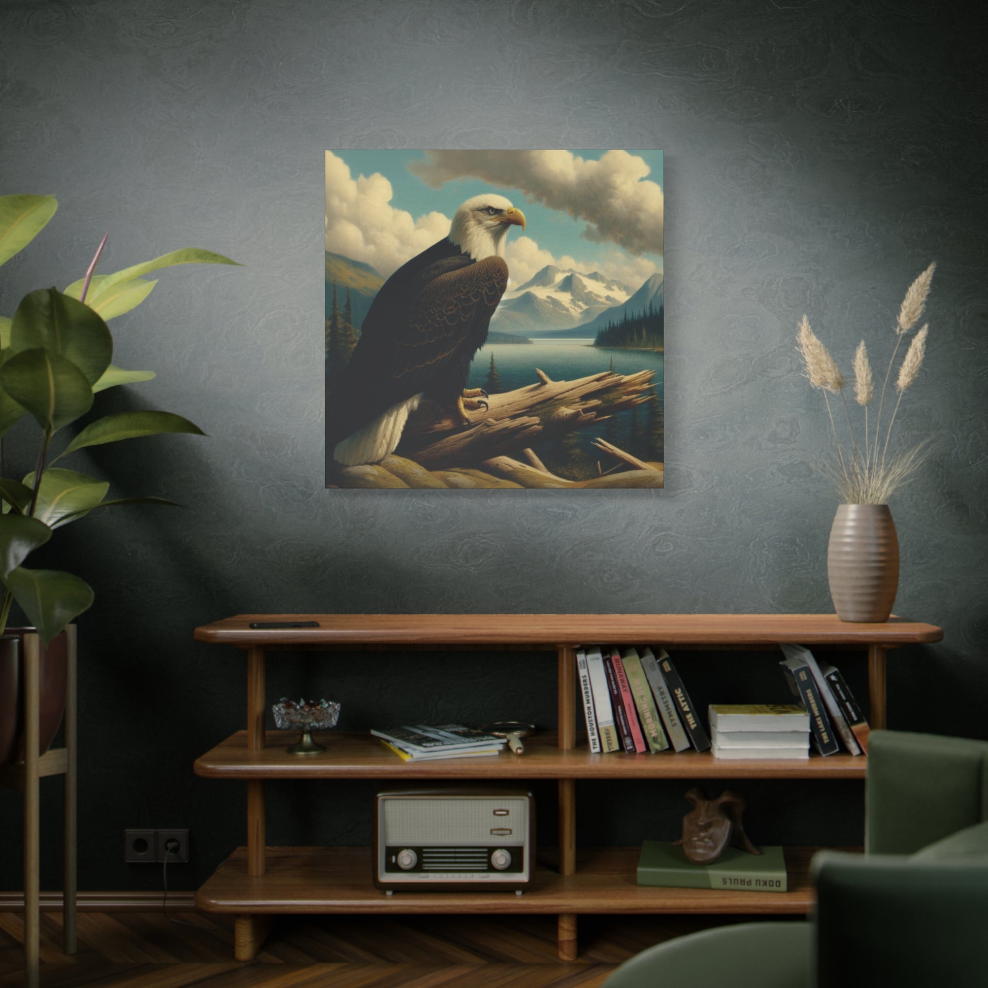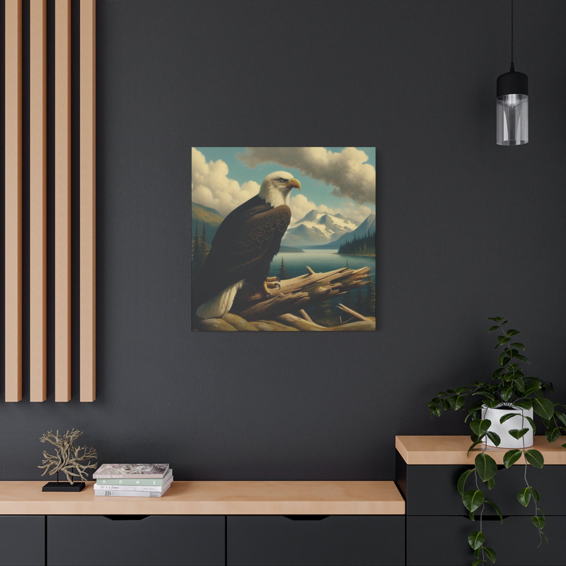 This canvas print features a bald eagle overlooking a serene lake below a snow-topped mountain, evoking a sense of peace and nature's beauty. Perfect for nature lovers and fans of Hudson River School style paintings. Ideal for home decor, cabin getaways, and wilderness-themed spaces. Great for gifting on birthdays, holidays, and housewarmings.