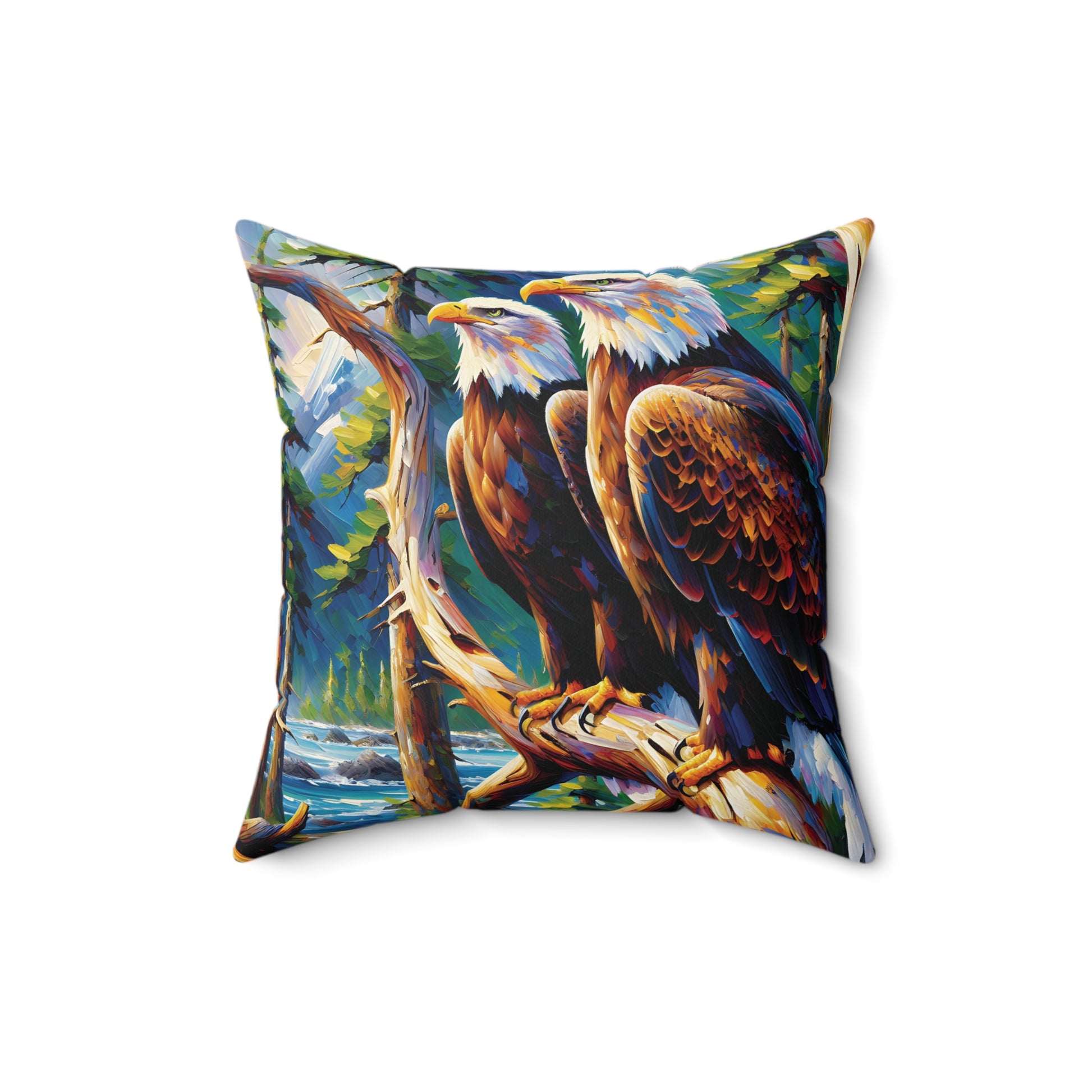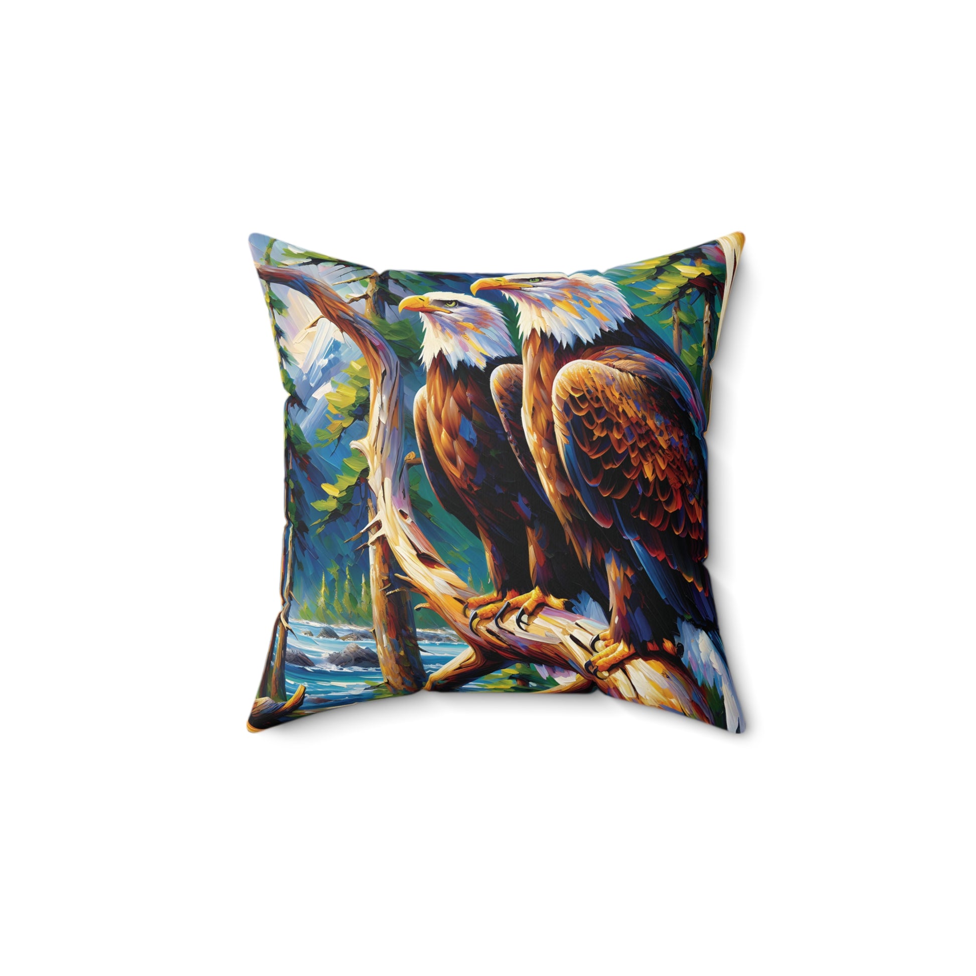 This Eagle Throw Pillow features a pair of bald eagles beside a gently flowing river.   The impressionist style art enhances the beauty and majesty of nature, and adds a touch of regal elegance to any room while giving off a peaceful and calming vibe. Perfect for nature lovers, bird enthusiasts, and those who appreciate wildlife art. Ideal for adding a cozy decorative element to your living room, bedroom, or reading nook. Great for celebrating nature, wildlife, and conservation.