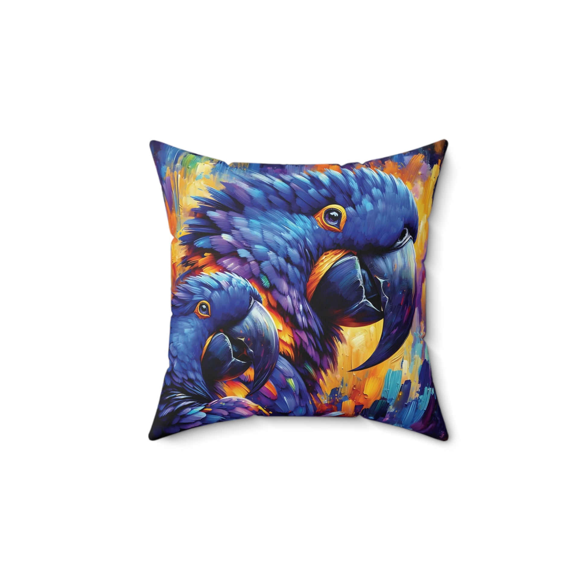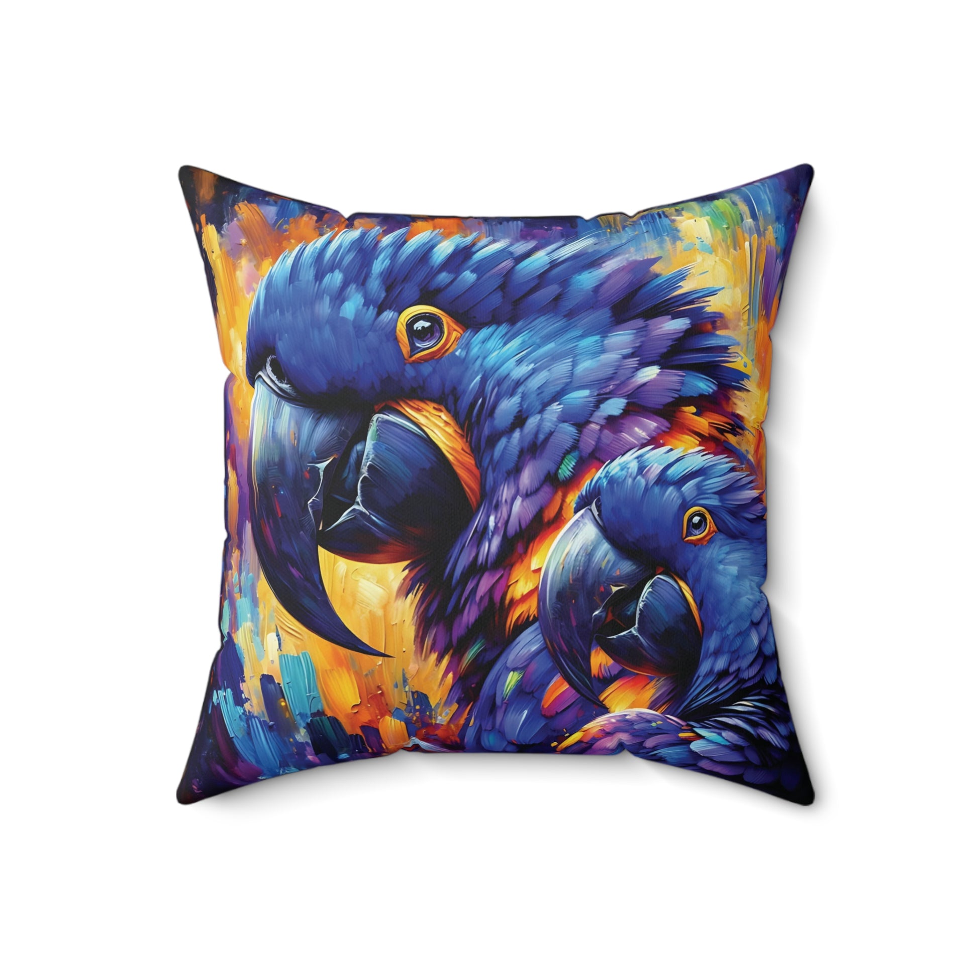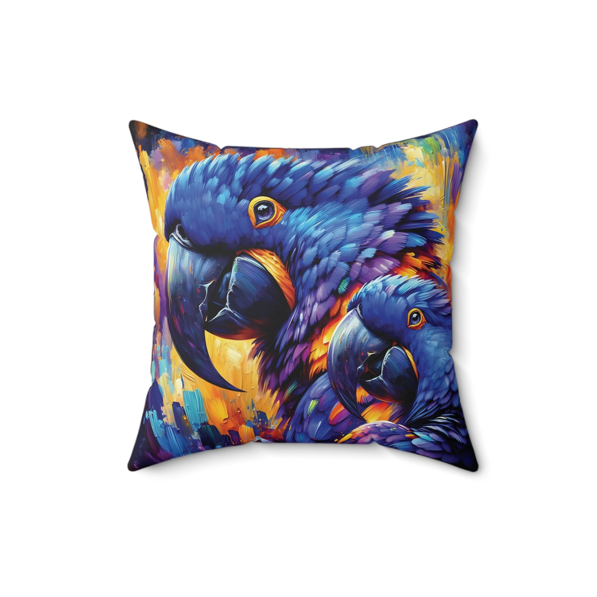 Our Faux Suede Throw Pillow in Expressionist Style Art features a beautiful pair of Hyacinth Macaws, perfect for nature lovers and those who appreciate artistic decor. Adds a cozy and inviting touch to any living space. Ideal for wildlife enthusiasts or those who enjoy outdoor themes. Great for adding a festive touch to a room throughout the year.