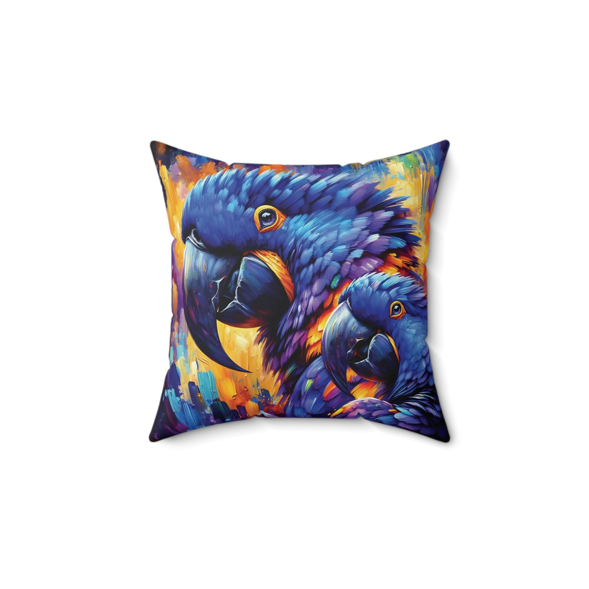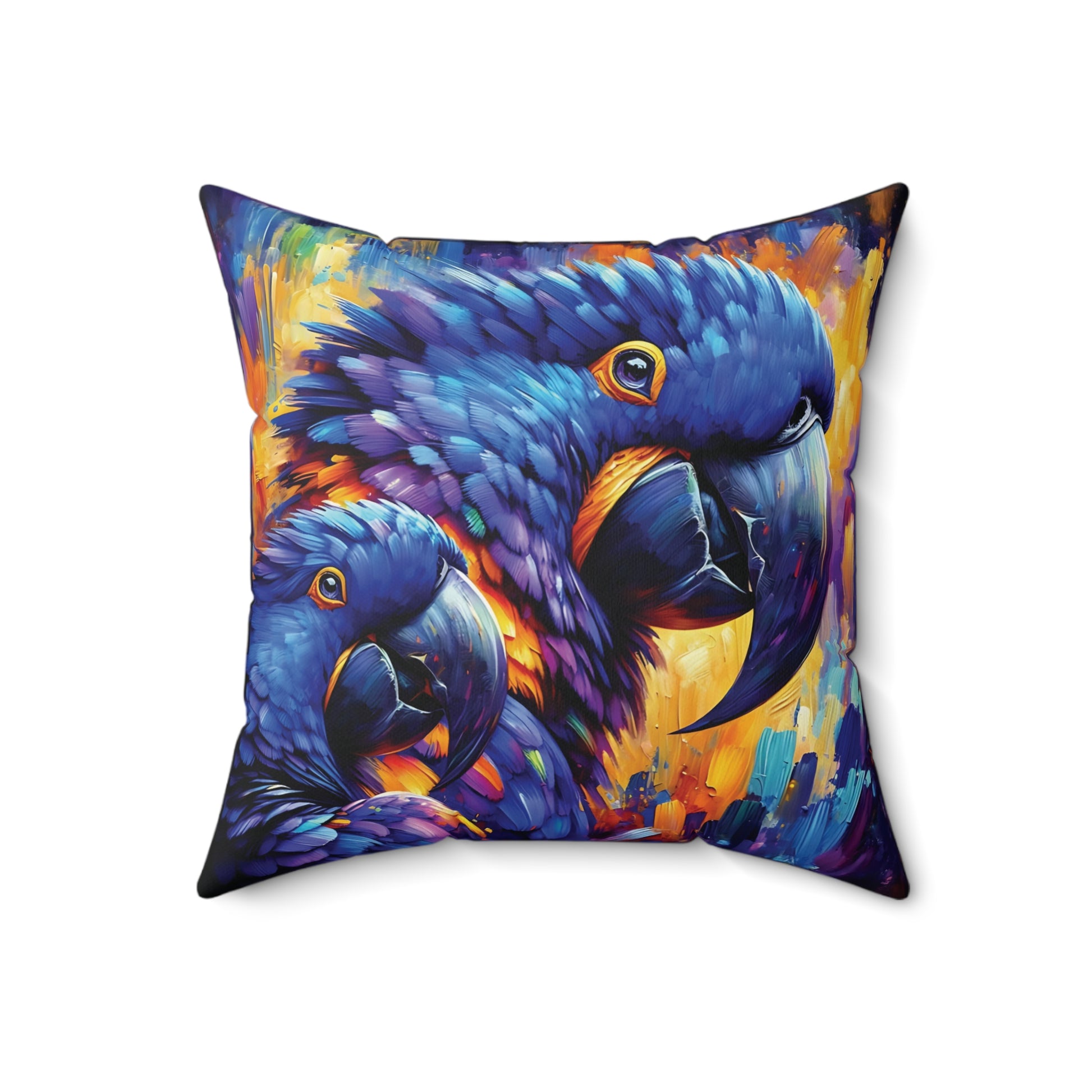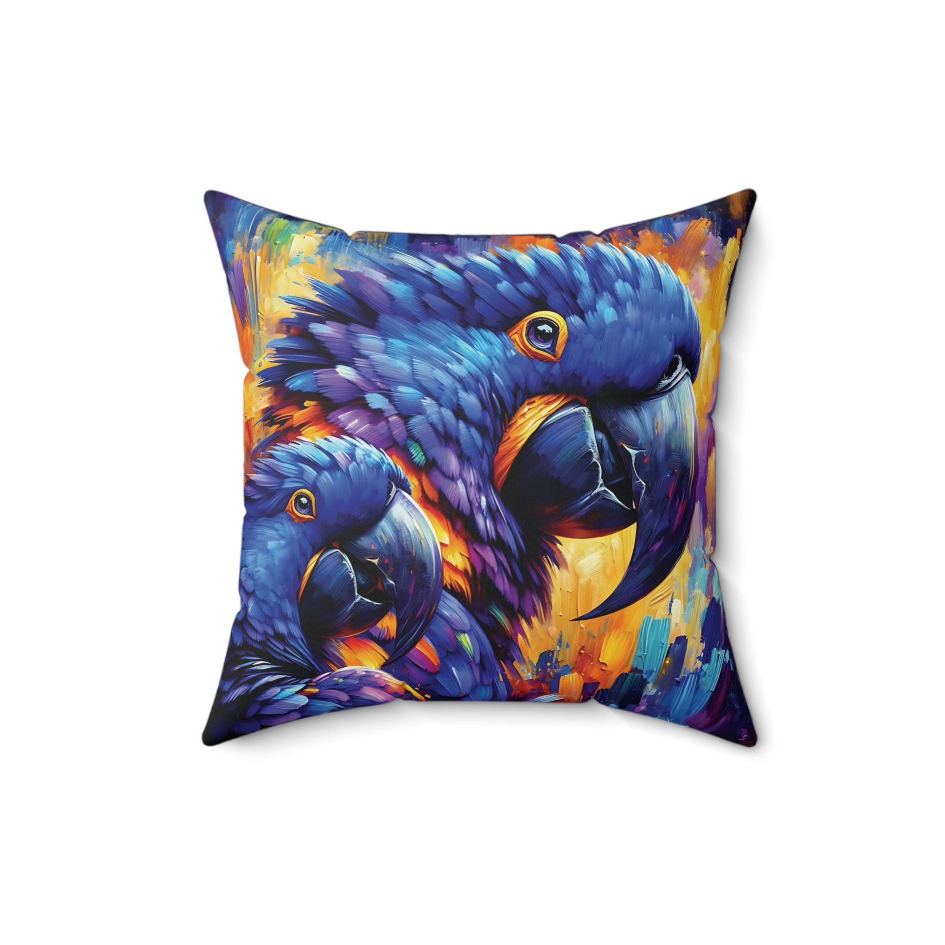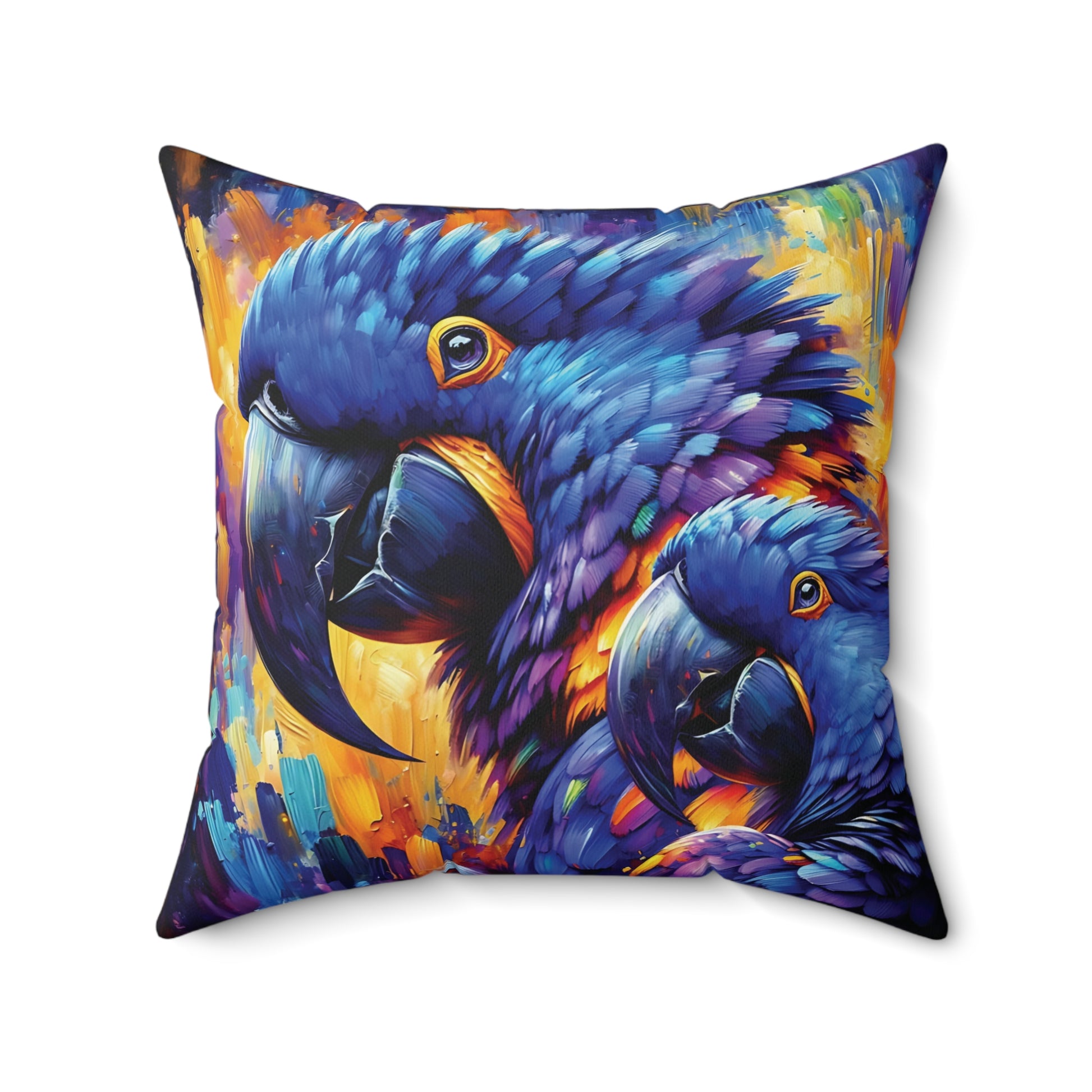 Our Faux Suede Throw Pillow in Expressionist Style Art features a beautiful pair of Hyacinth Macaws, perfect for nature lovers and those who appreciate artistic decor. Adds a cozy and inviting touch to any living space. Ideal for wildlife enthusiasts or those who enjoy outdoor themes. Great for adding a festive touch to a room throughout the year.