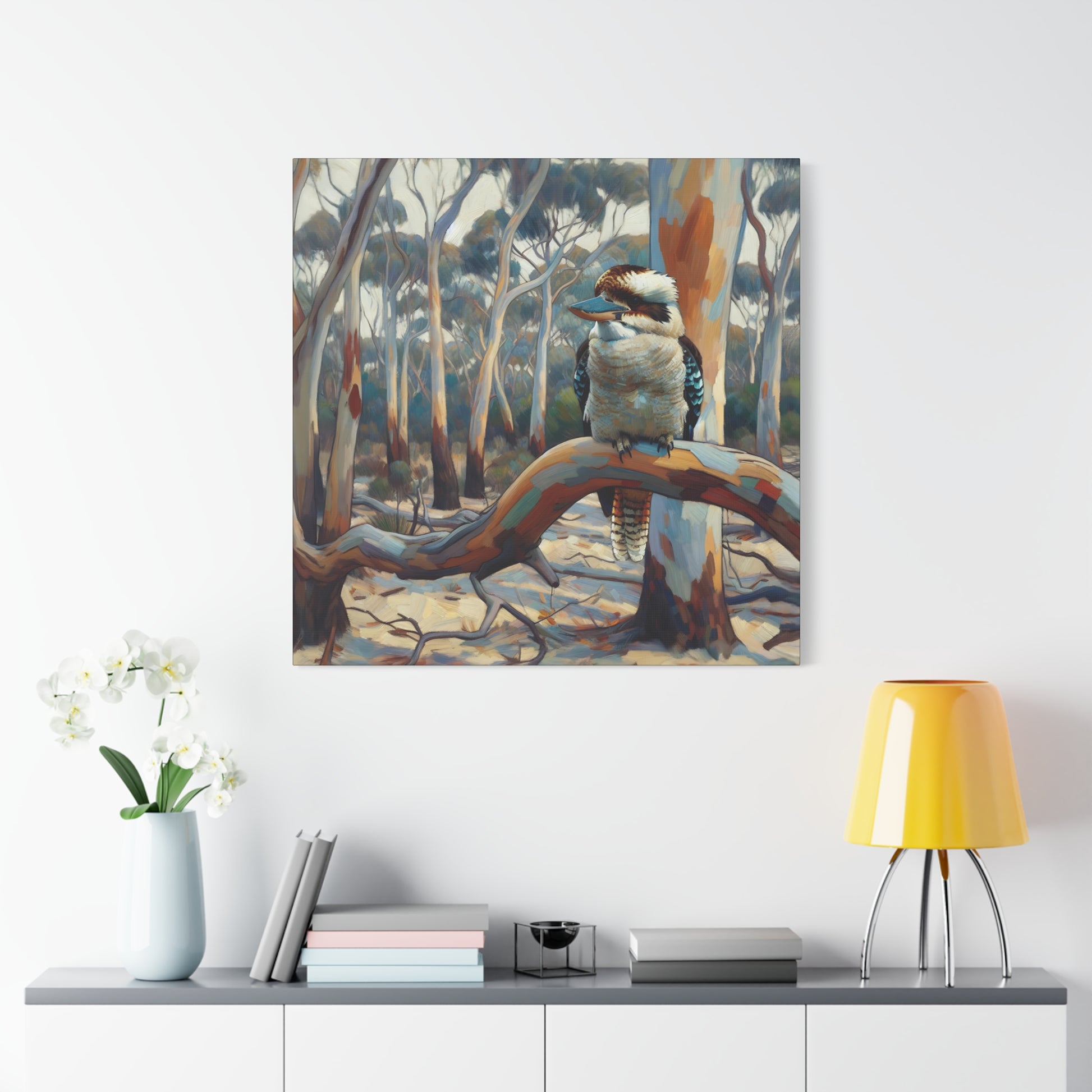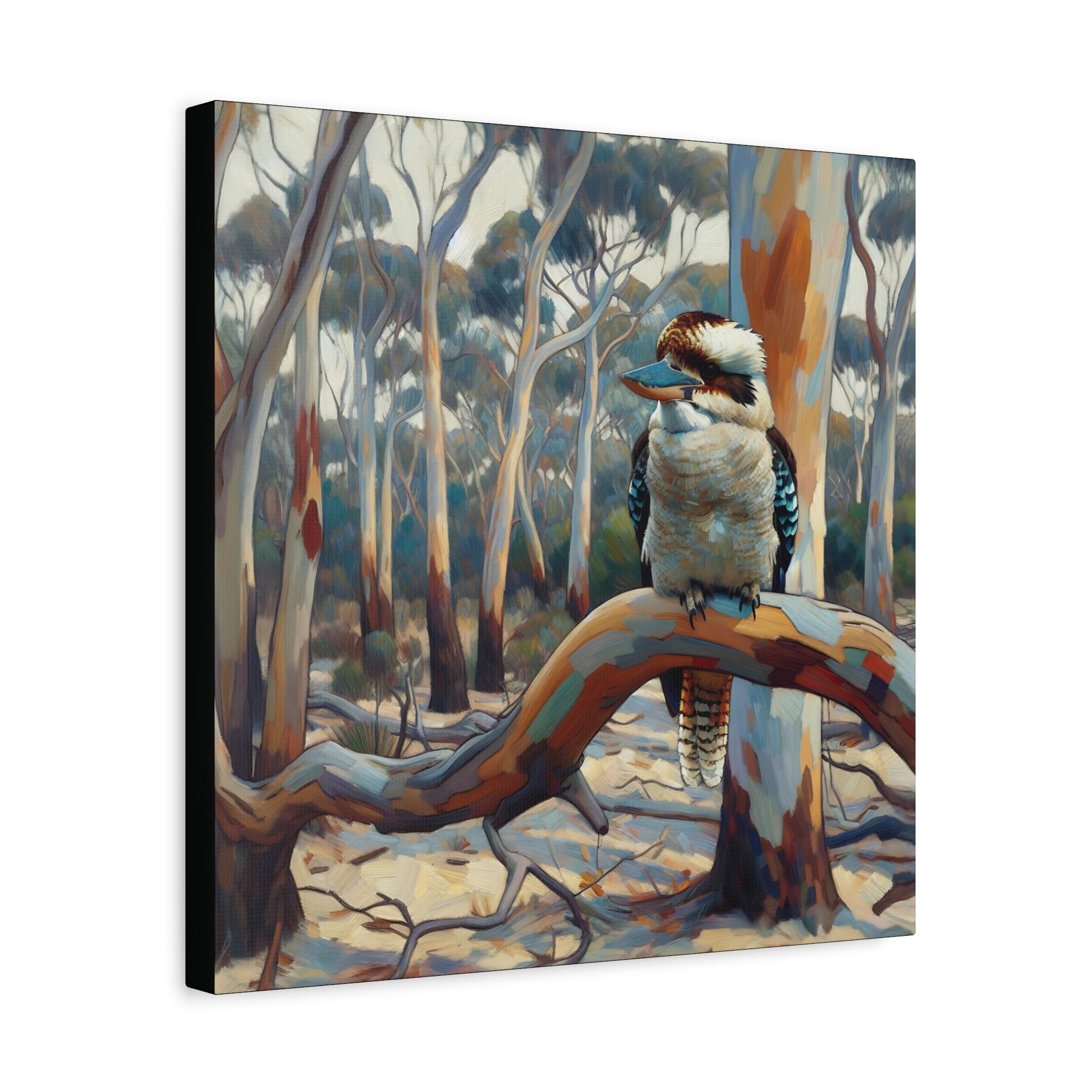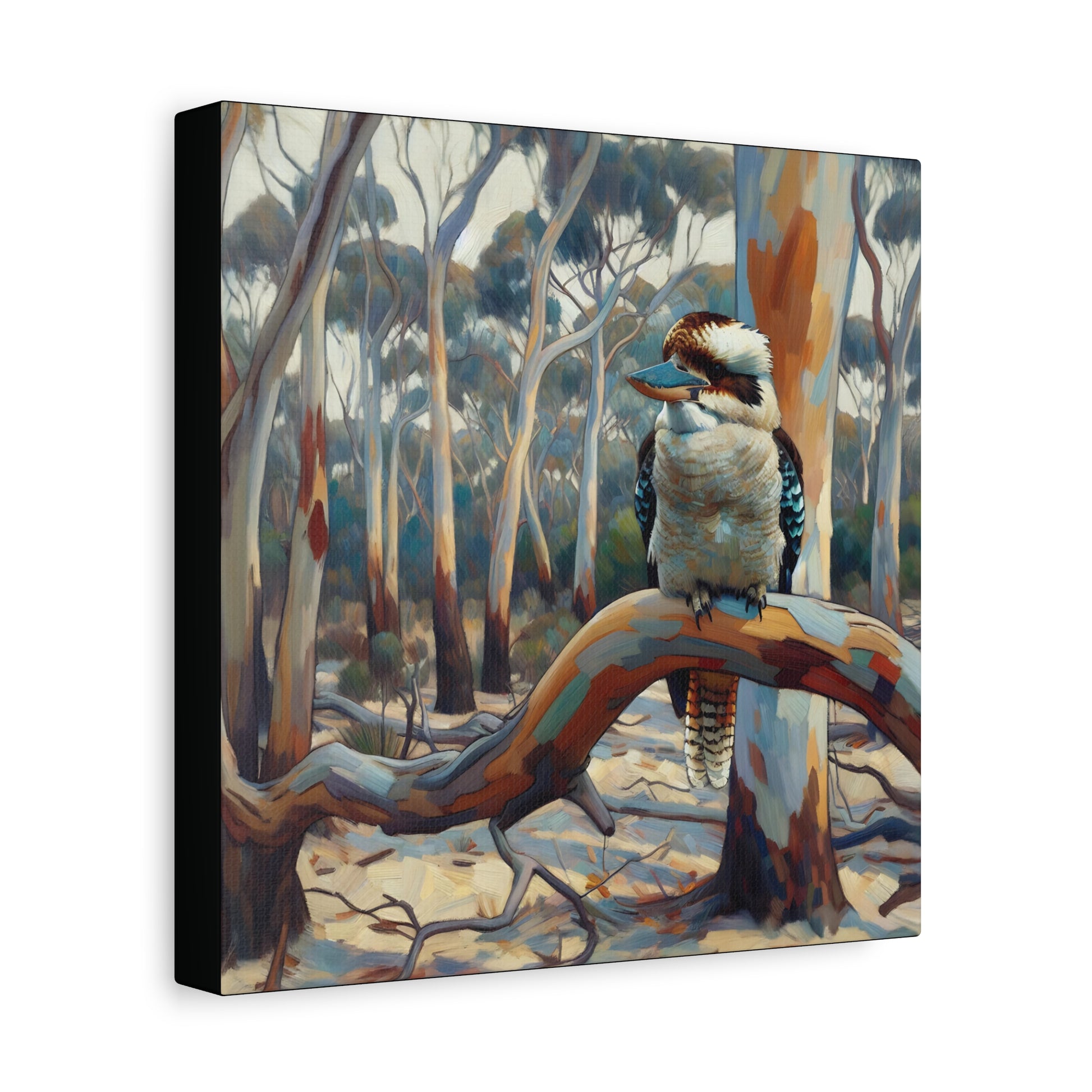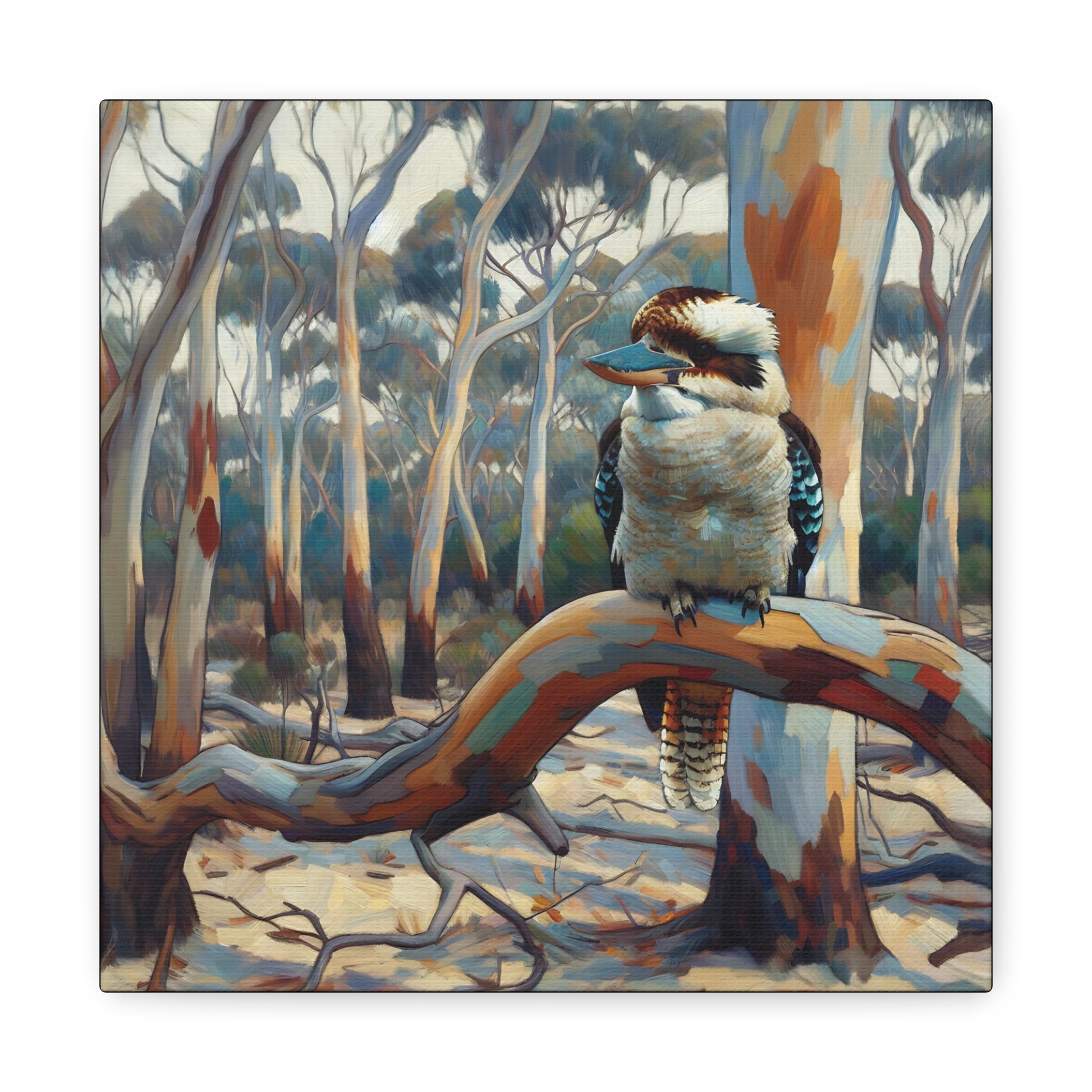 Bring the charm of the Australian outback into your home with this Kookaburra Sitting in a Gum Tree canvas print. The post impressionist style art adds a touch of whimsy to any space, perfect for nature lovers and art enthusiasts. Ideal for decorating living rooms, bedrooms, or home offices. Great gift for bird lovers, art collectors, and celebrating Australia Day.