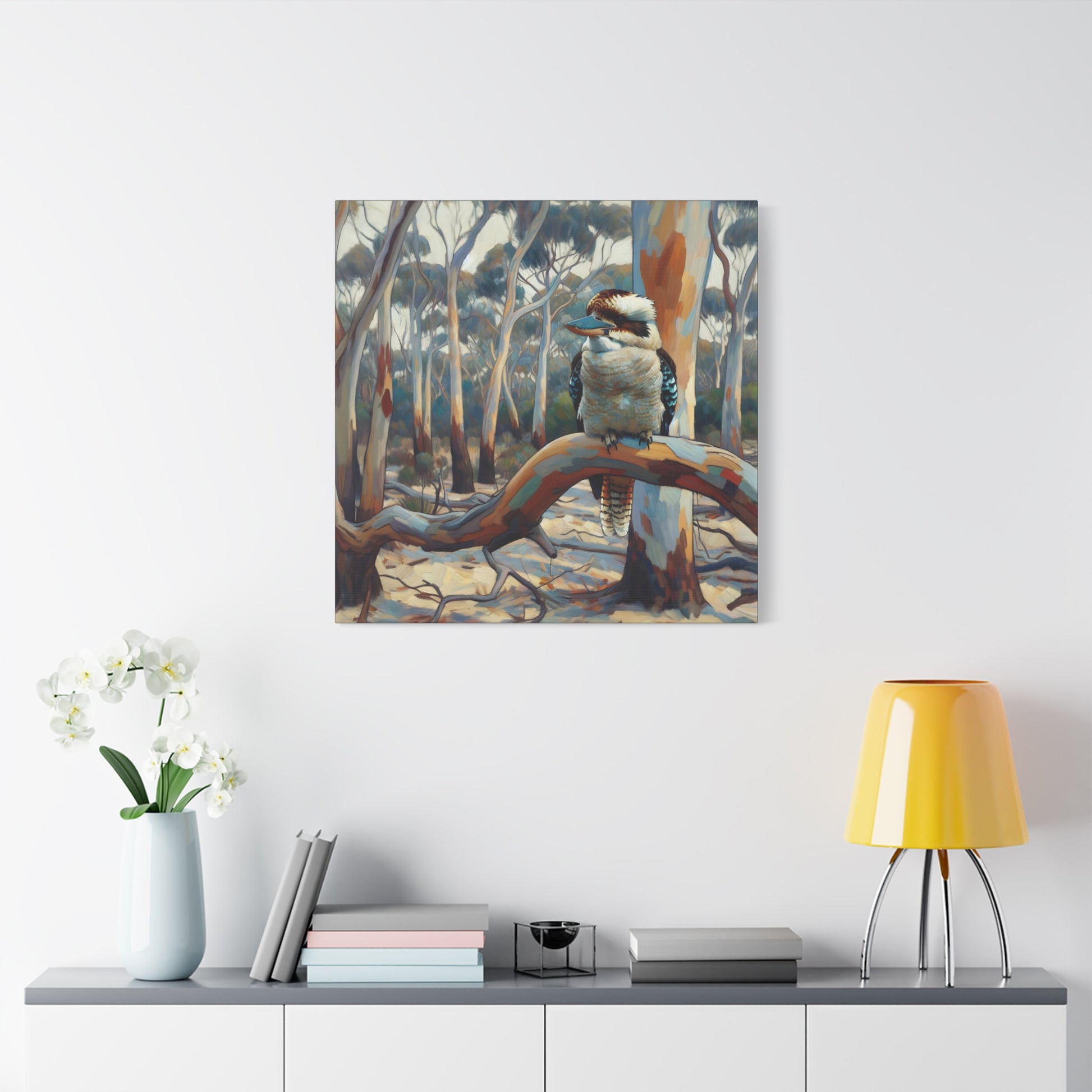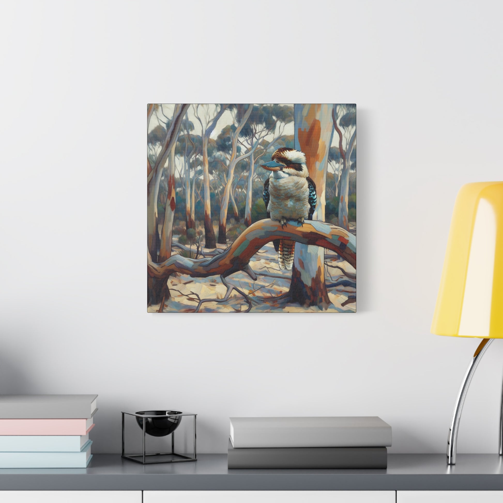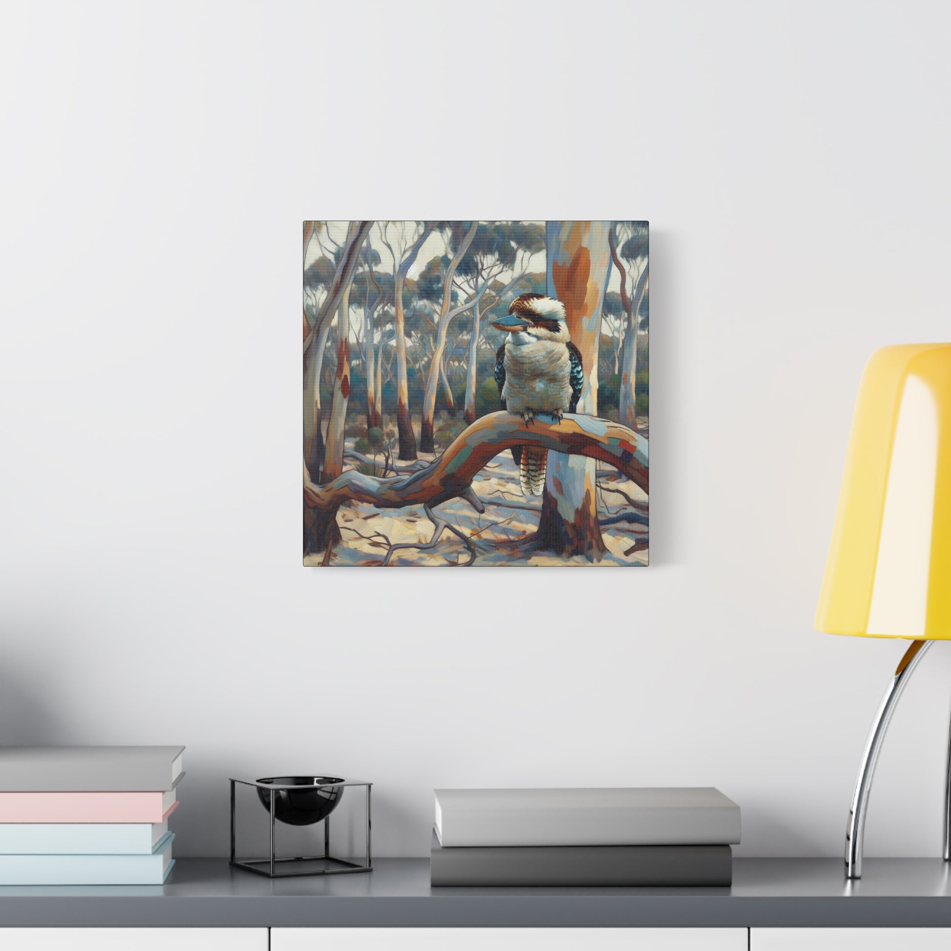 Bring the charm of the Australian outback into your home with this Kookaburra Sitting in a Gum Tree canvas print. The post impressionist style art adds a touch of whimsy to any space, perfect for nature lovers and art enthusiasts. Ideal for decorating living rooms, bedrooms, or home offices. Great gift for bird lovers, art collectors, and celebrating Australia Day.