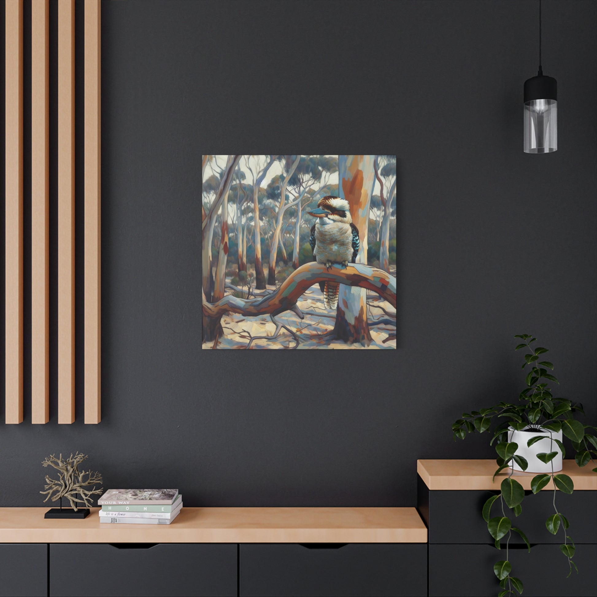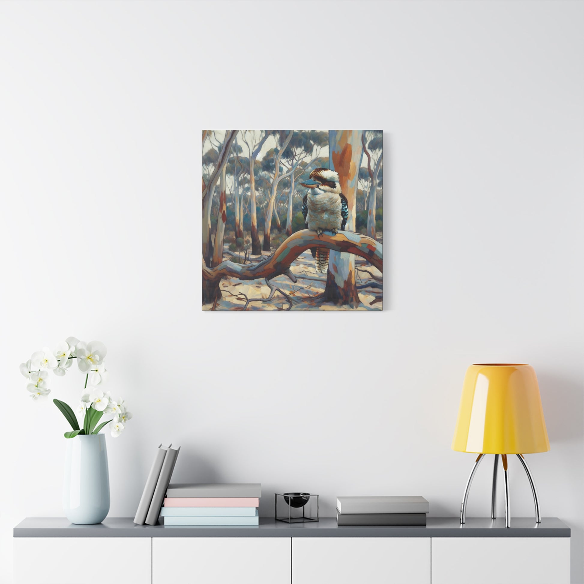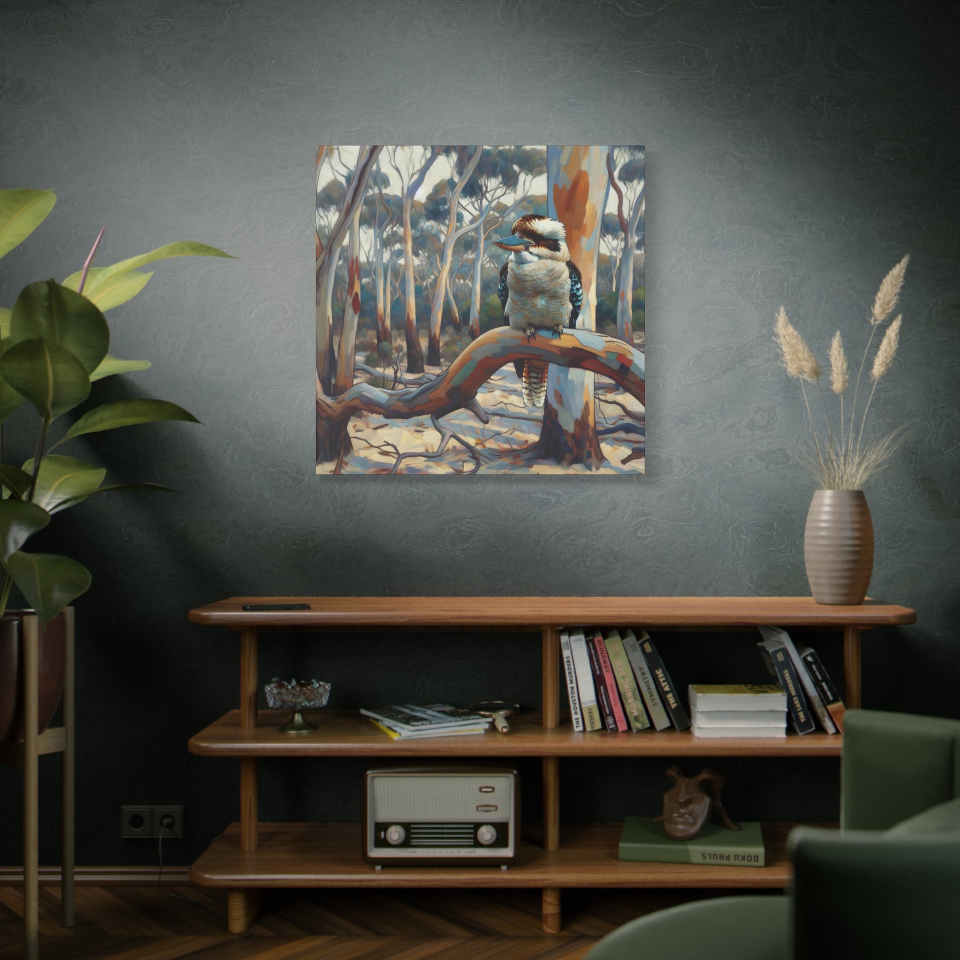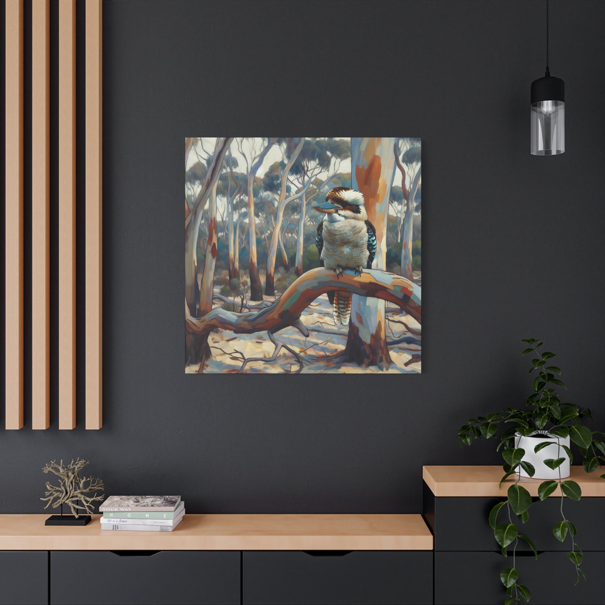 Bring the charm of the Australian outback into your home with this Kookaburra Sitting in a Gum Tree canvas print. The post impressionist style art adds a touch of whimsy to any space, perfect for nature lovers and art enthusiasts. Ideal for decorating living rooms, bedrooms, or home offices. Great gift for bird lovers, art collectors, and celebrating Australia Day.