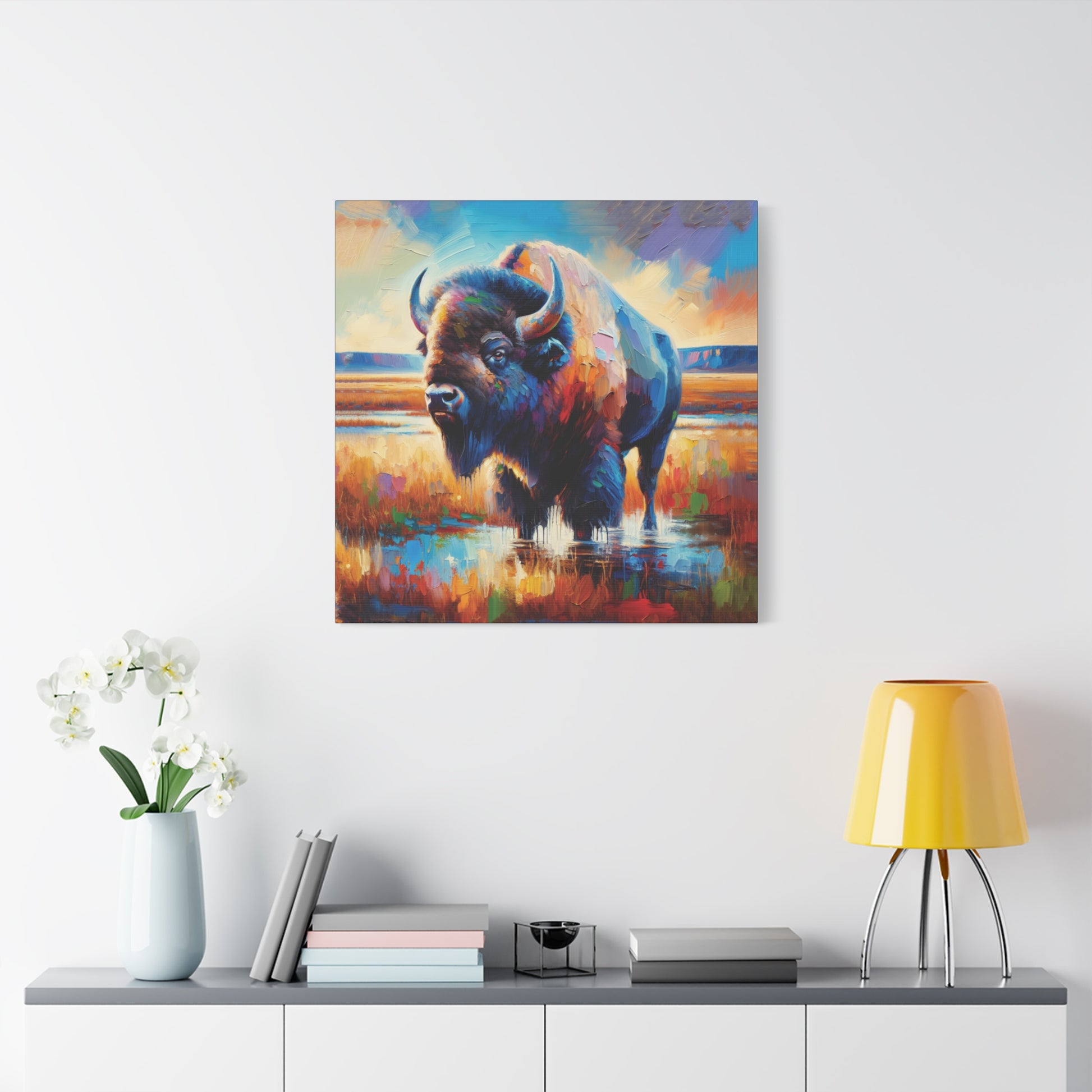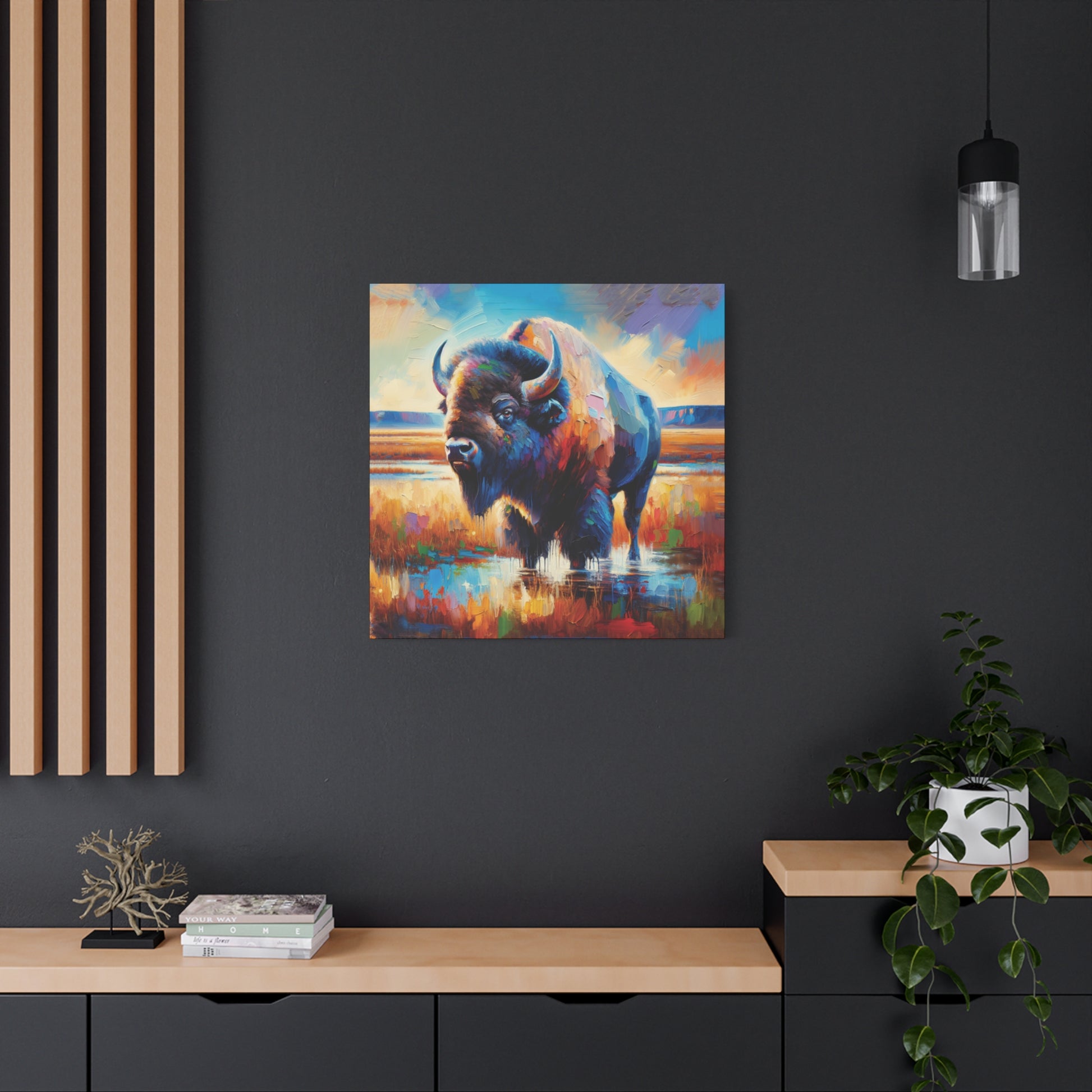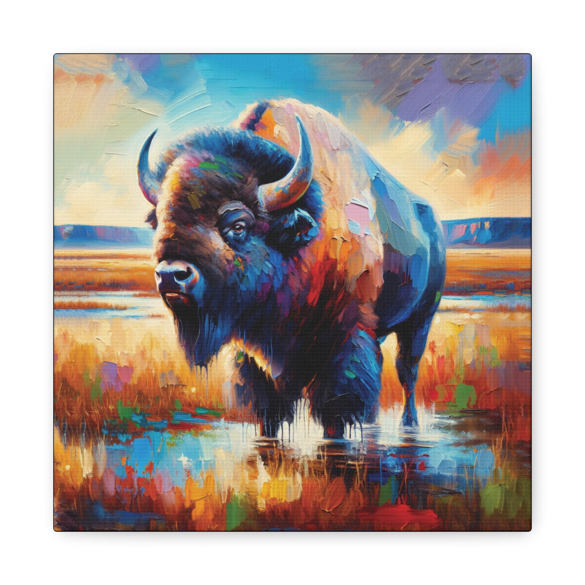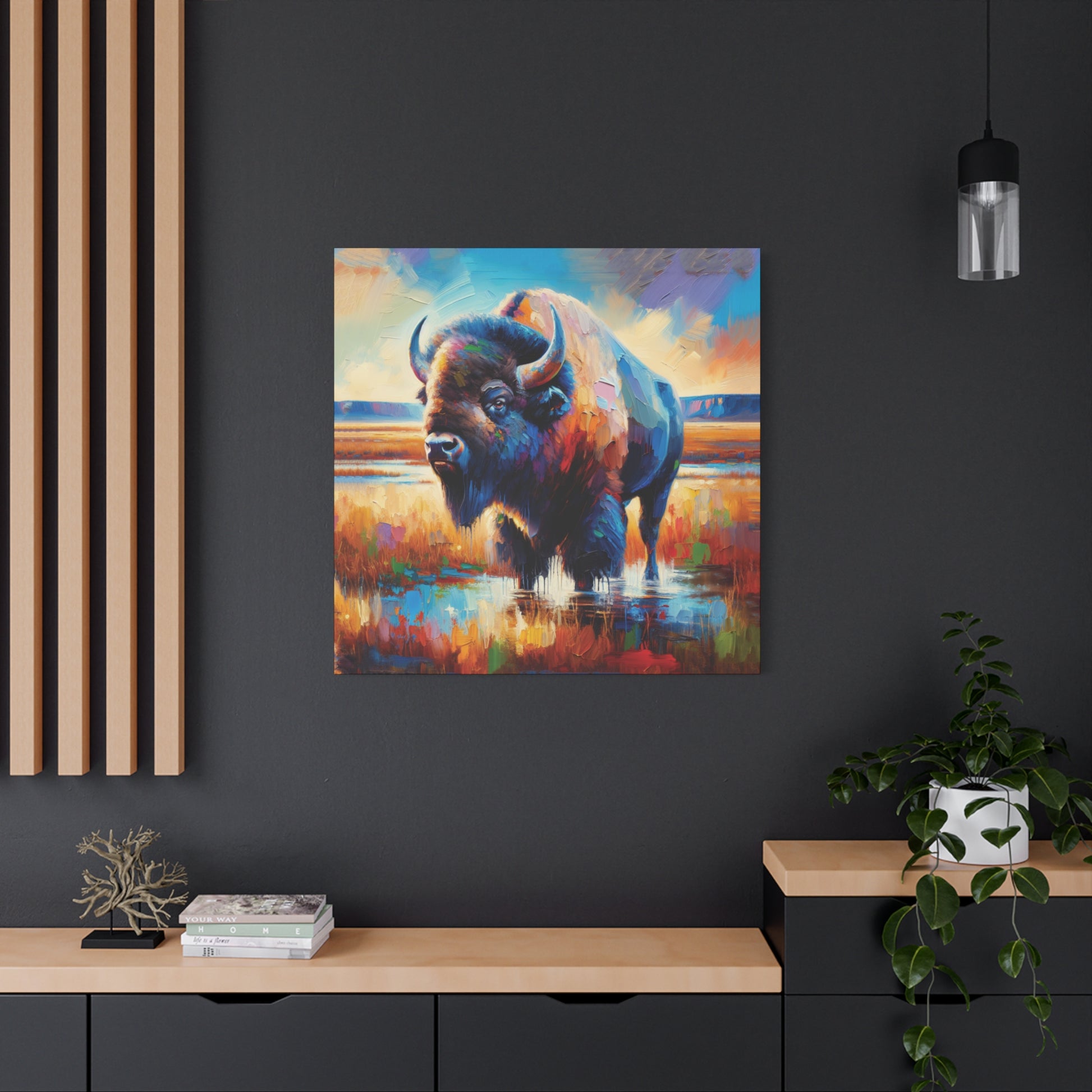 The rain came hard and fast, but not for so long that the prairie flooded. Still, the water sits on top of the parched land, and the bison enjoys the feel of it around his feet, appreciating the ability to drink his fill. This expressionive artwork showcases the almost larger-than-life presence of the iconic American buffalo in his native habitat.