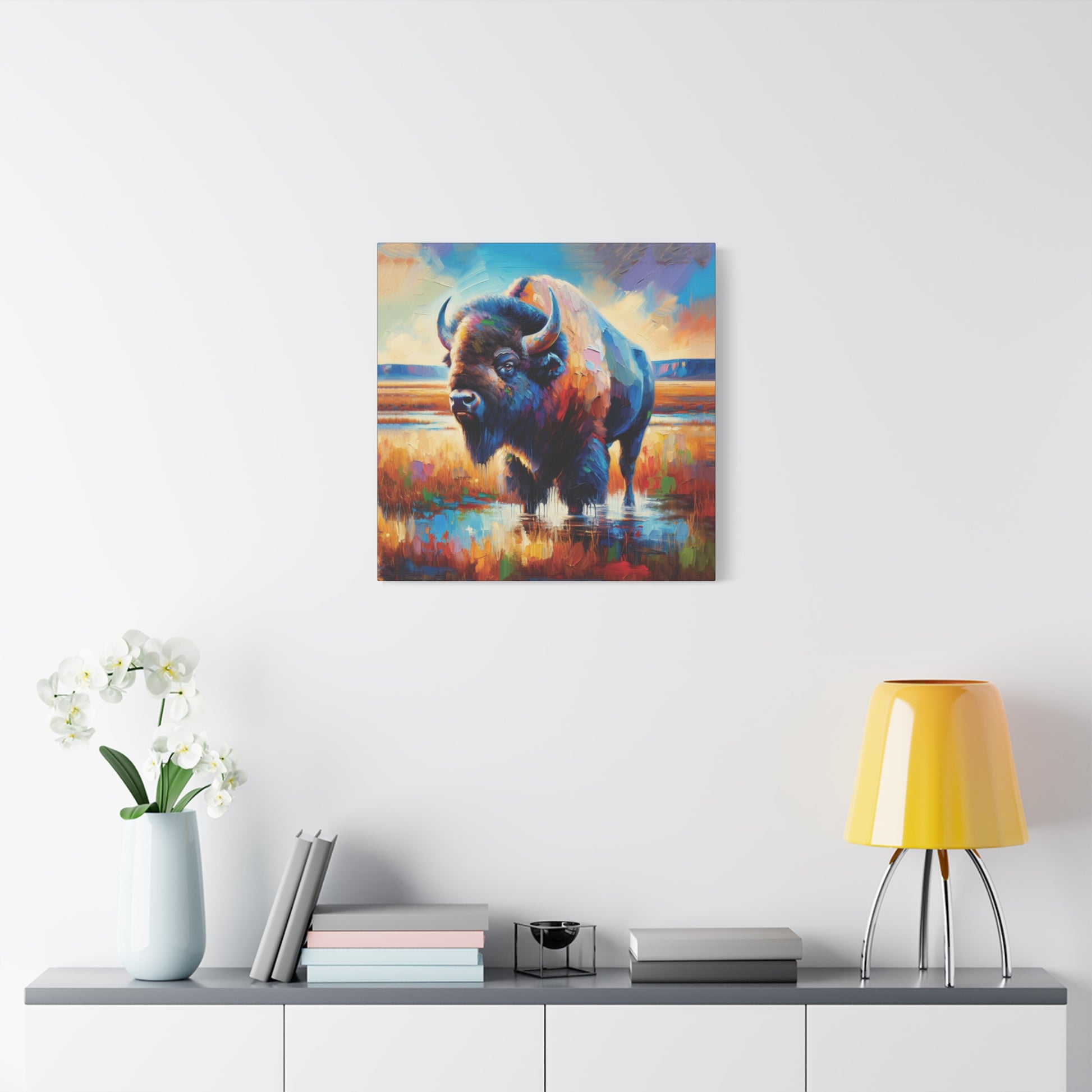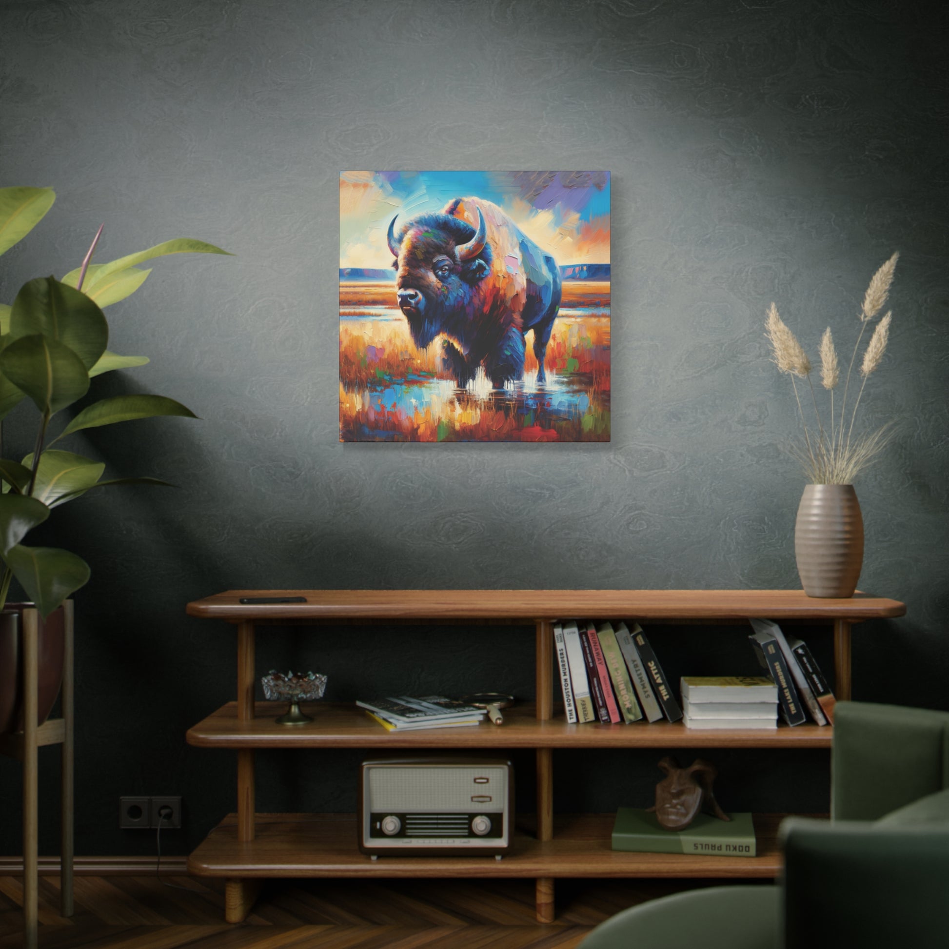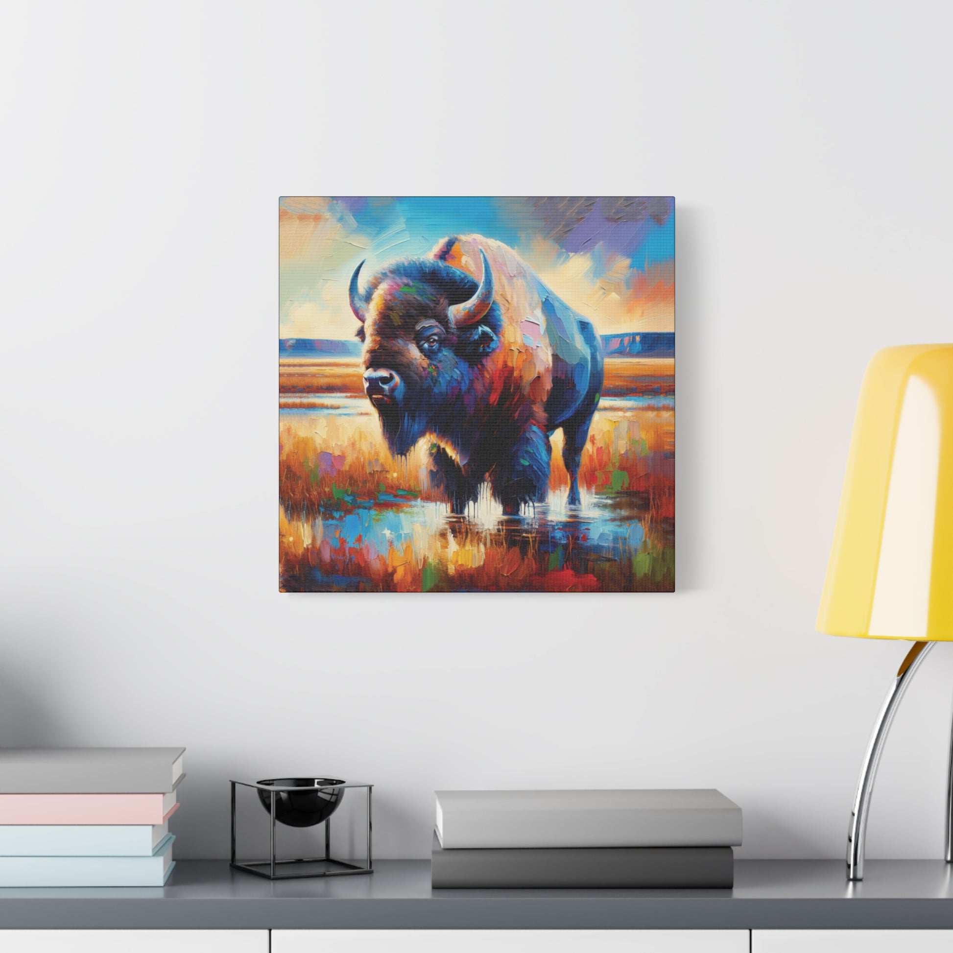 The rain came hard and fast, but not for so long that the prairie flooded. Still, the water sits on top of the parched land, and the bison enjoys the feel of it around his feet, appreciating the ability to drink his fill. This expressionive artwork showcases the almost larger-than-life presence of the iconic American buffalo in his native habitat.