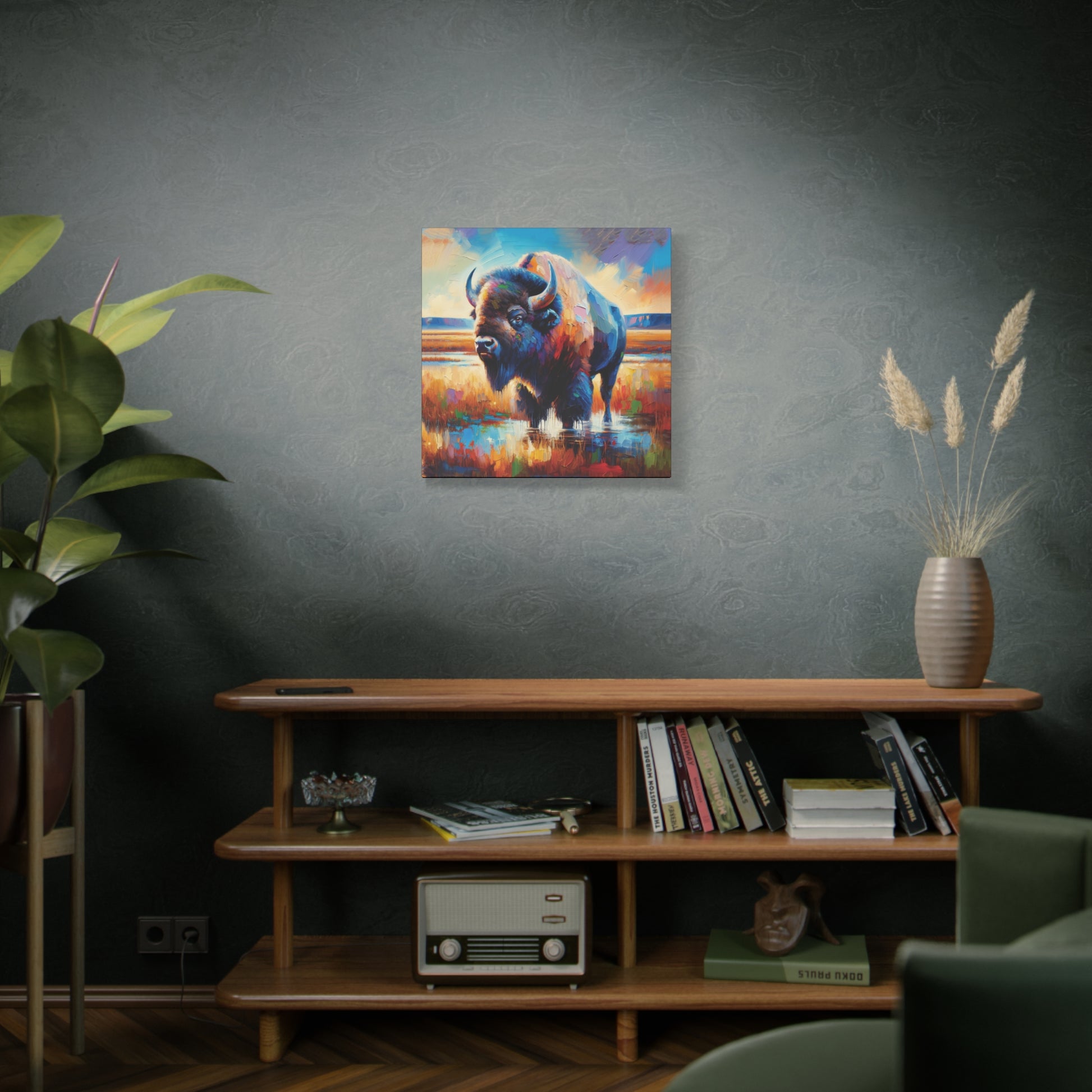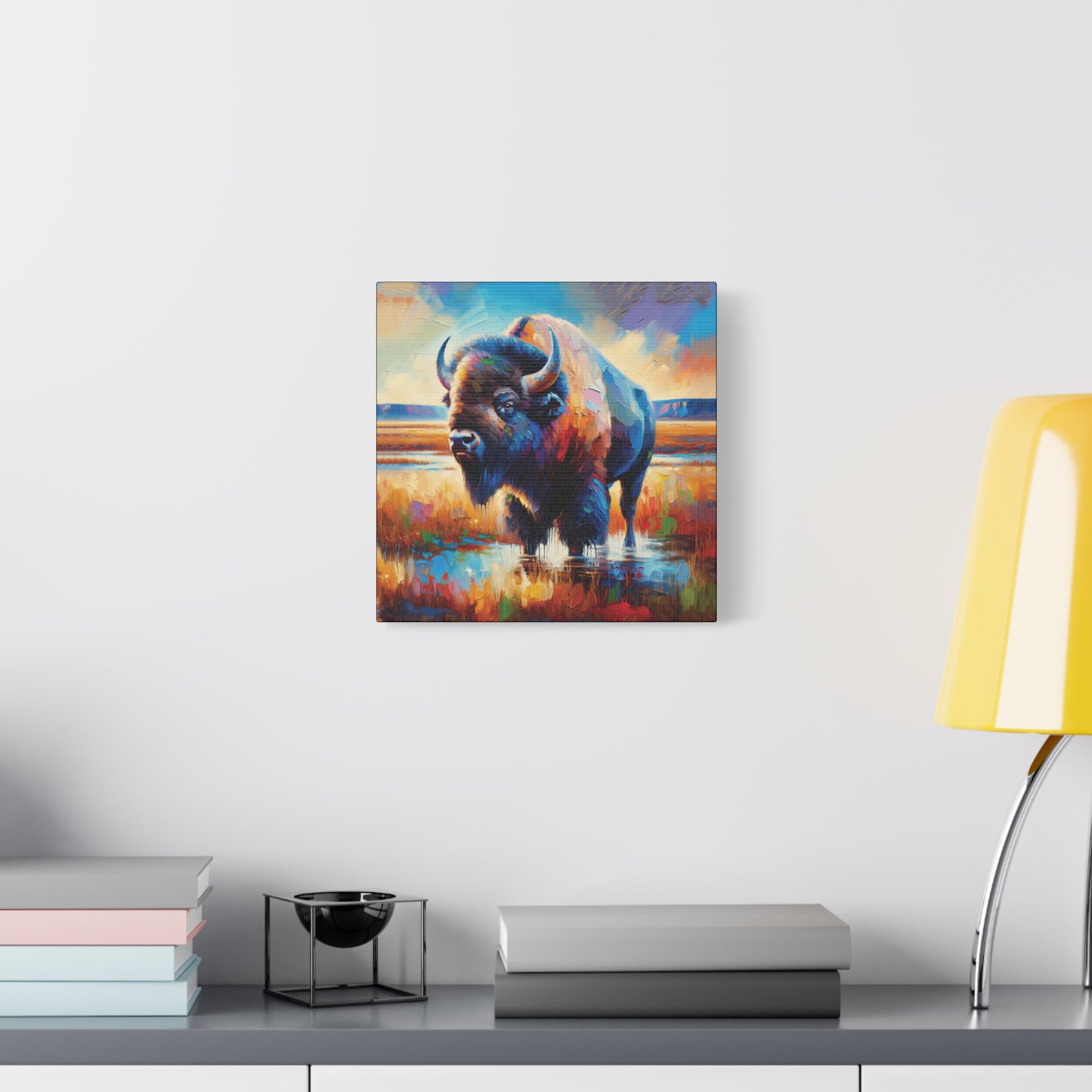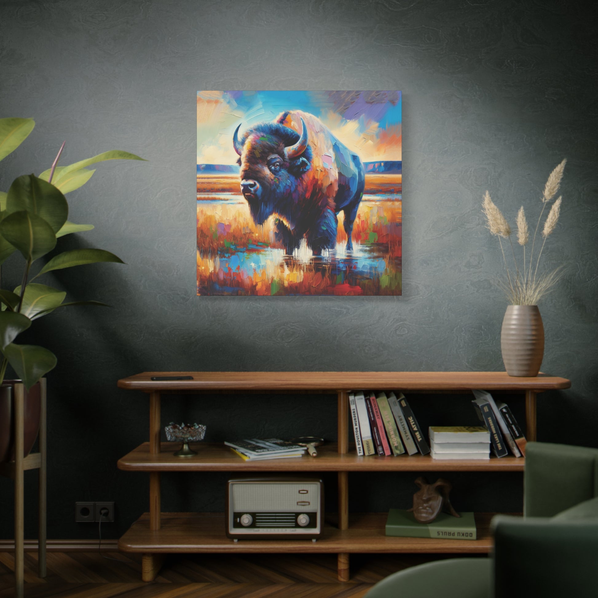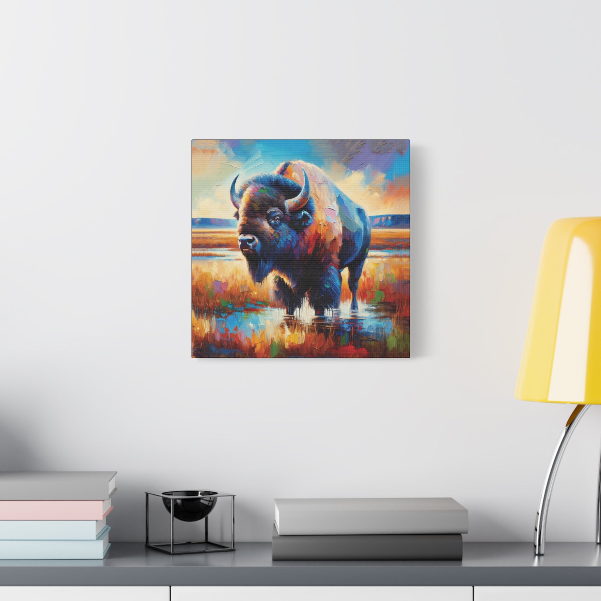 The rain came hard and fast, but not for so long that the prairie flooded. Still, the water sits on top of the parched land, and the bison enjoys the feel of it around his feet, appreciating the ability to drink his fill. This expressionive artwork showcases the almost larger-than-life presence of the iconic American buffalo in his native habitat.