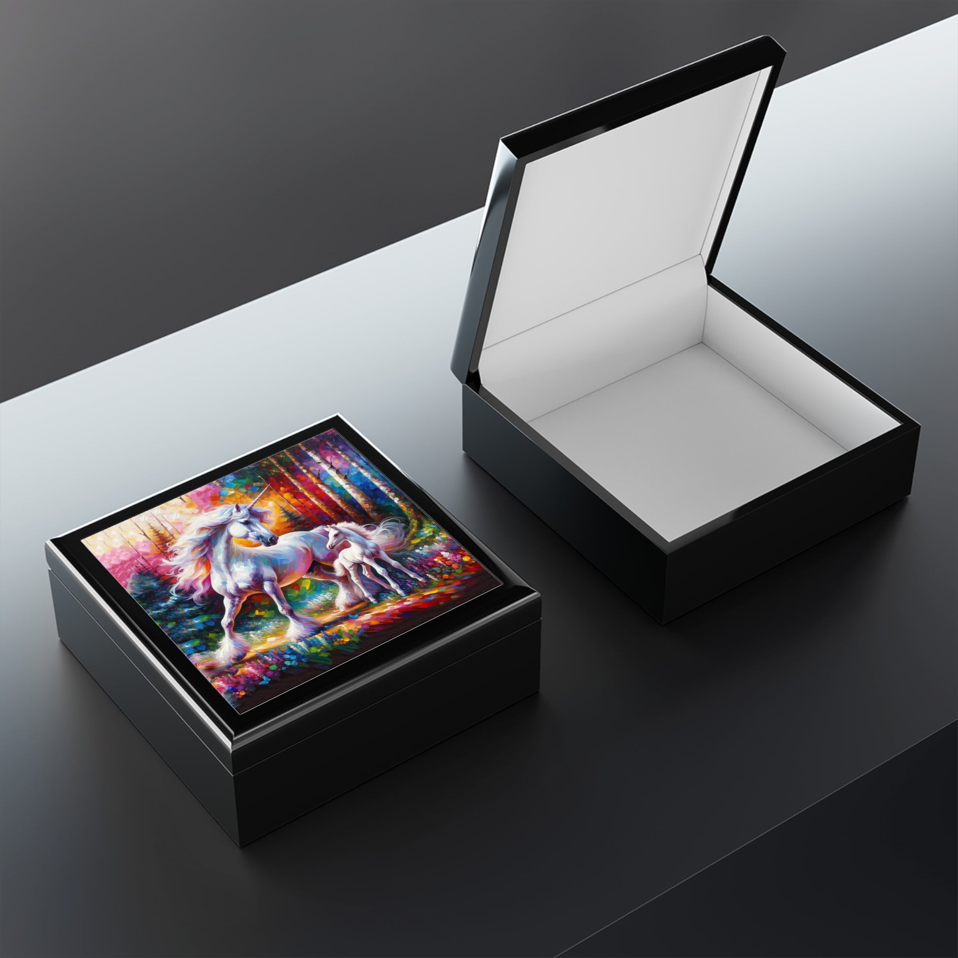 This Jewelry Box featuring a magical Unicorn father and daughter design is perfect for those who love whimsical and fantasy-themed accessories. It adds a touch of enchantment to any room and makes a great gift for daughters, mothers, or anyone who appreciates unicorns or the fantasy worlds. Ideal for birthdays, holidays, or special occasions.