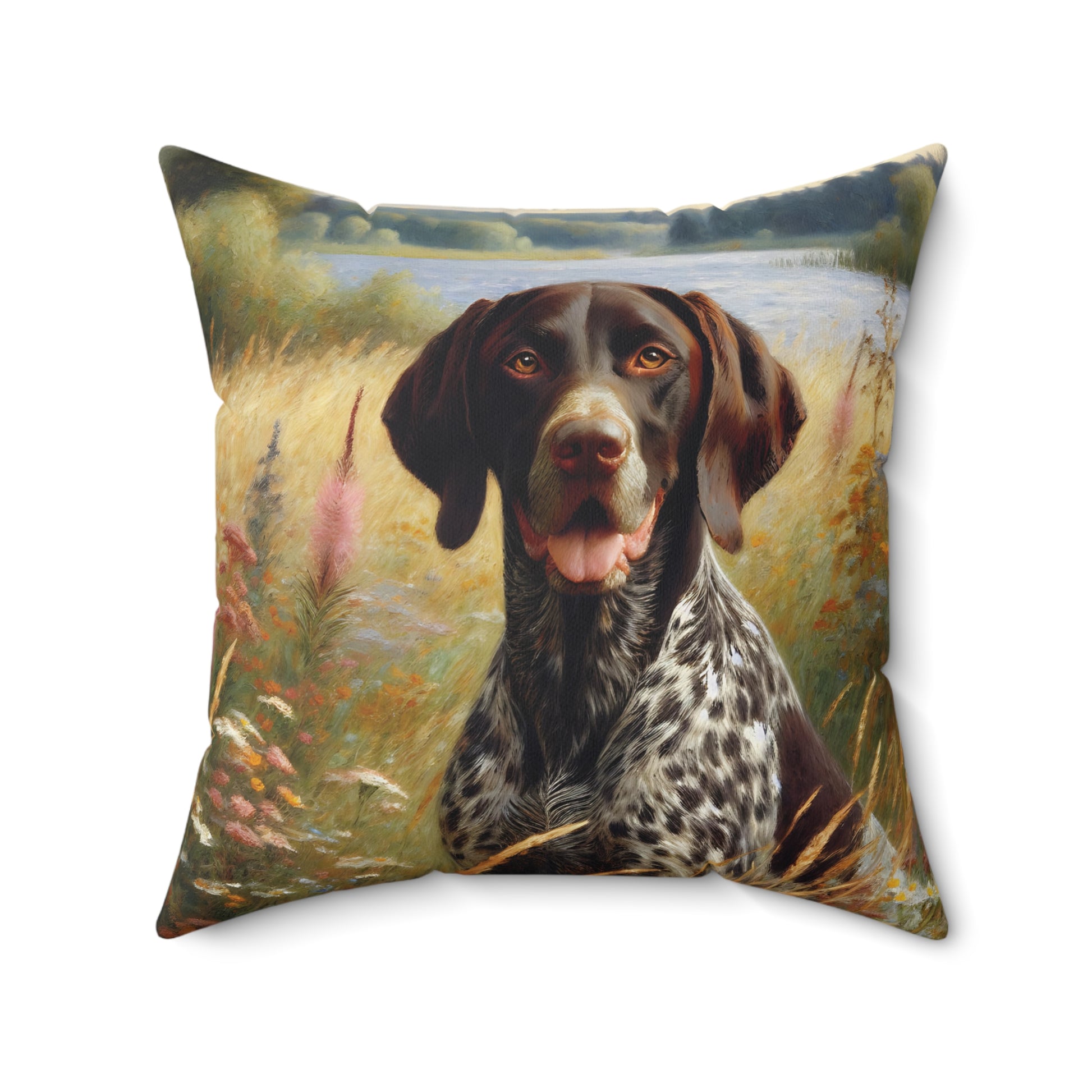 This dog throw pillow features a patient German Shorthaired Pointer waiting beside a lake for his owner to catch up. Created in impressionist style art, it brings a playful and cheerful vibe to any room in your home. Perfect for pointer lovers and dog enthusiasts, this pillow is ideal for adding a touch of whimsy to your living space. Great for dog-themed decor, pet lovers, and animal enthusiasts. Perfect for birthdays, Christmas, or any special occasion.