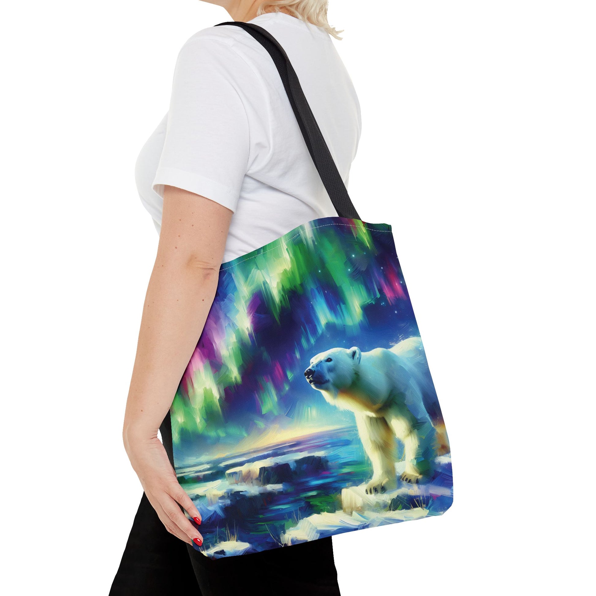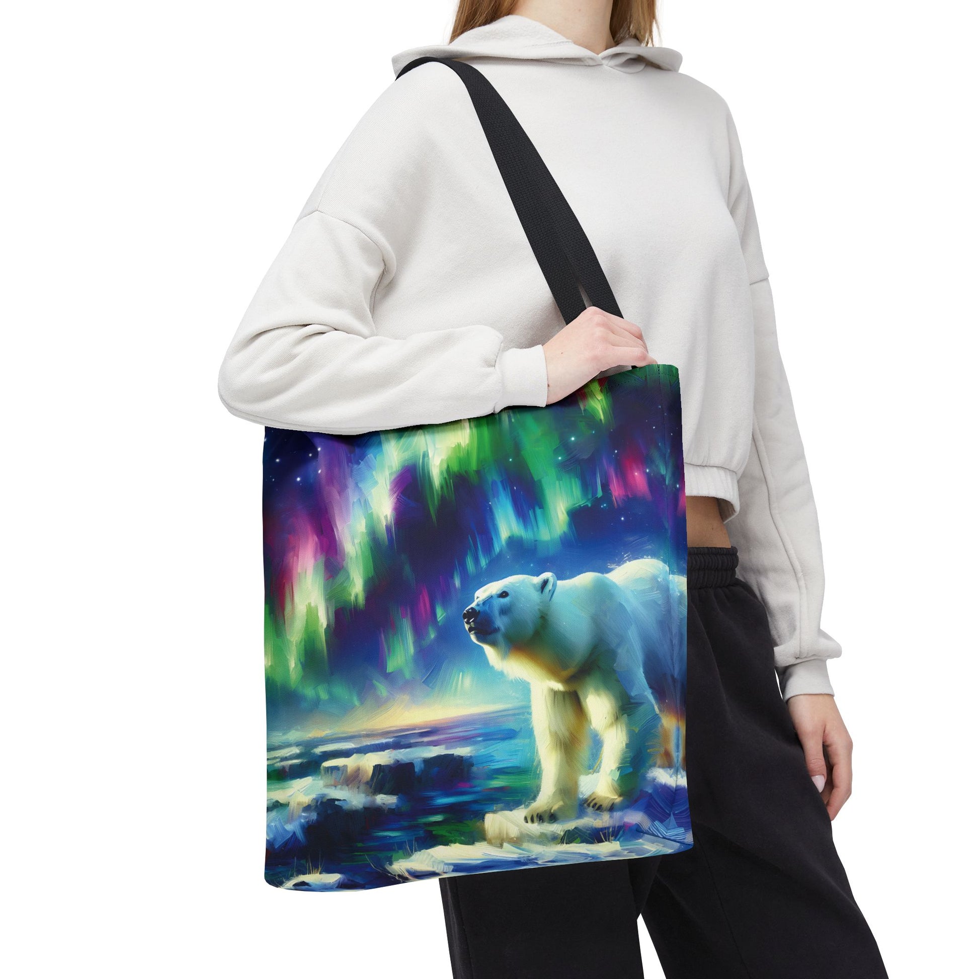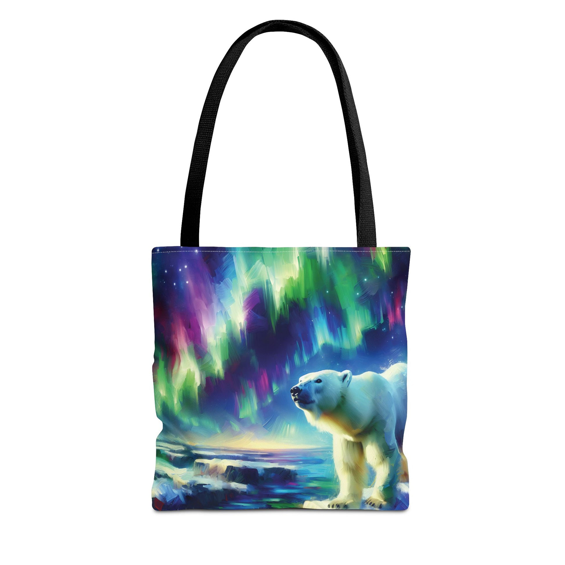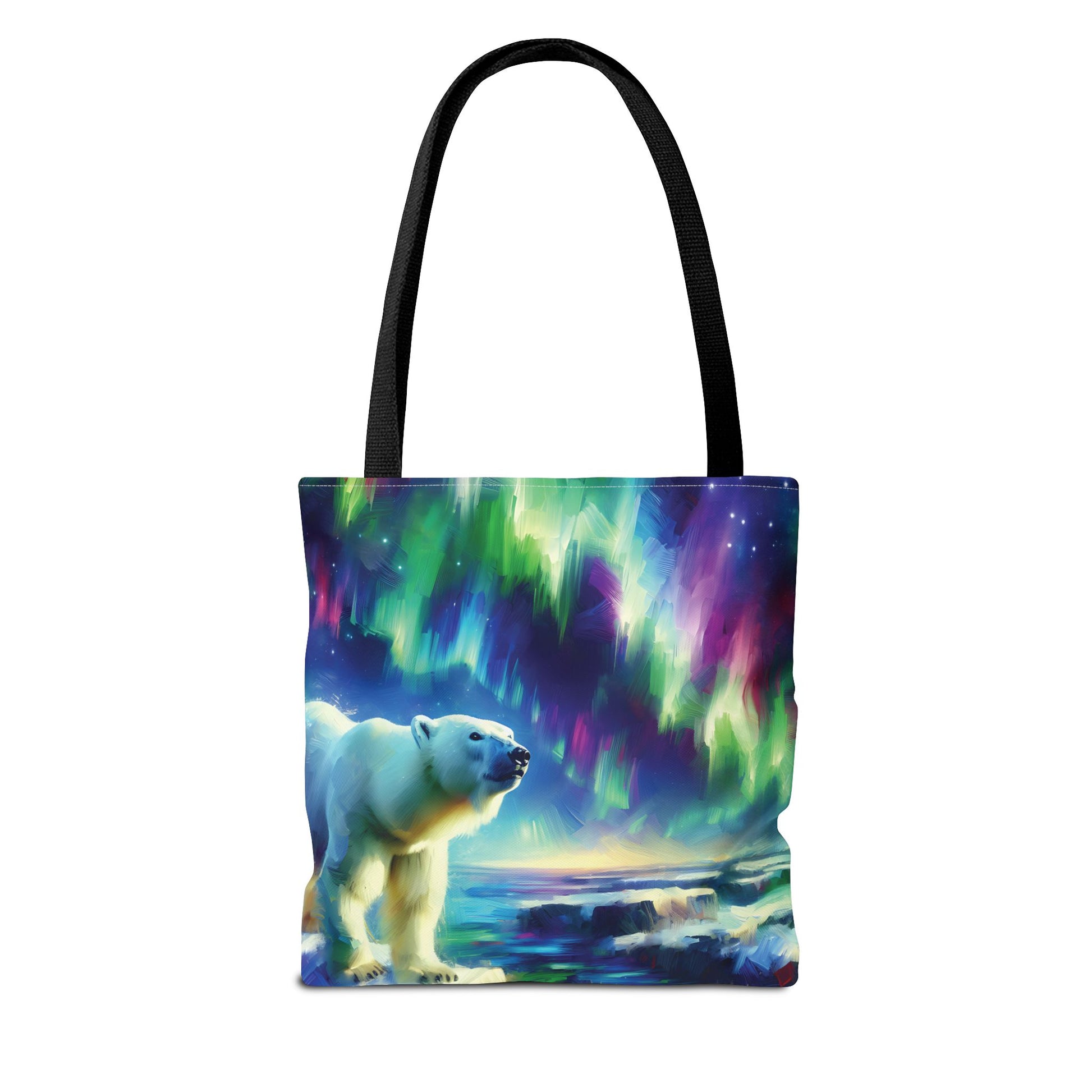 This gorgeous, colorful tote bag features a polar bear beneath the Northern Lights!
