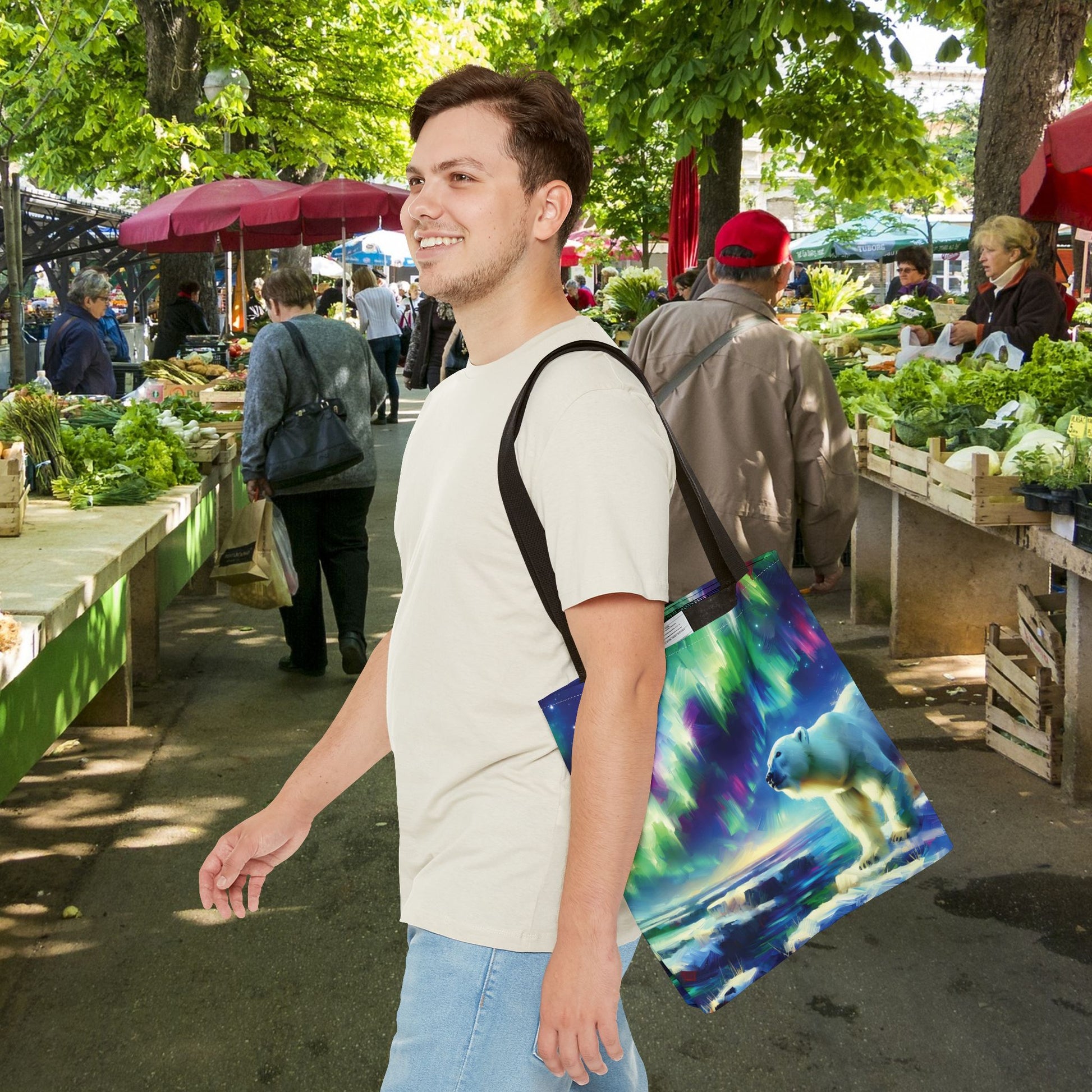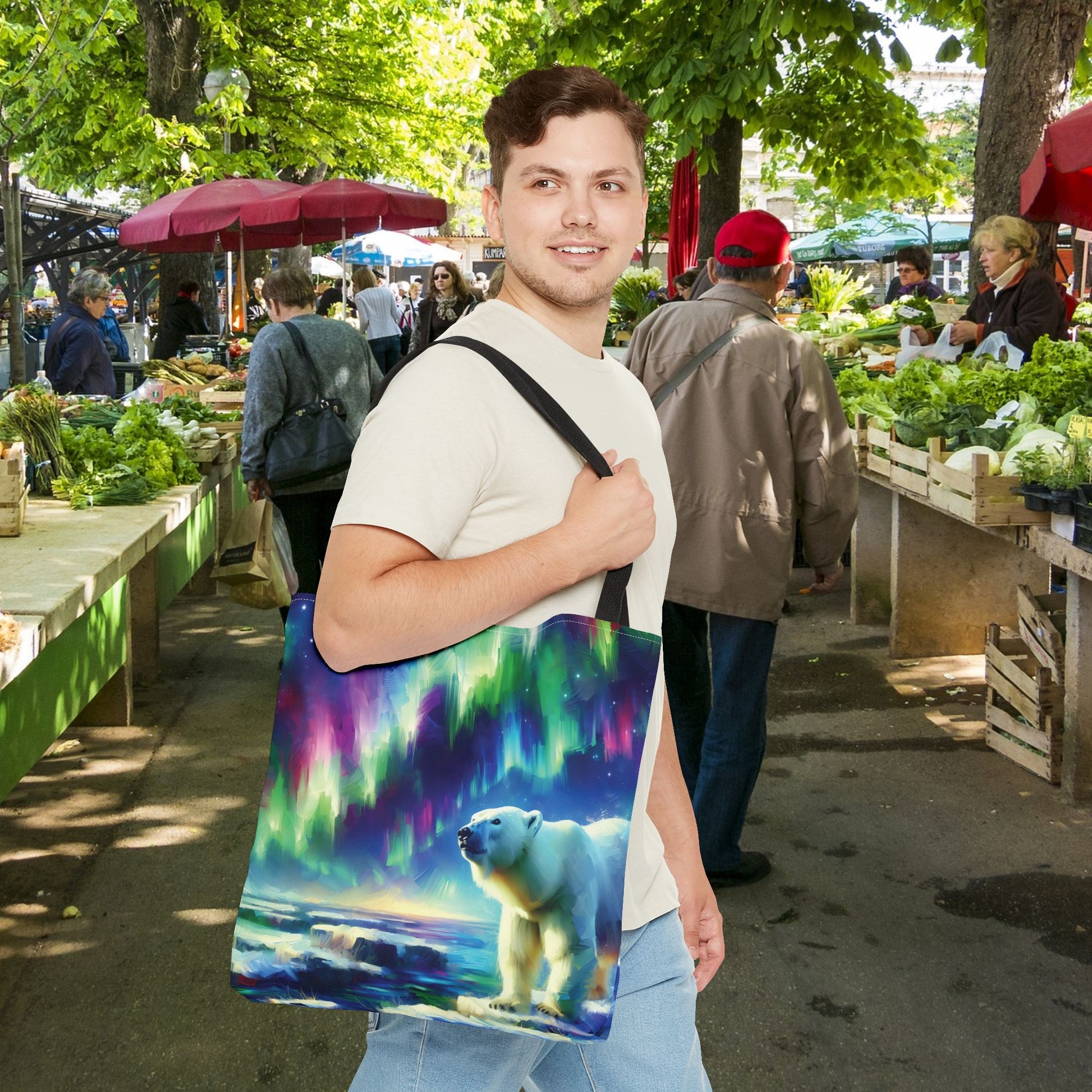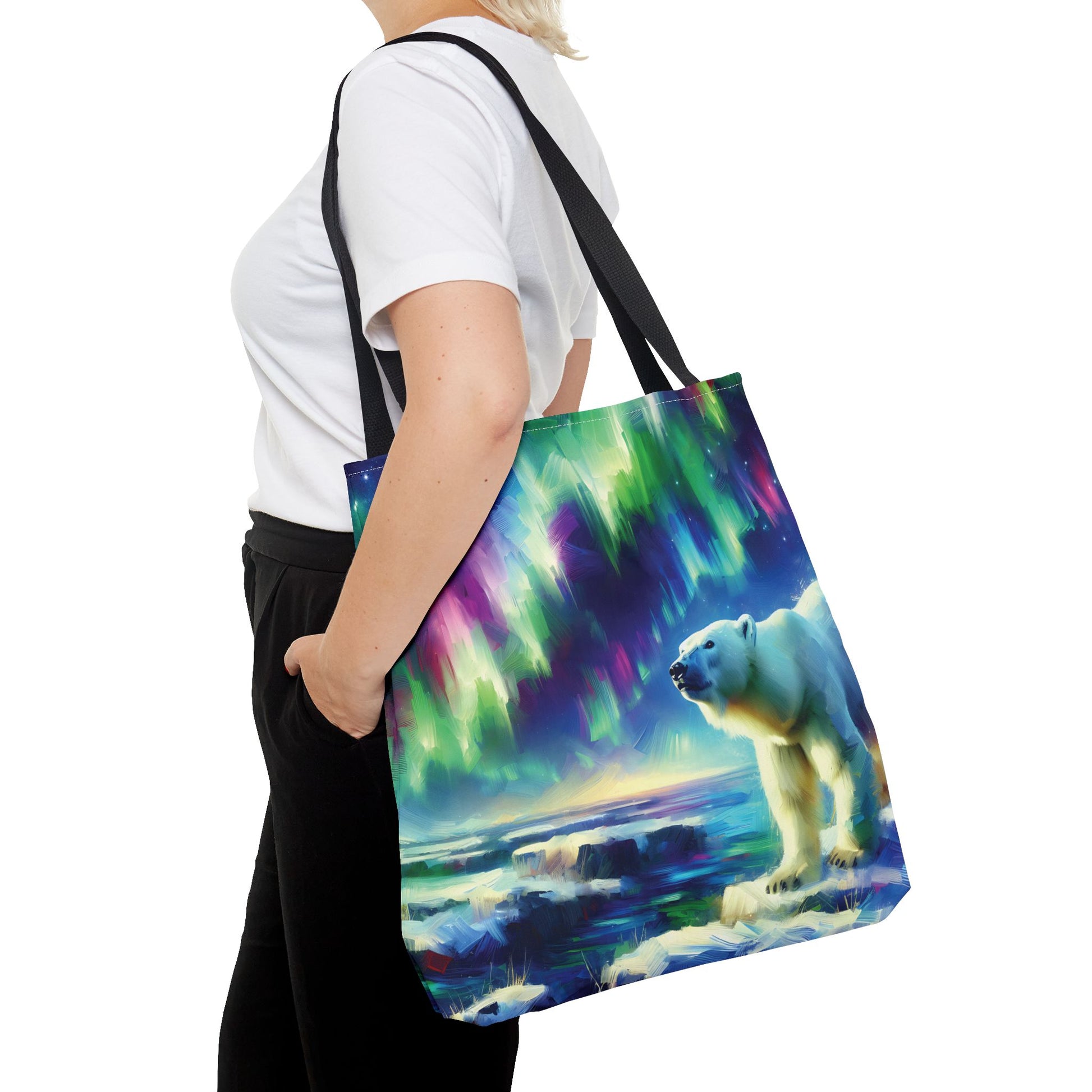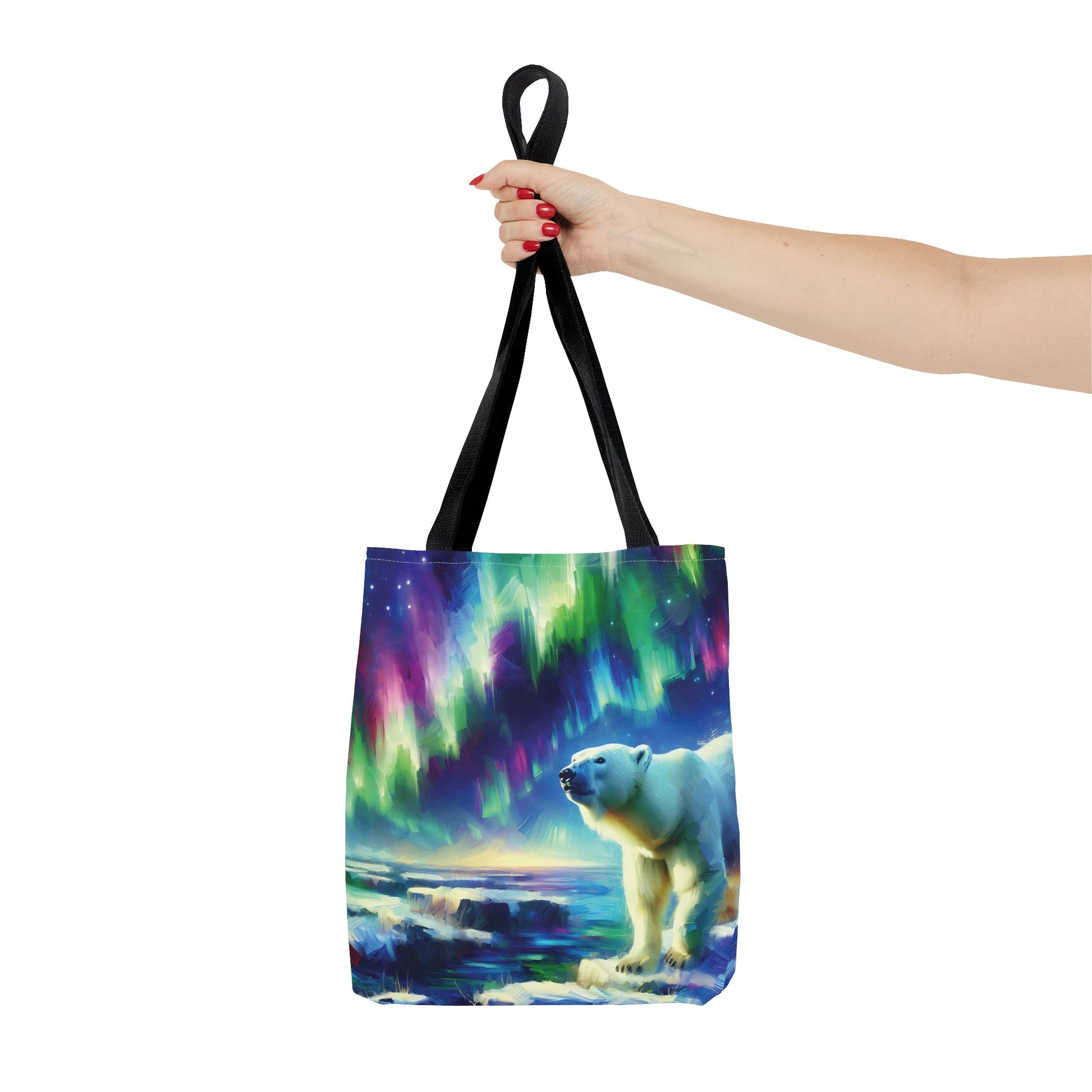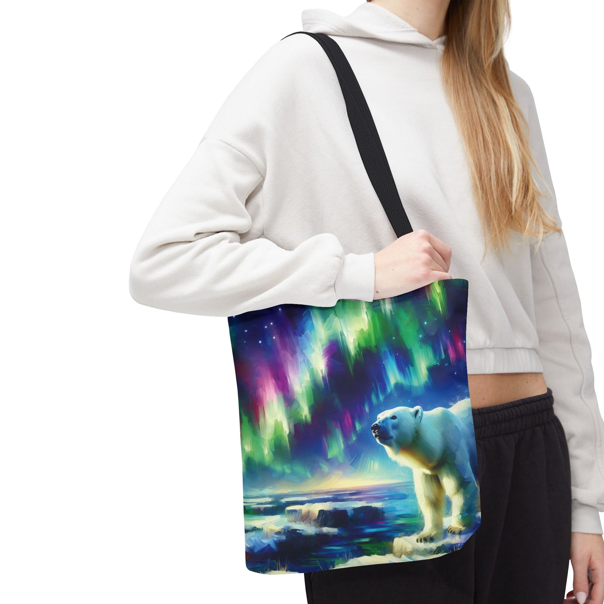 This gorgeous, colorful tote bag features a polar bear beneath the Northern Lights!