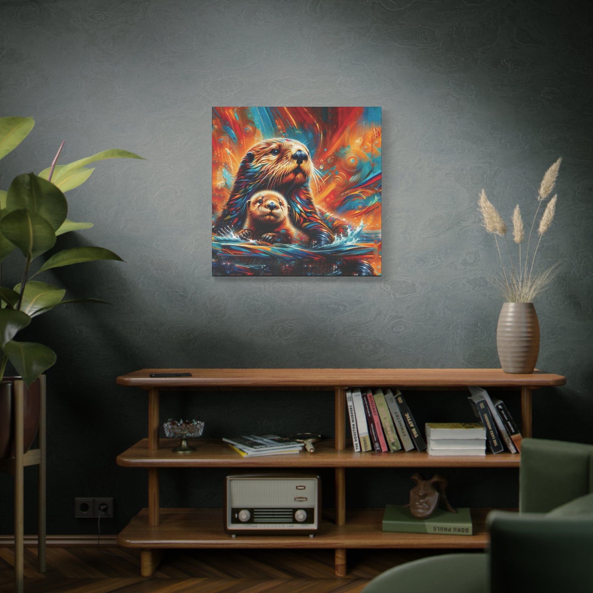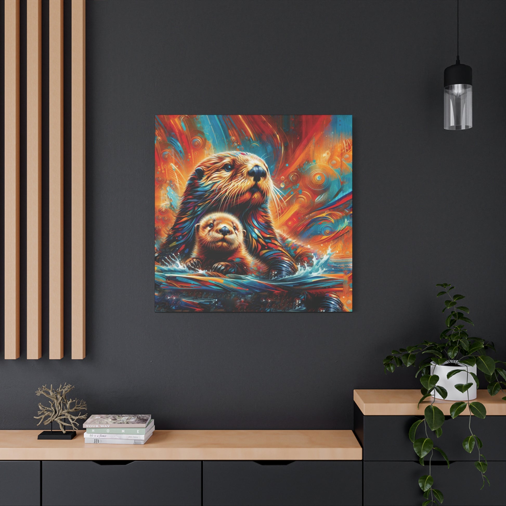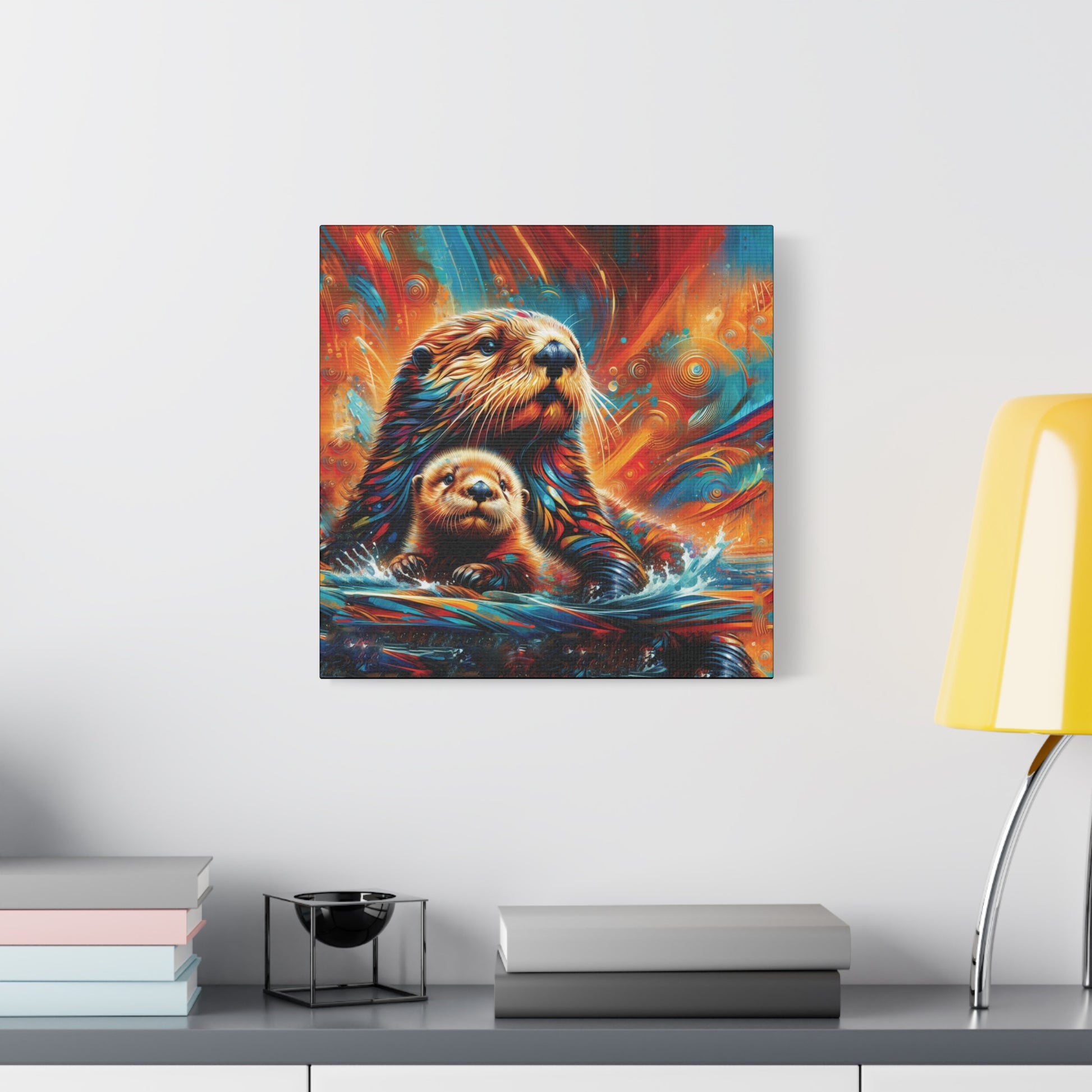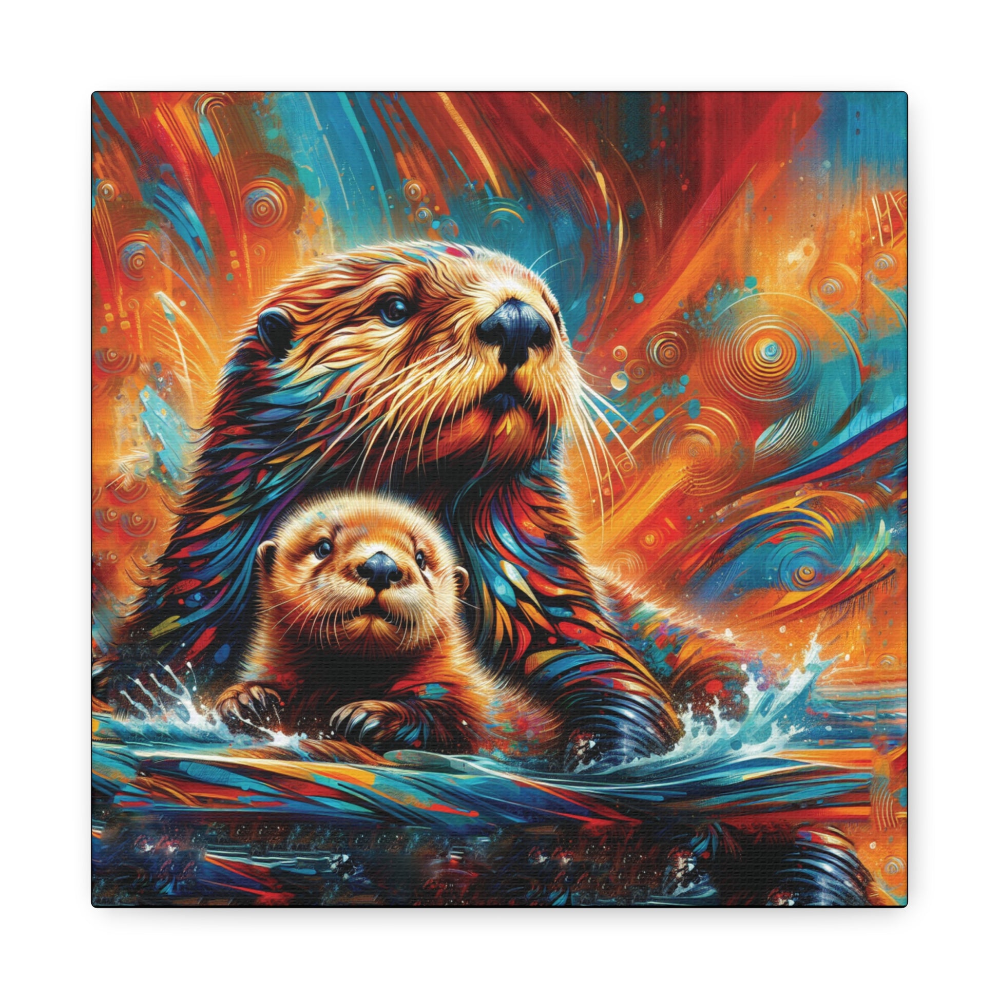Mom and baby Sea Otter watching the play of the sunset on the waters around them. Stunning, bold bright color evoke feelings of awe and magic. Sure to enliven any room it's place in!