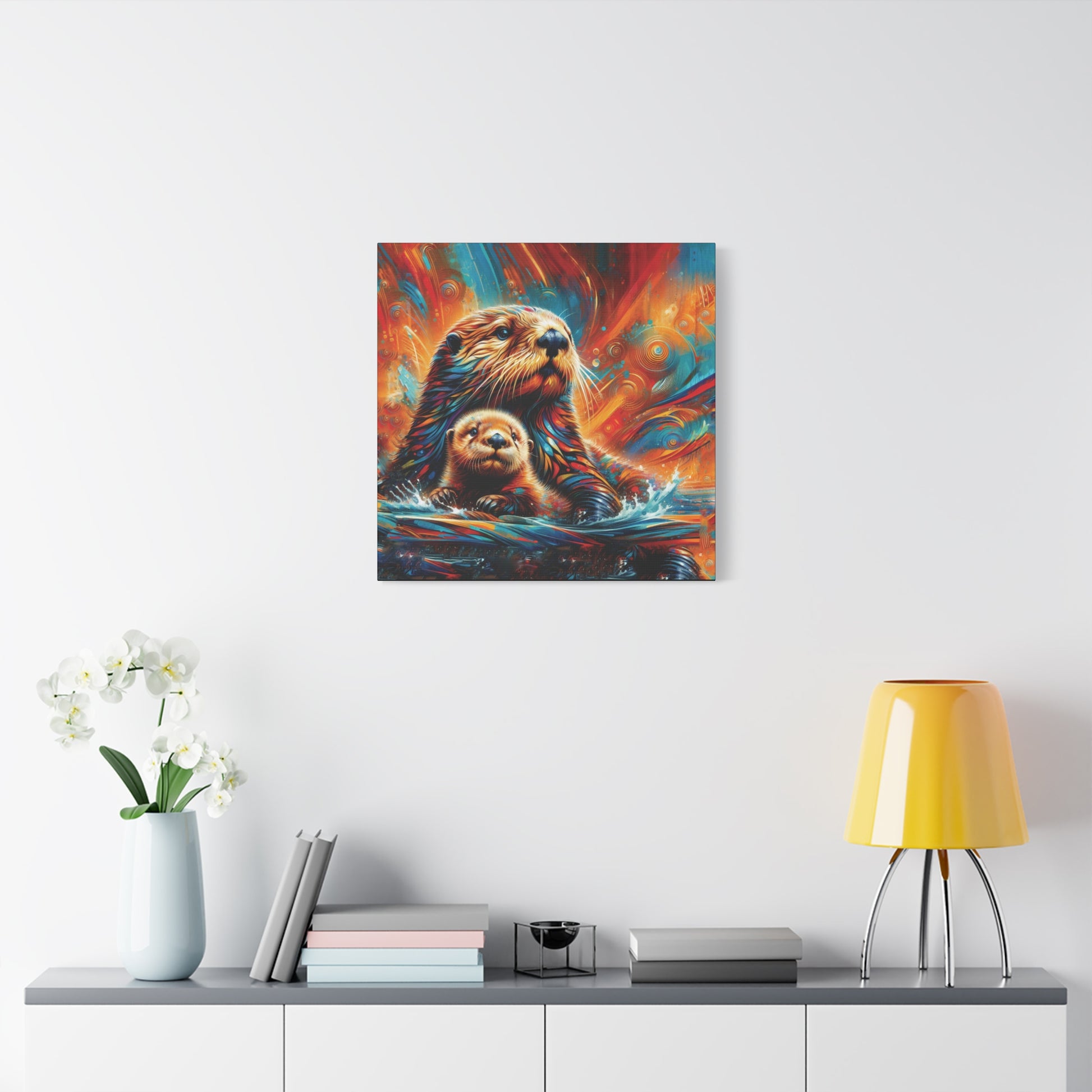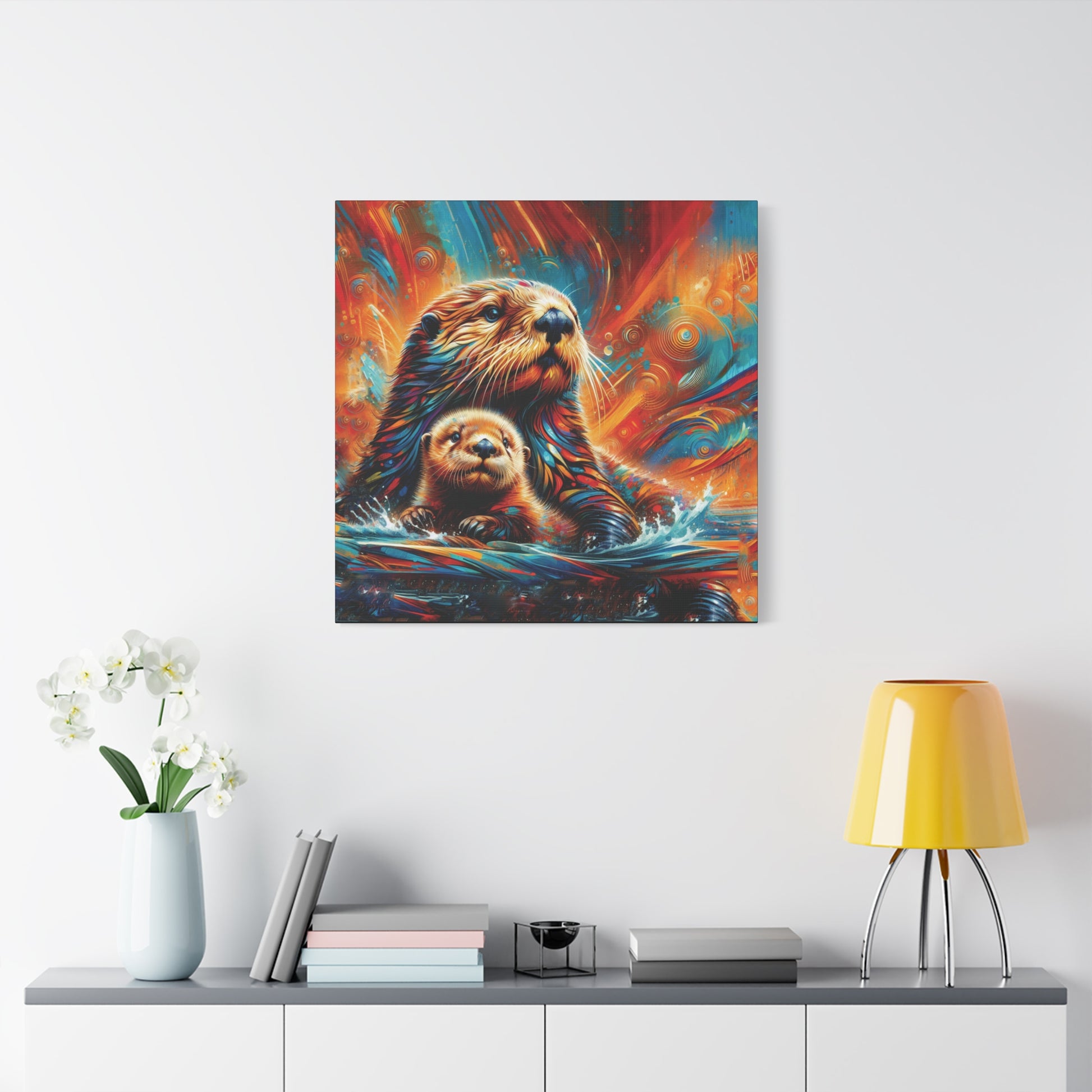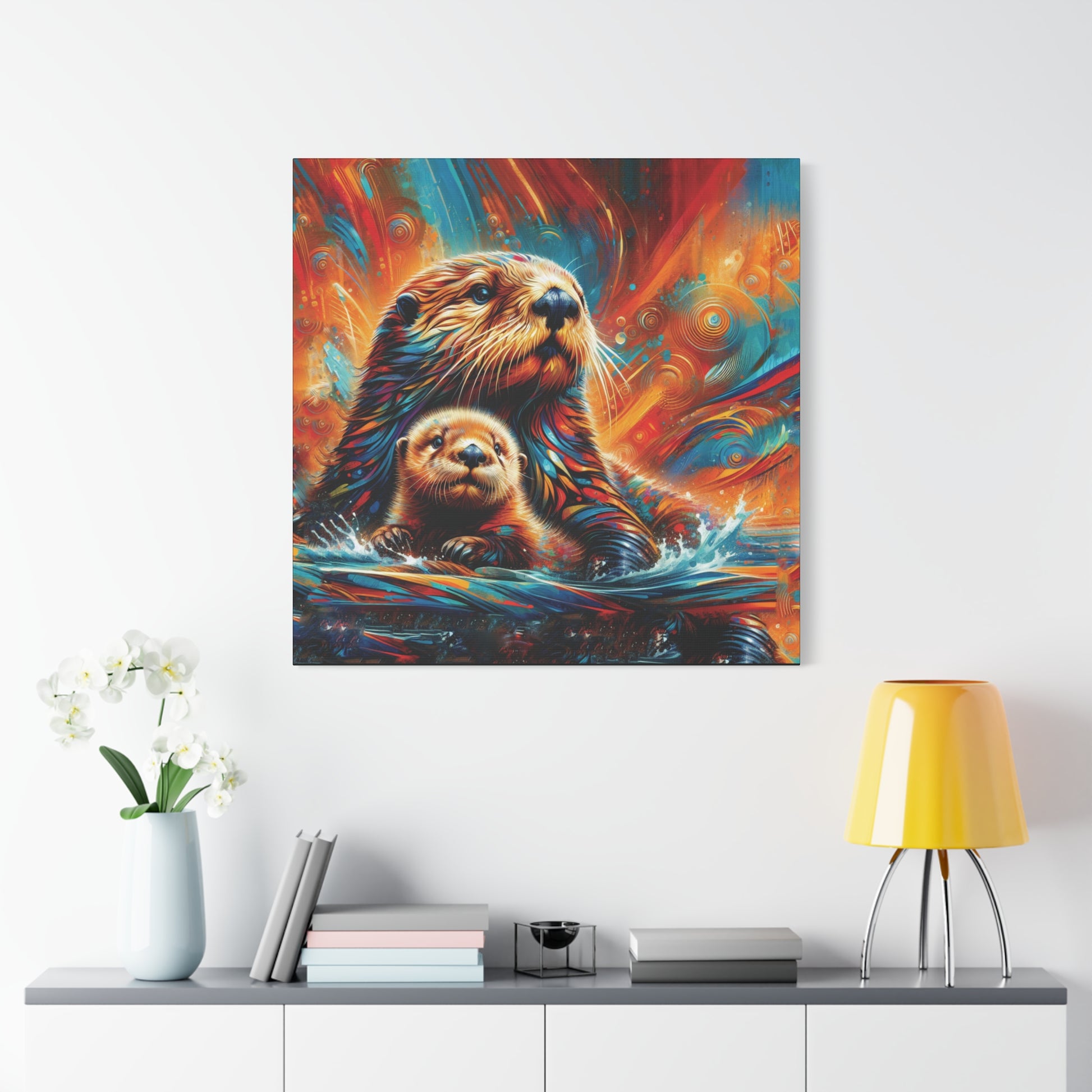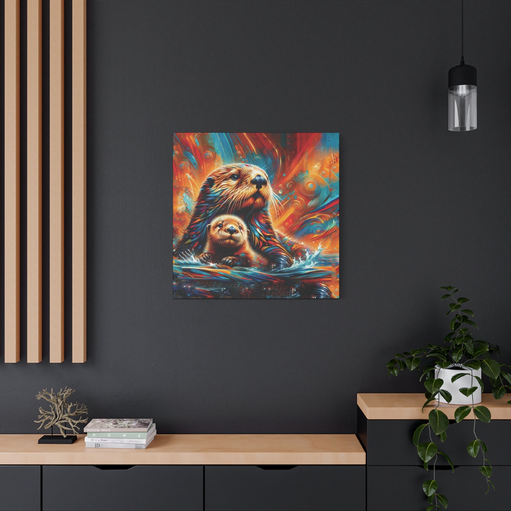 Mom and baby Sea Otter watching the play of the sunset on the waters around them. Stunning, bold bright color evoke feelings of awe and magic. Sure to enliven any room it's place in!