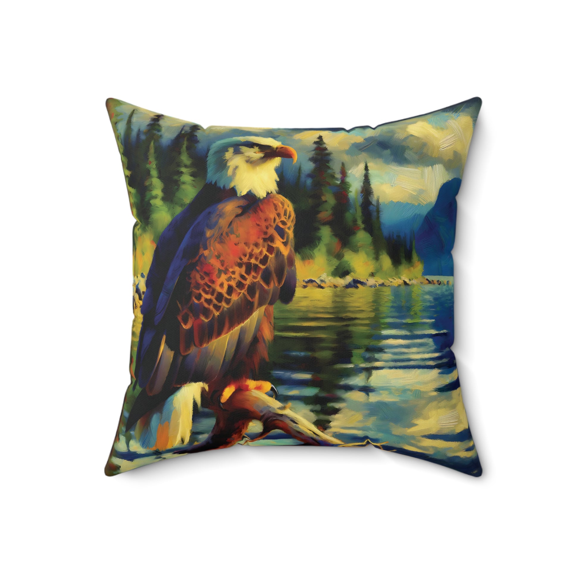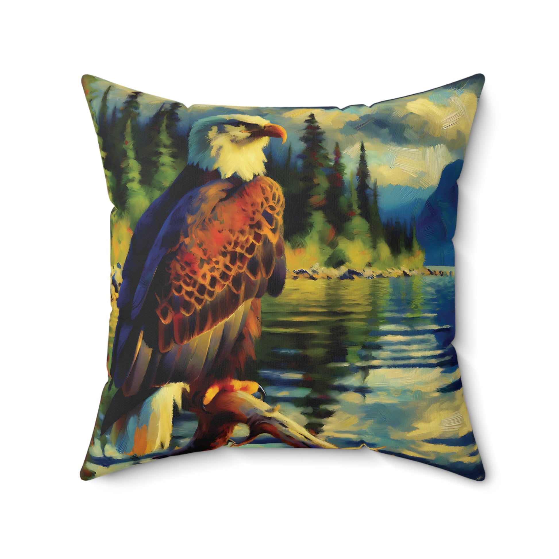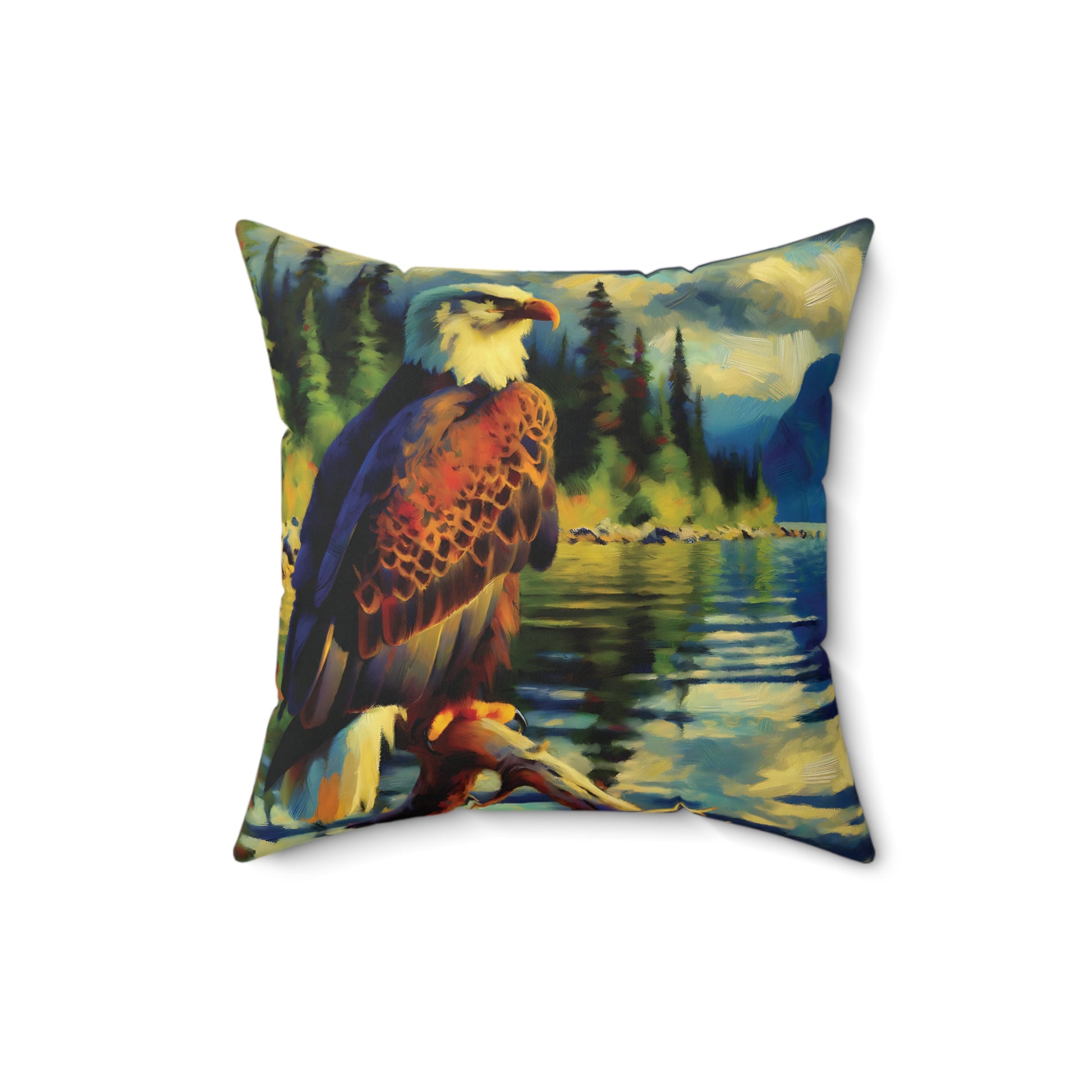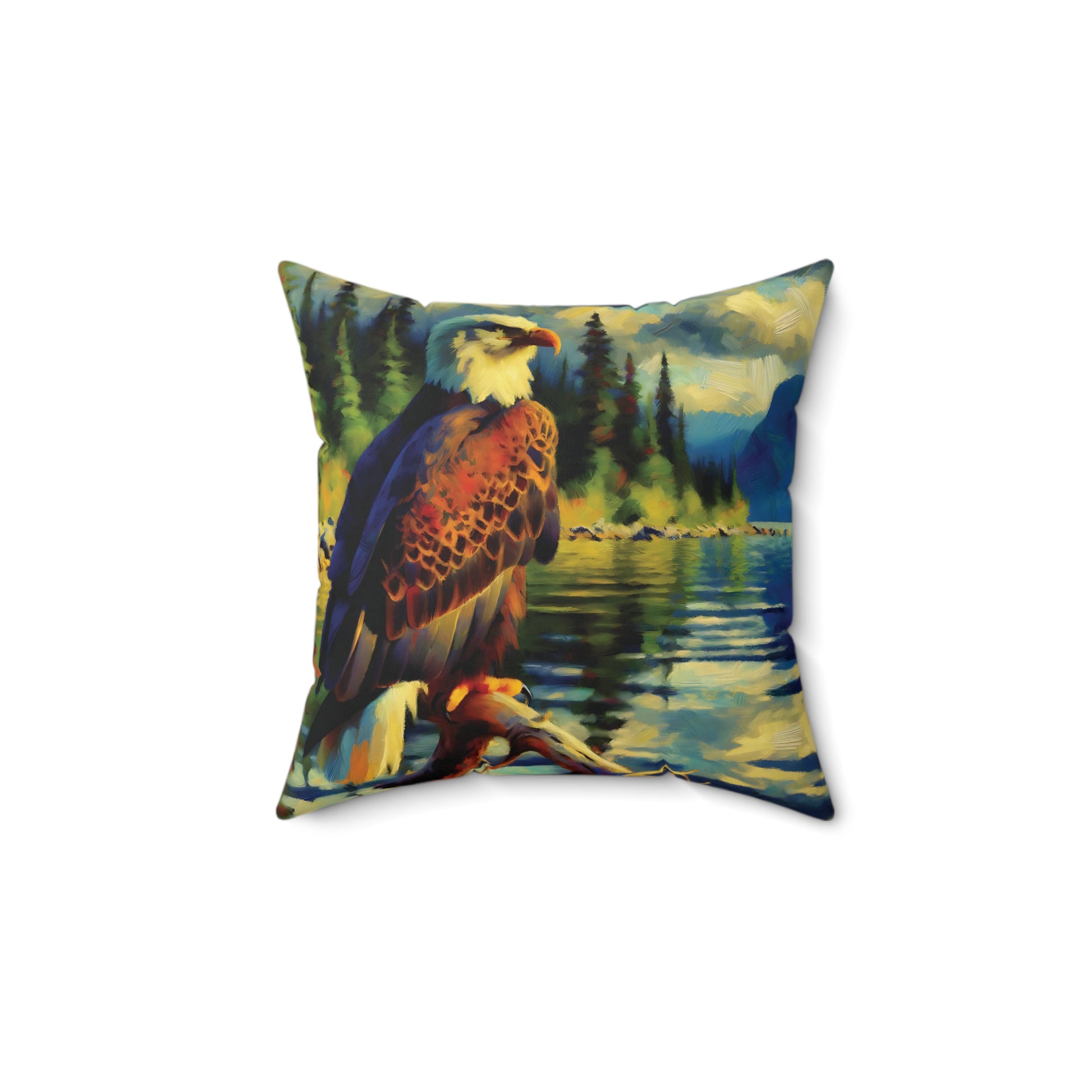 Square Pillow - Bald Eagle at Lake Impressionist Style Art on Faux Suede Pillow