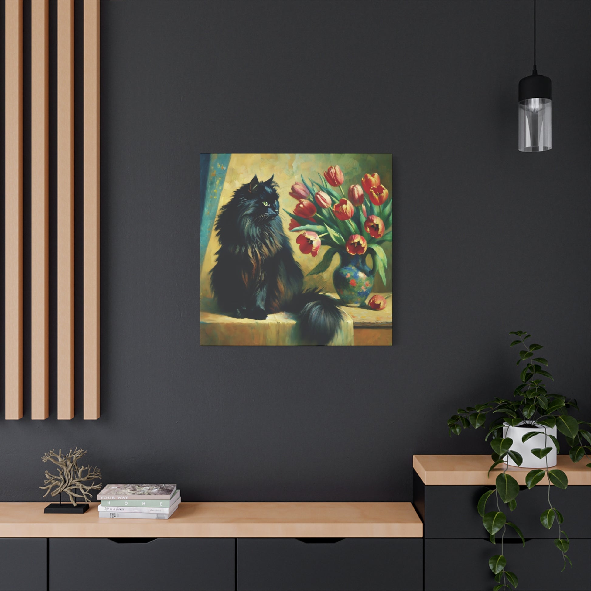 The Artist's Black Cat with Red Tulips - Impressionist Canvas Wall Art