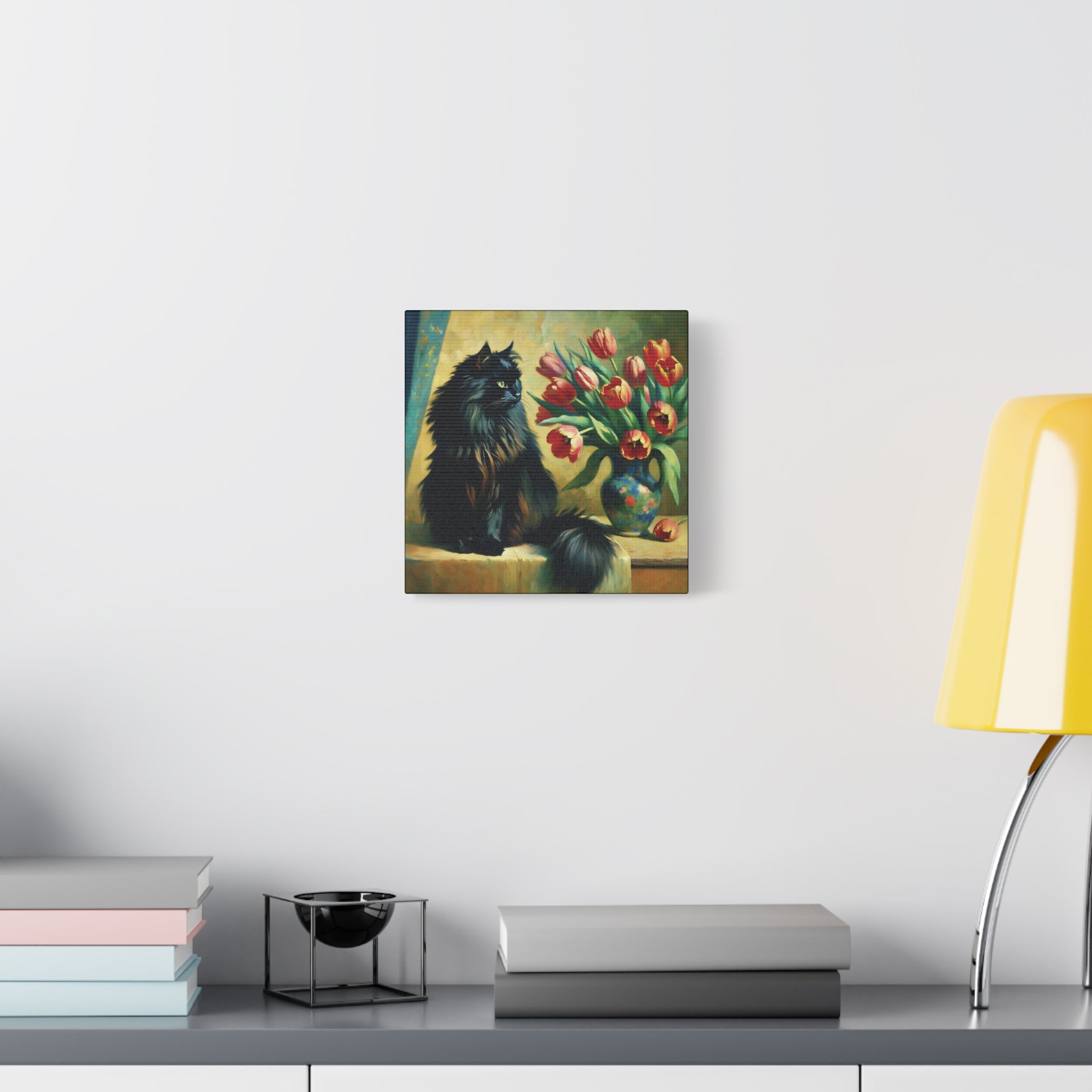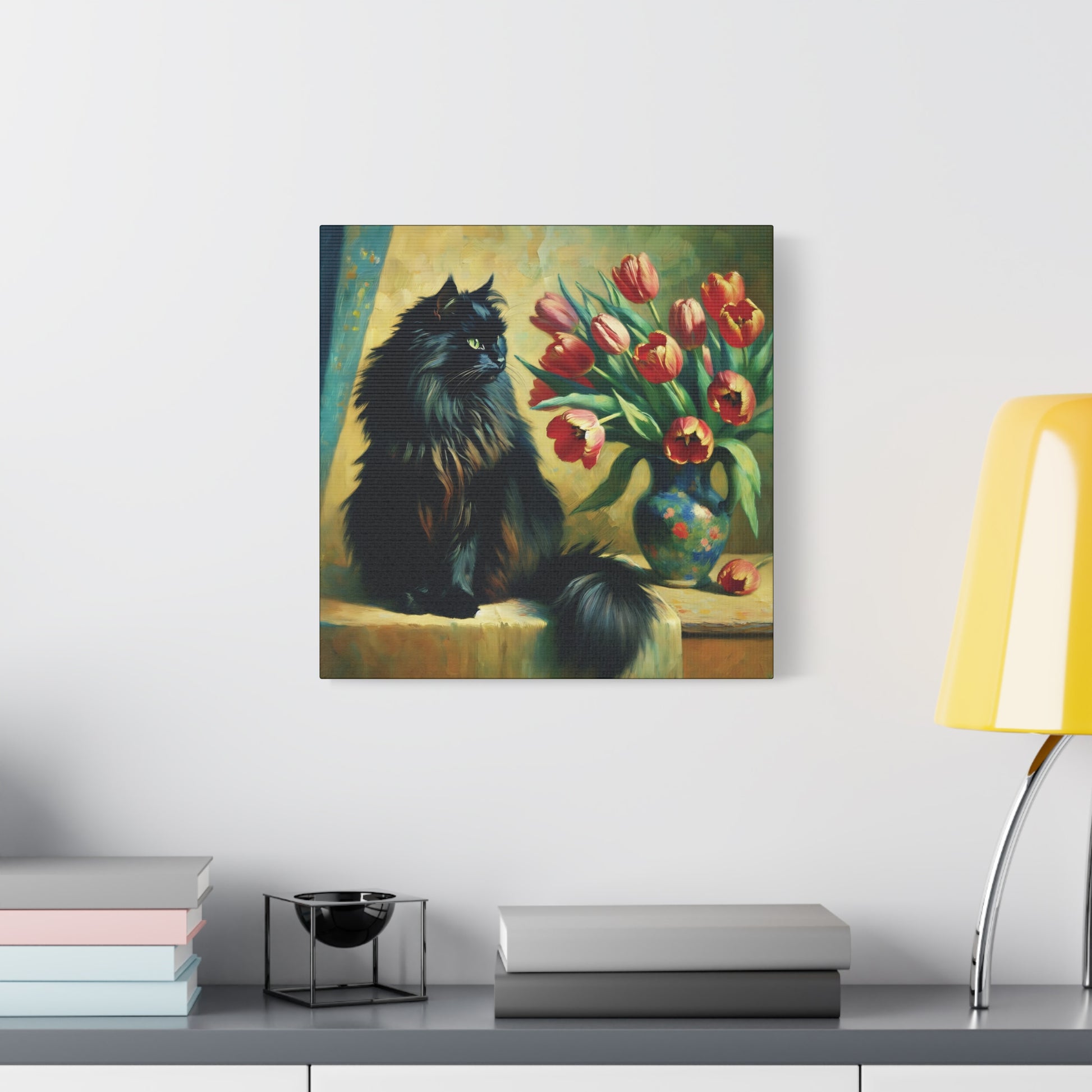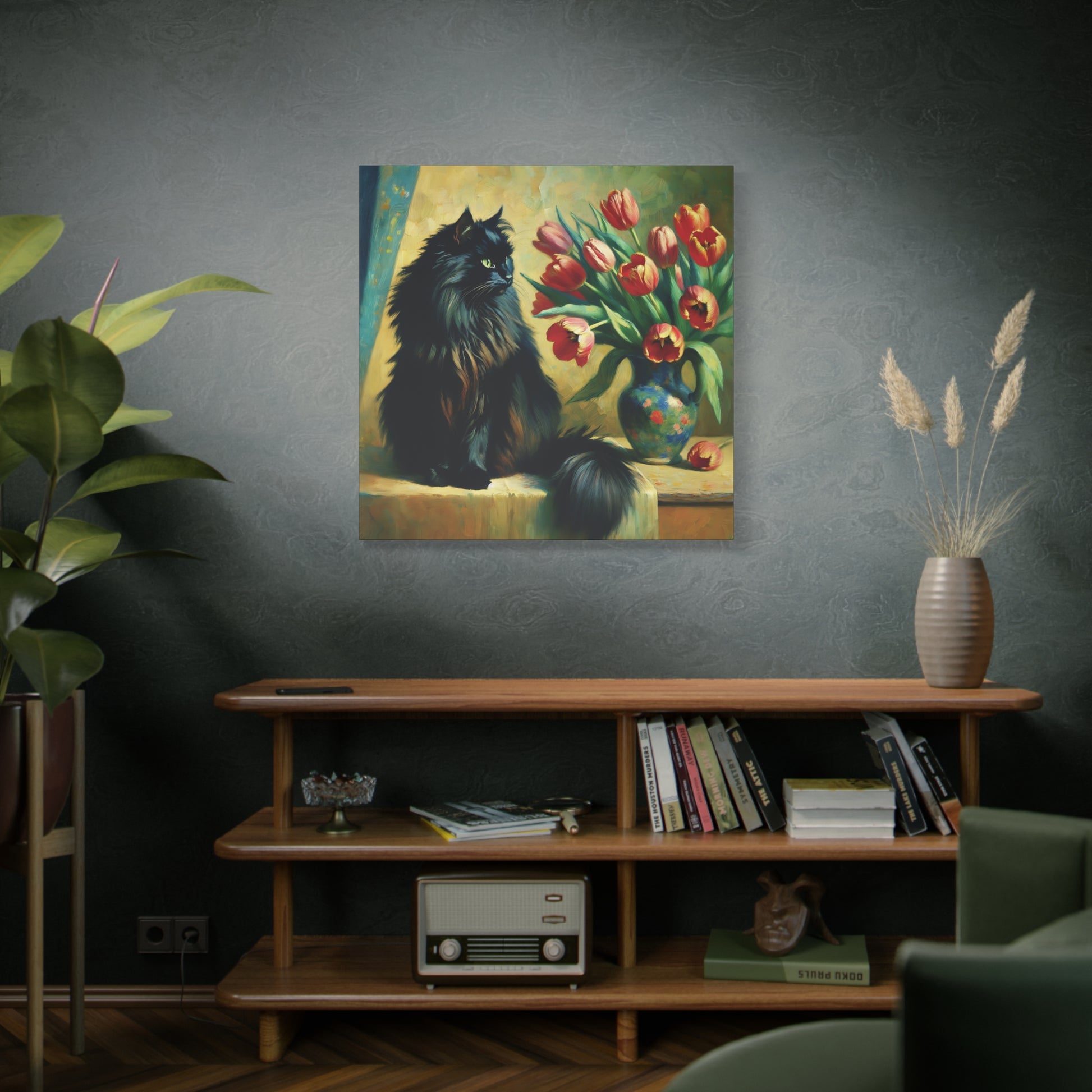 Elevate your home decor with this Impressionist Canvas Wall Art featuring the Artist's Black Cat with a vase of Red Tulips. This piece exudes a cozy and artsy vibe, perfect for art enthusiasts and cat lovers. Ideal for decorating living rooms, bedrooms, or home offices. Great for gifting on birthdays, anniversary, or housewarming parties.