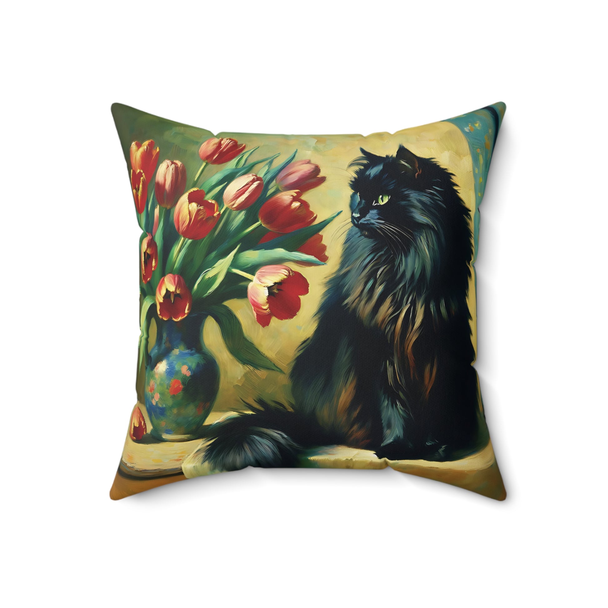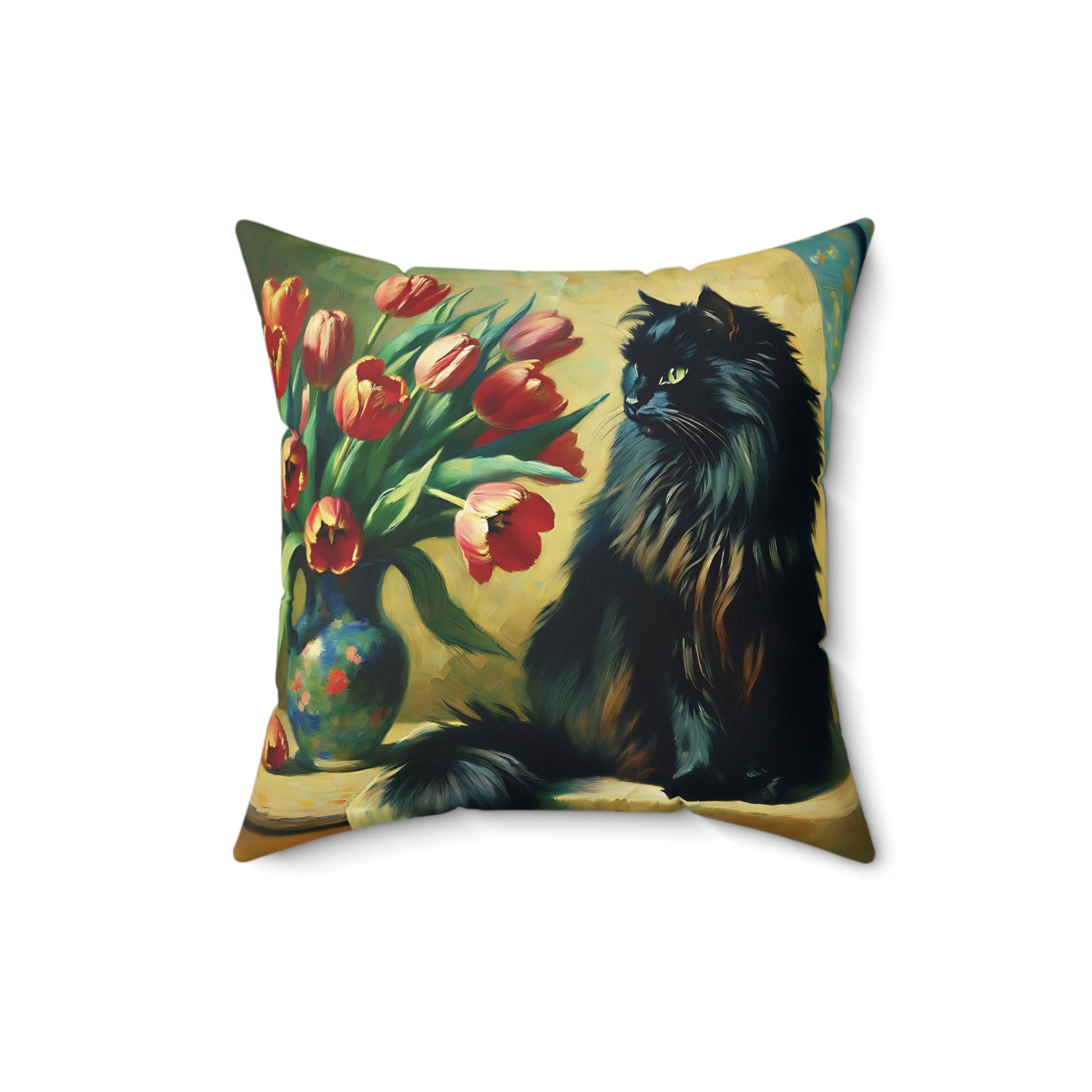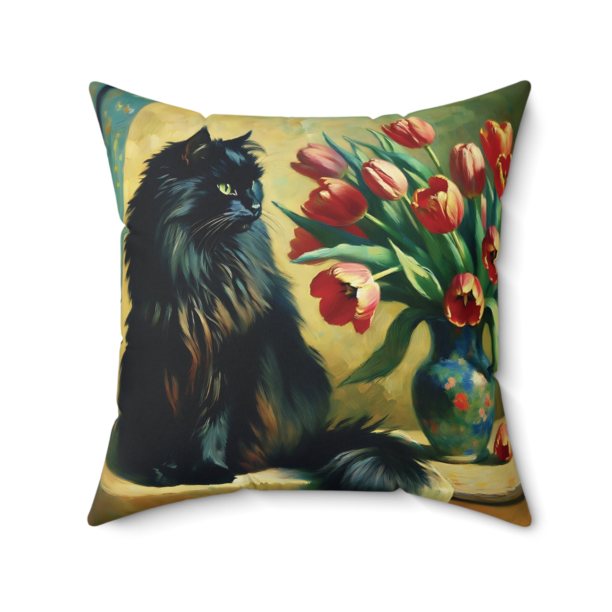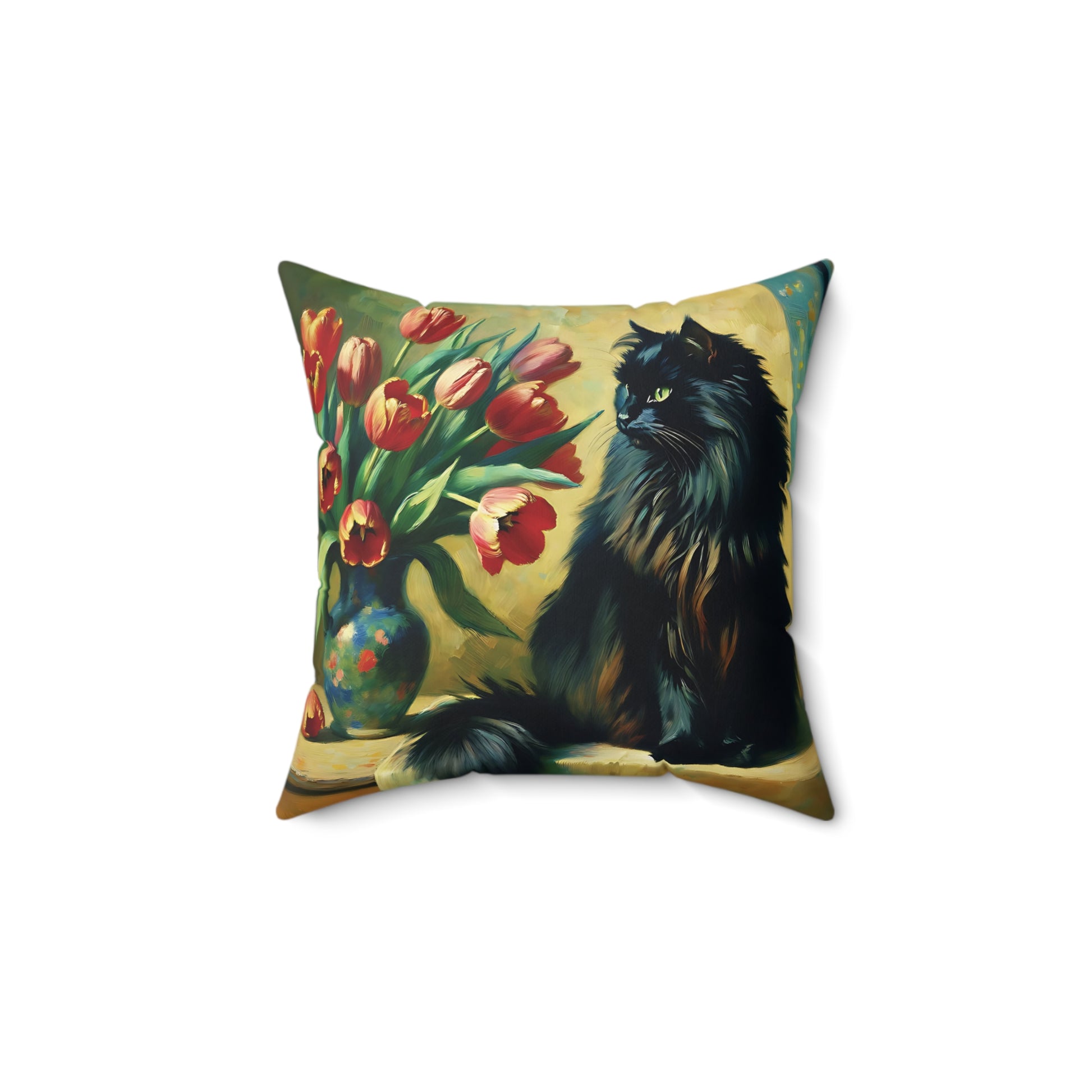 Throw Pillow - Artist's Black Cat with Red Tulips - Cozy Decorative Cushion