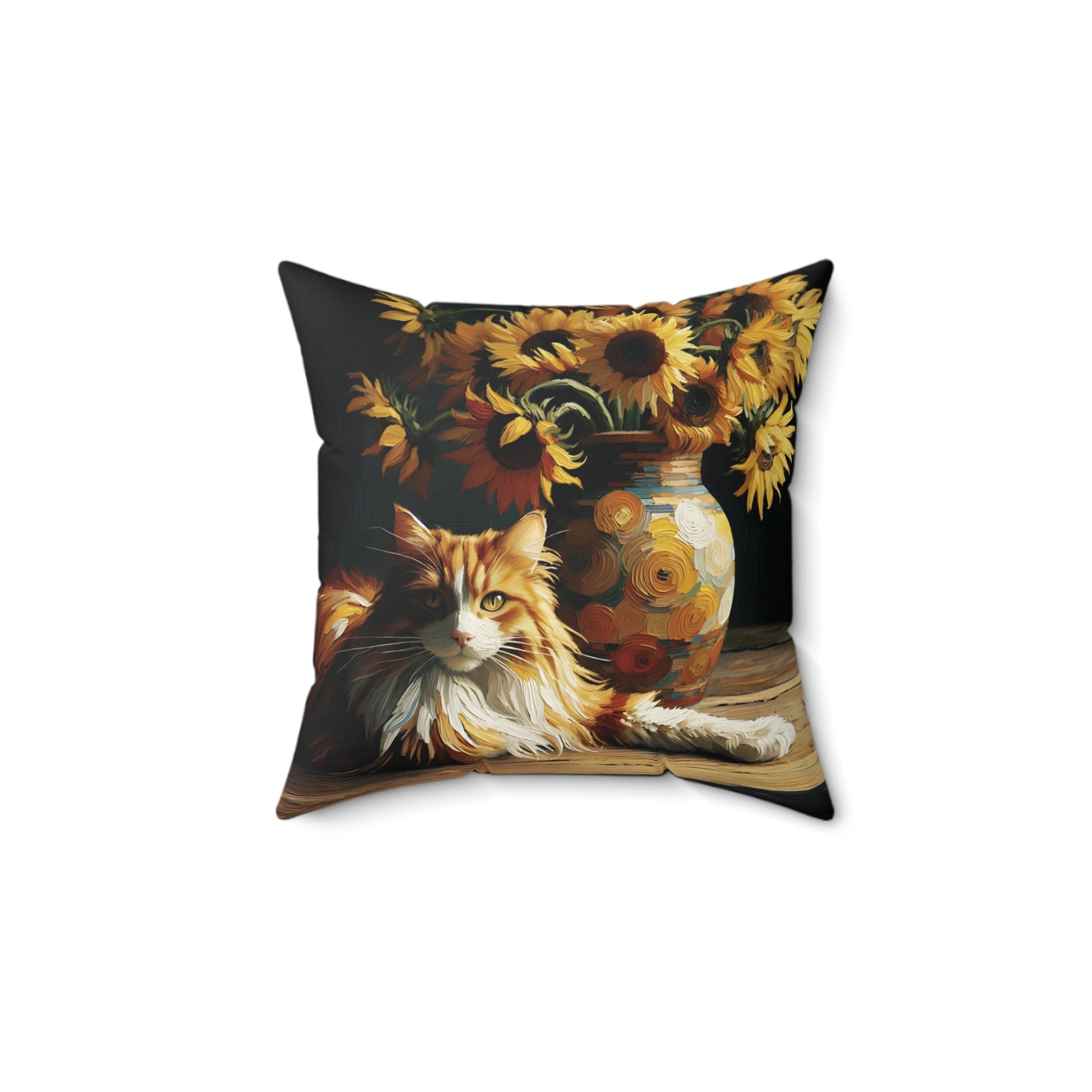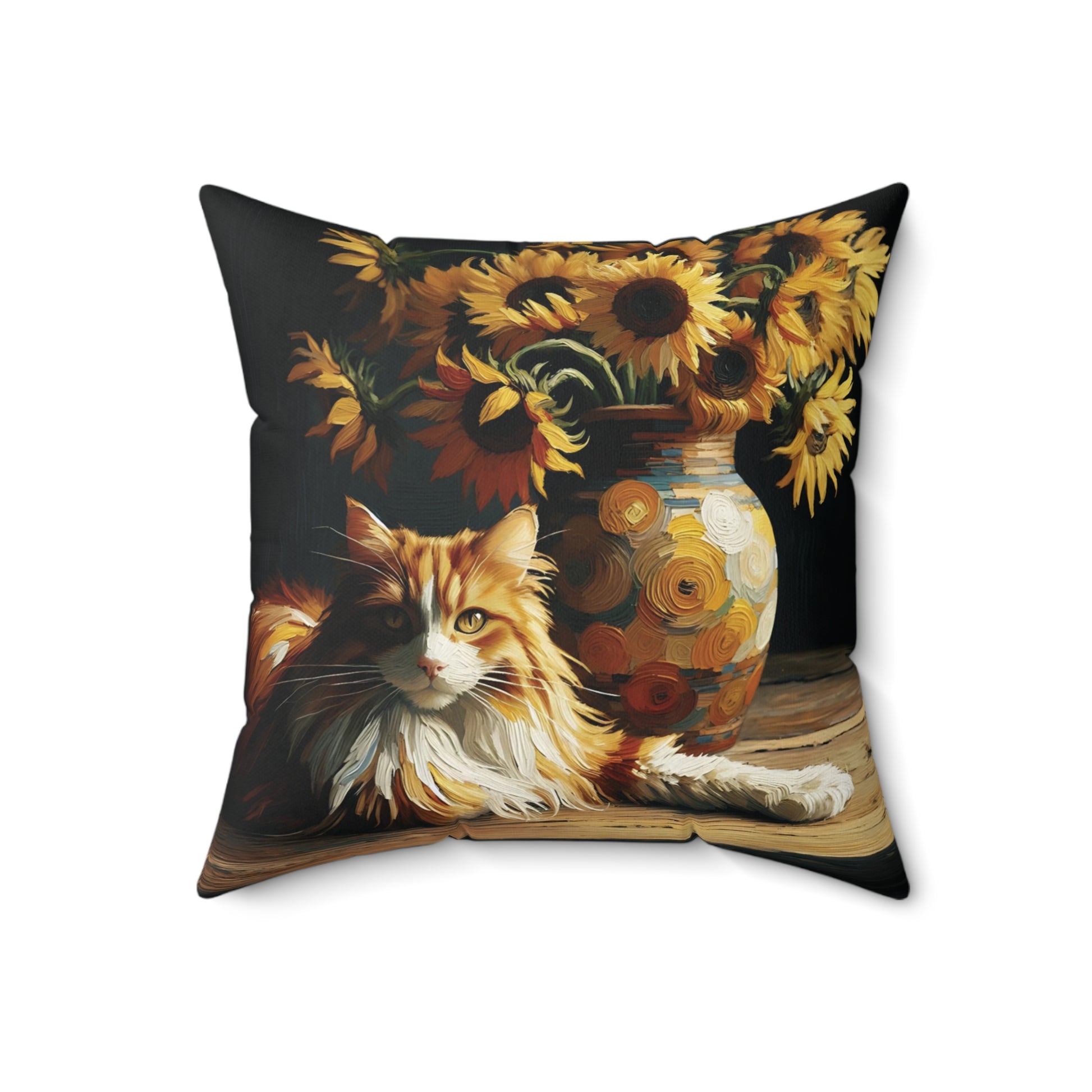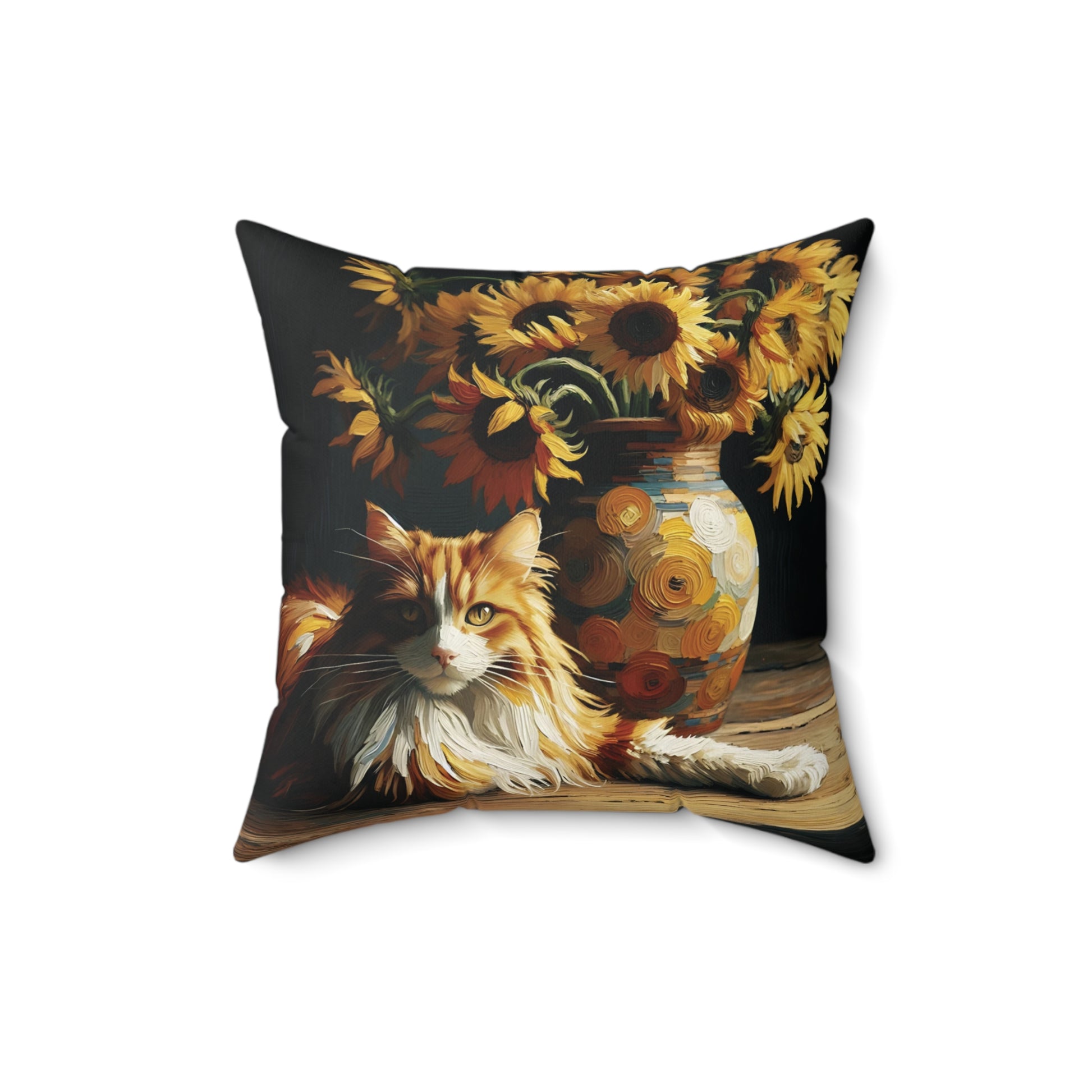 Transform your living space with this beautiful spun polyester pillow that adds a touch of elegance and warmth to any room. Its sophisticated design features a charming illustration of a cat beside a vibrant vase of sunflowers, creating a cozy and inviting atmosphere. Perfect for cat lovers or anyone who appreciates artistry in home decor, this pillow is ideal for snuggling up on the couch or adding a stylish accent to your bedroom. It’s a wonderful addition for special occasions like housewarmings, birthdays, or celebrations where comfort meets style in your home gatherings. Purrfect gift for cat lovers!