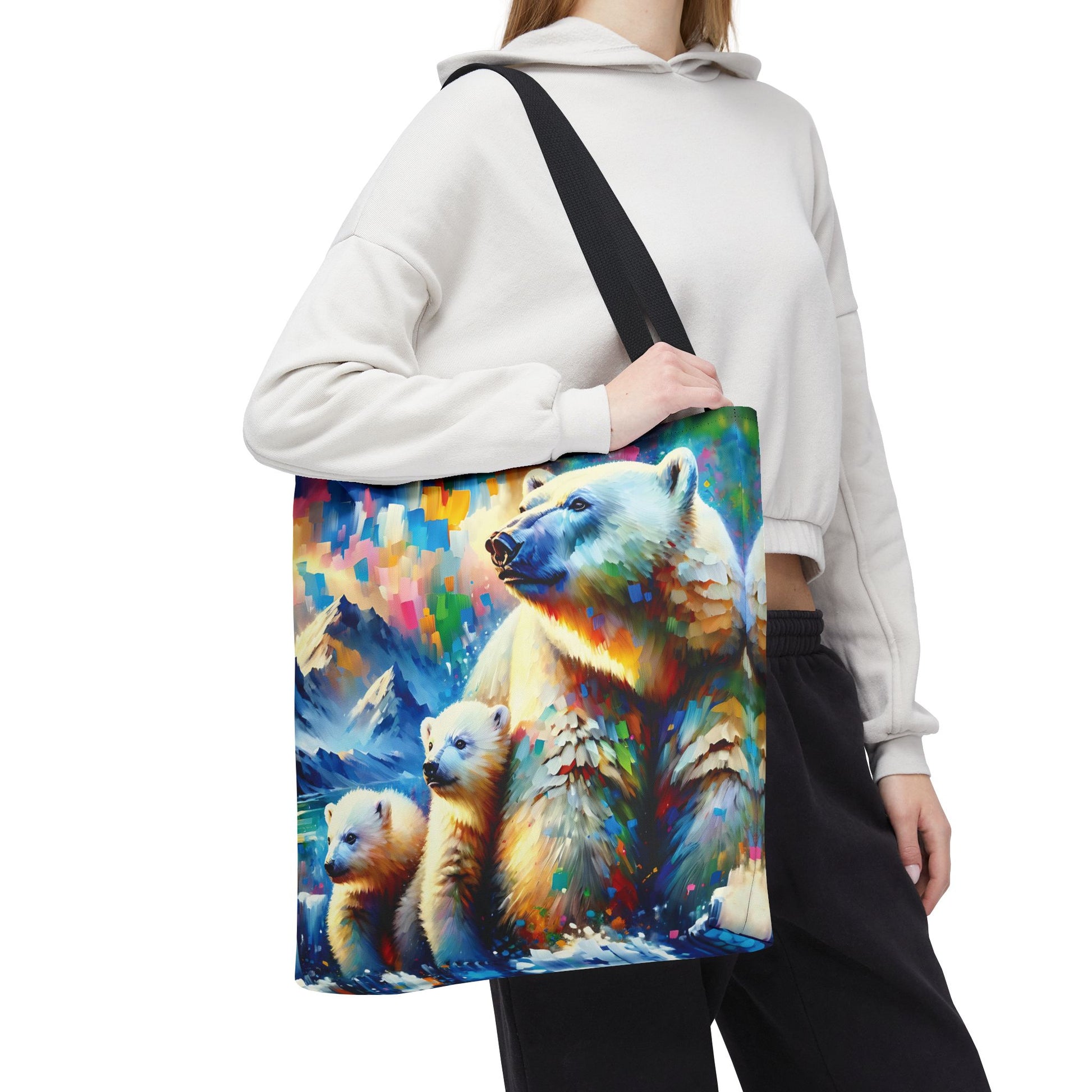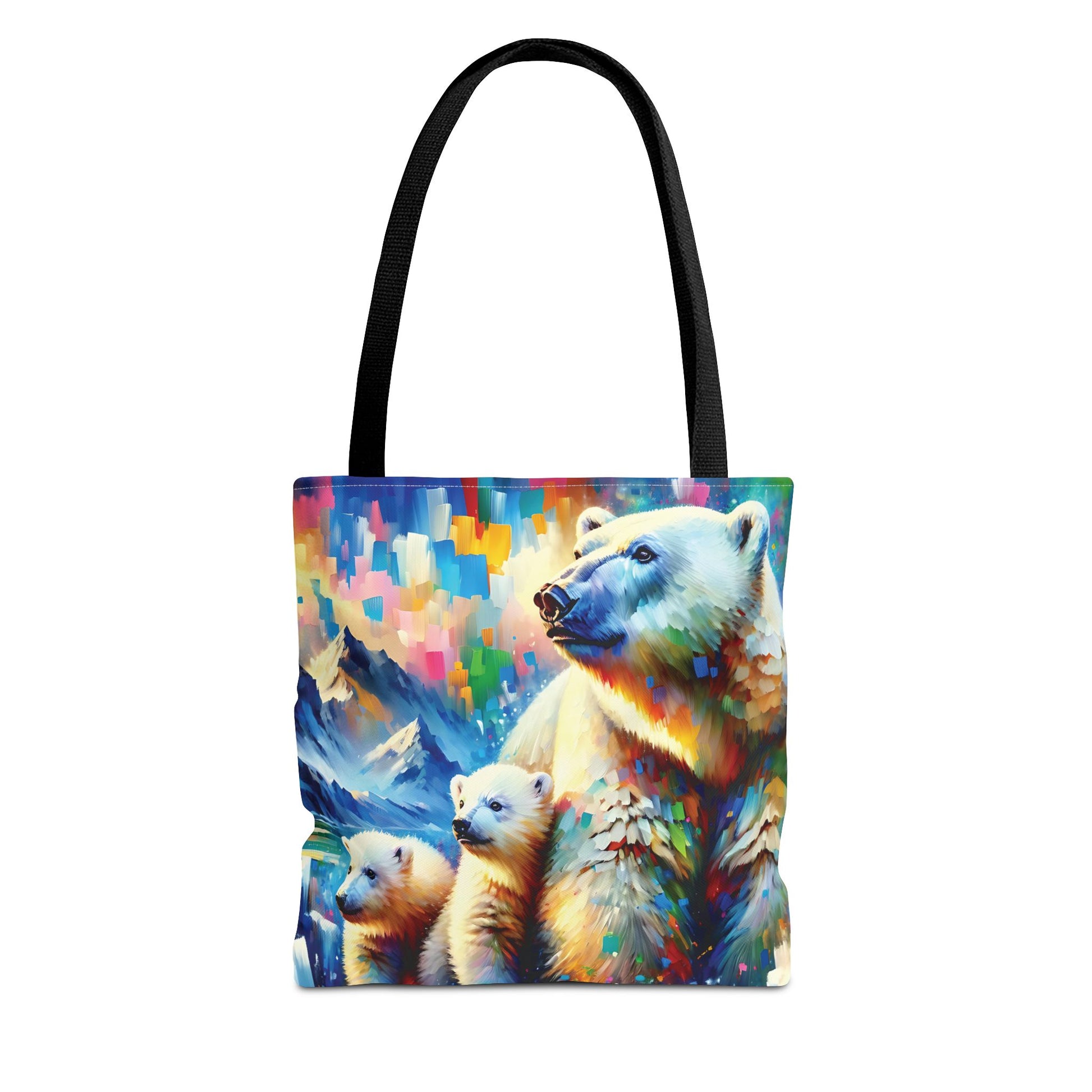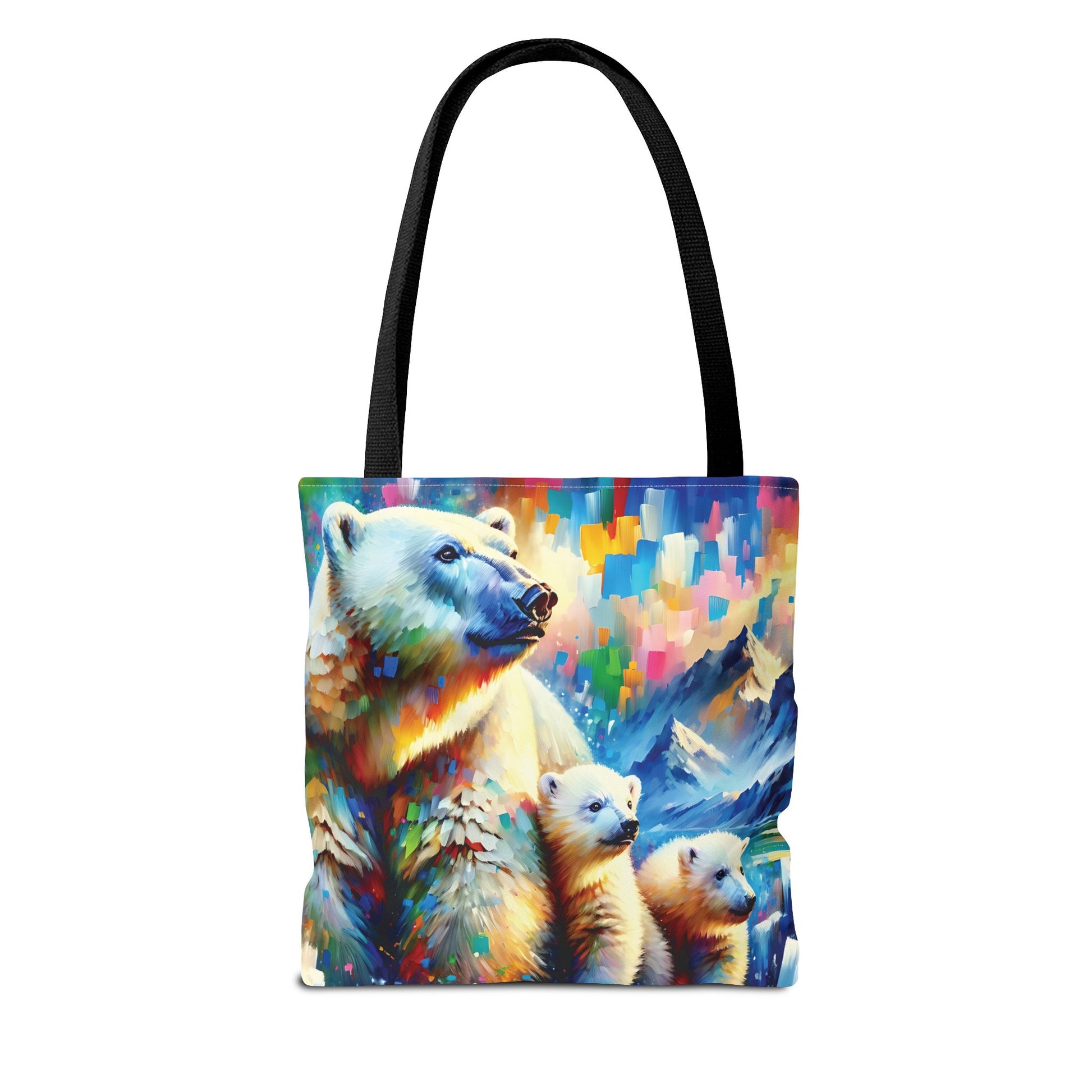This Polar Bear Tote Bag features expressionist style art of a Polar Bear Mom with Two Cubs against a colorful sky, evoking warmth and love. Perfect for nature lovers and those who appreciate family bonds, this tote bag is ideal for everyday use and makes a great gift for animal lovers. Great for Mother's Day, Earth Day, or any occasion celebrating family. Or treat yourself!