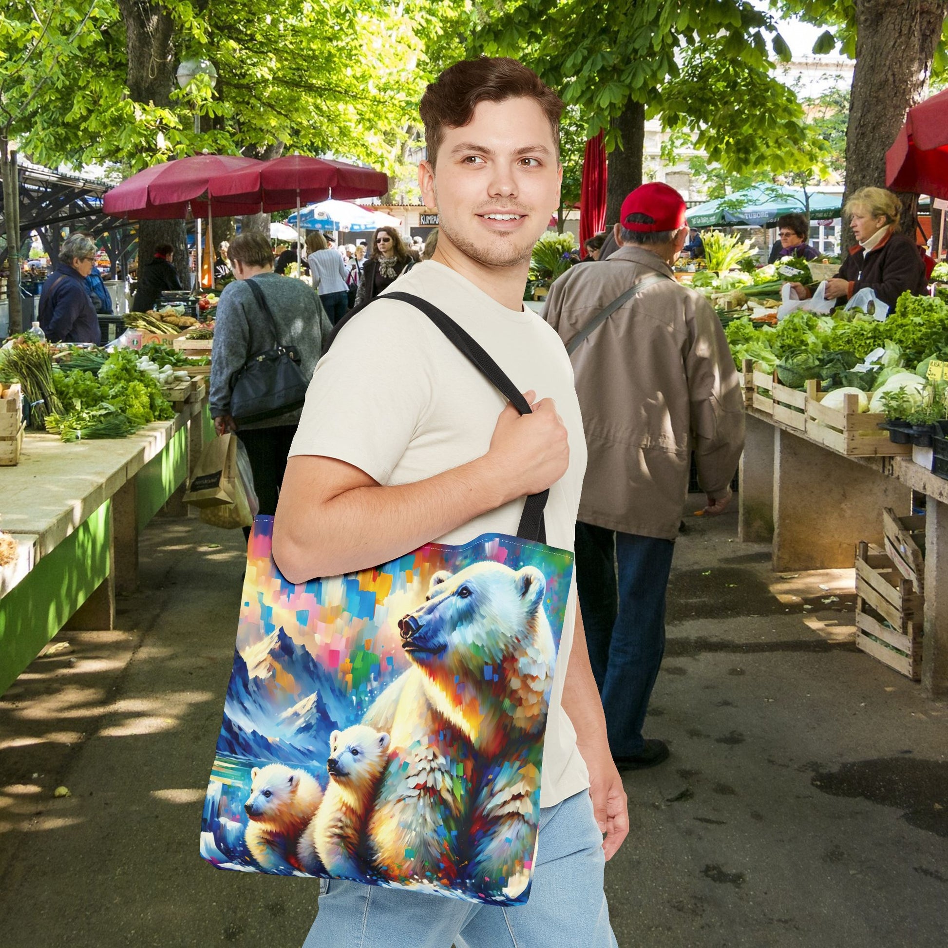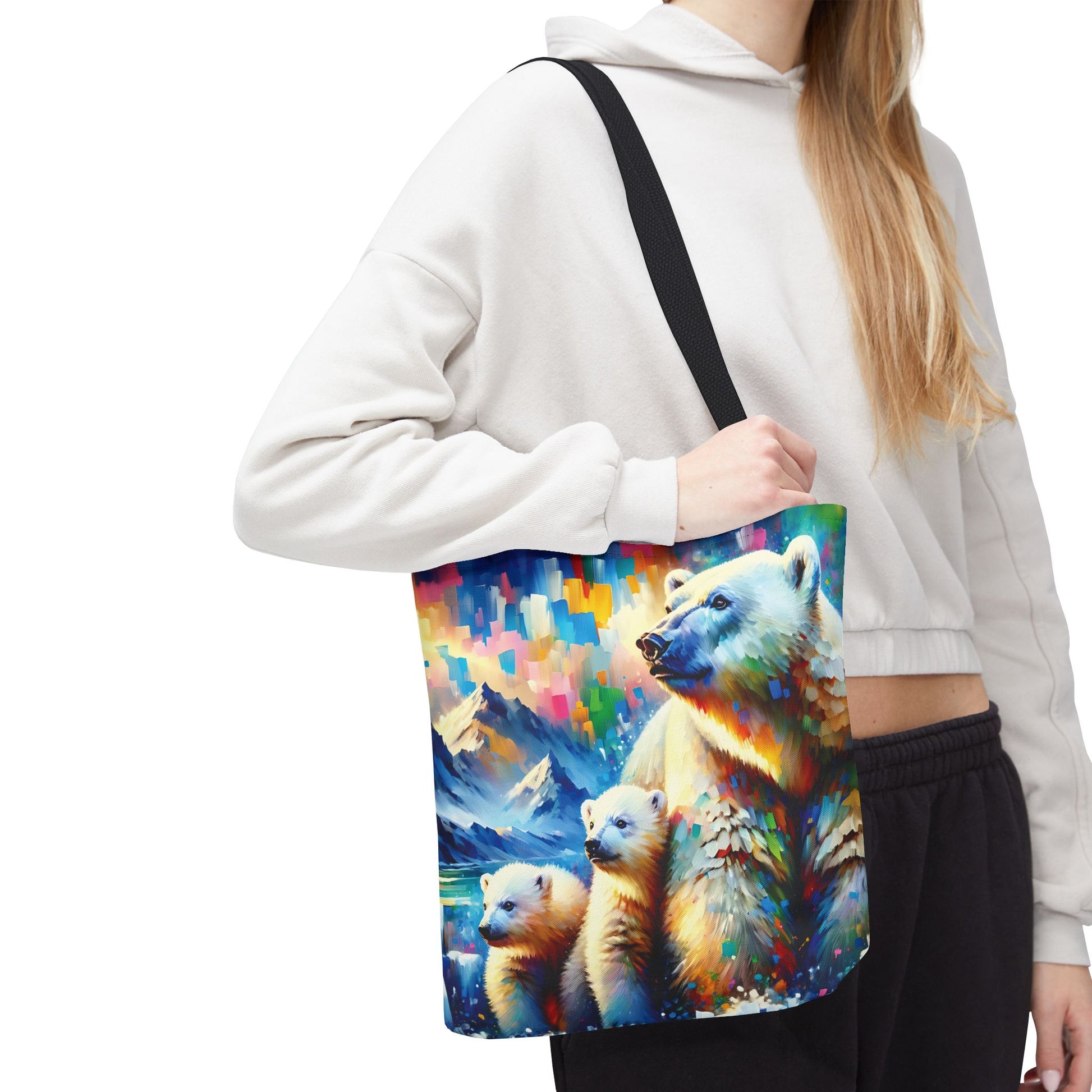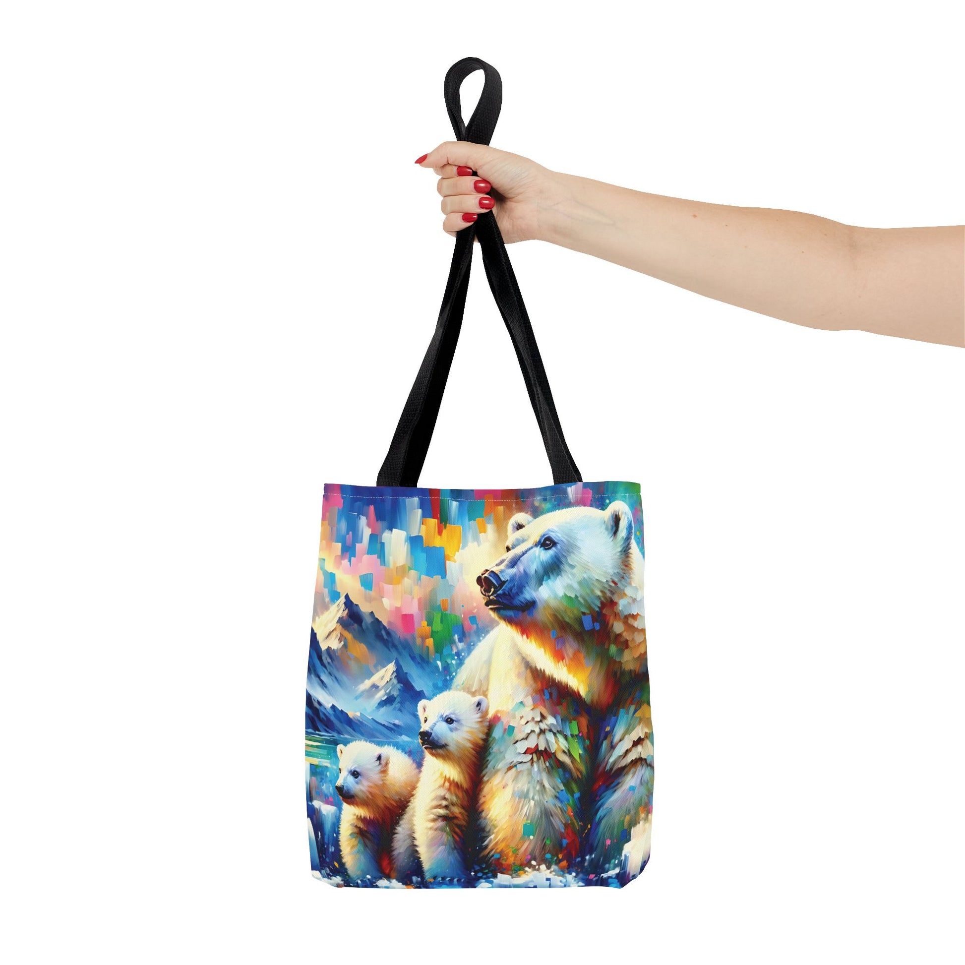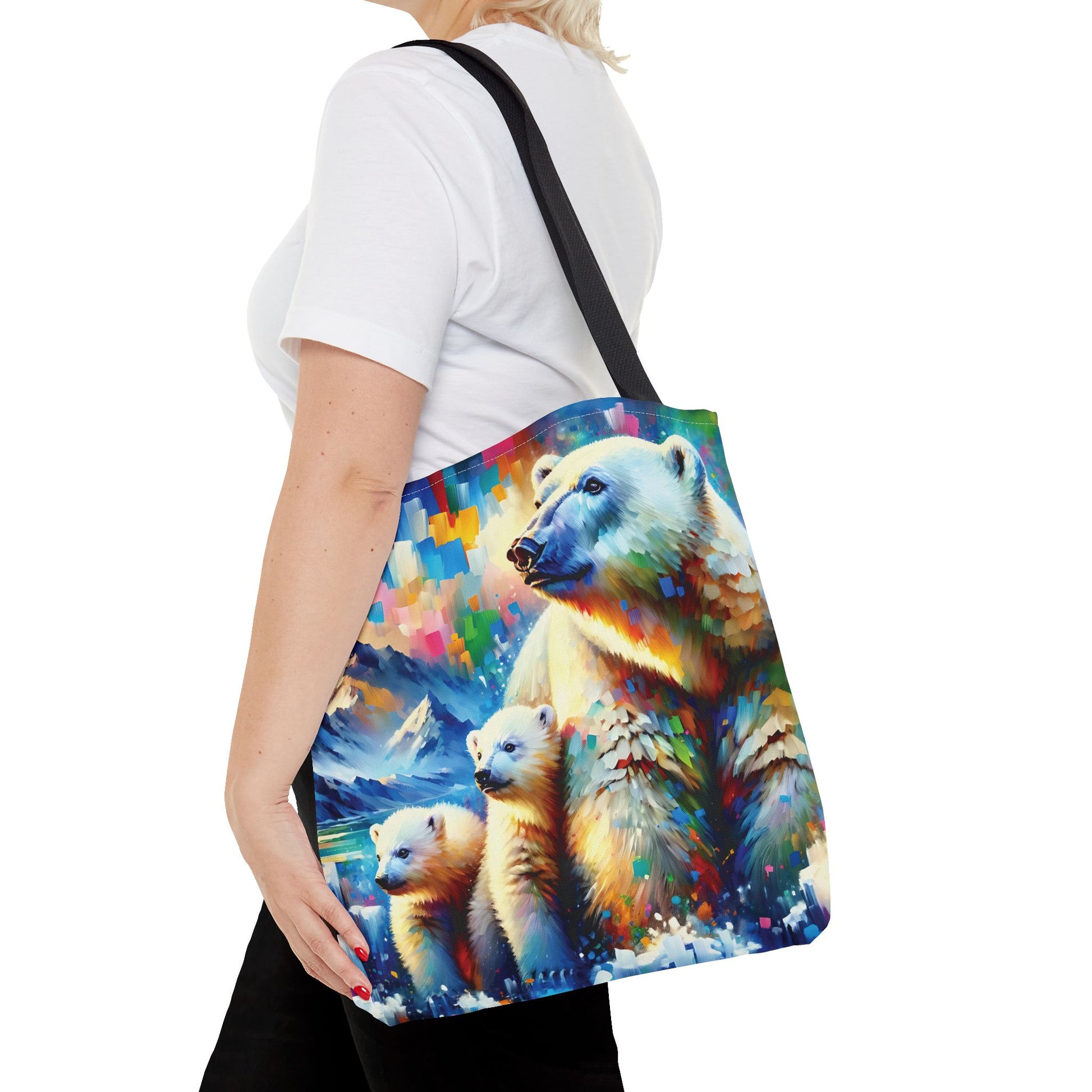 This Polar Bear Tote Bag features expressionist style art of a Polar Bear Mom with Two Cubs against a colorful sky, evoking warmth and love. Perfect for nature lovers and those who appreciate family bonds, this tote bag is ideal for everyday use and makes a great gift for animal lovers. Great for Mother's Day, Earth Day, or any occasion celebrating family. Or treat yourself!