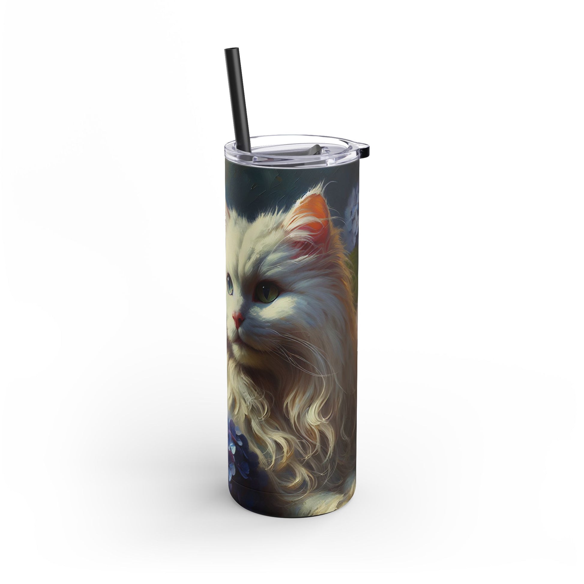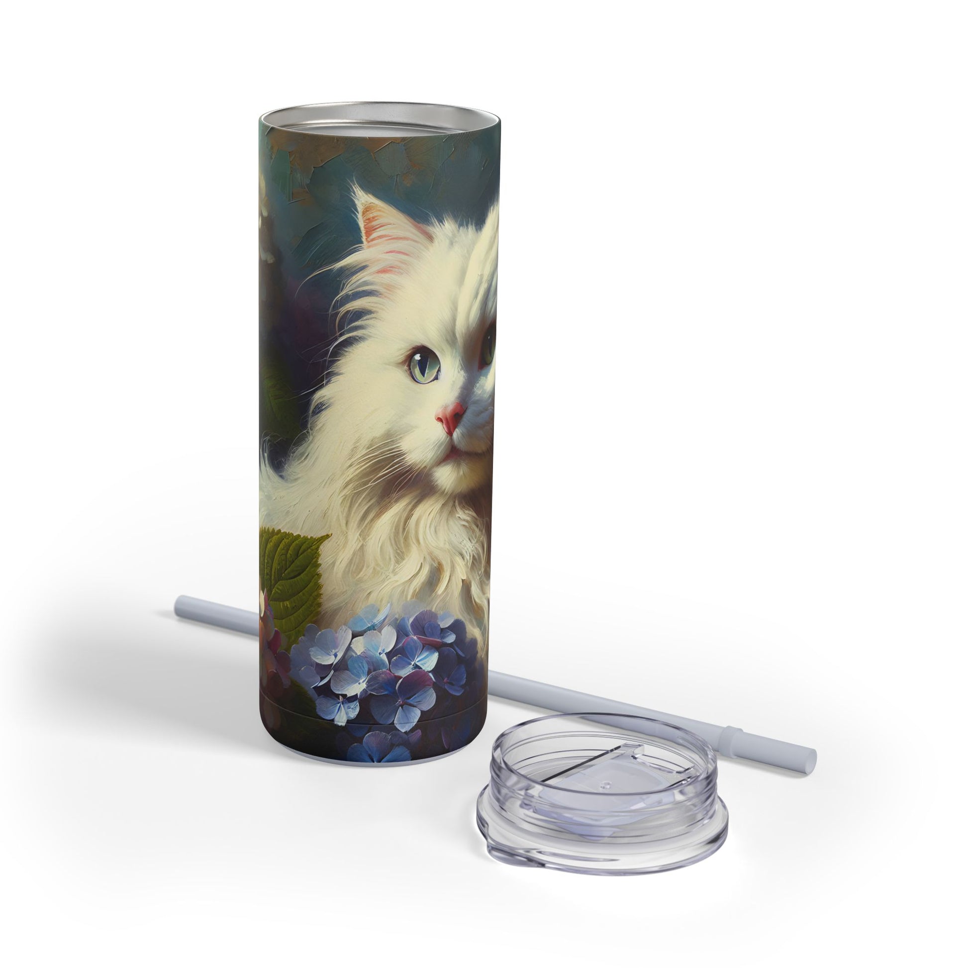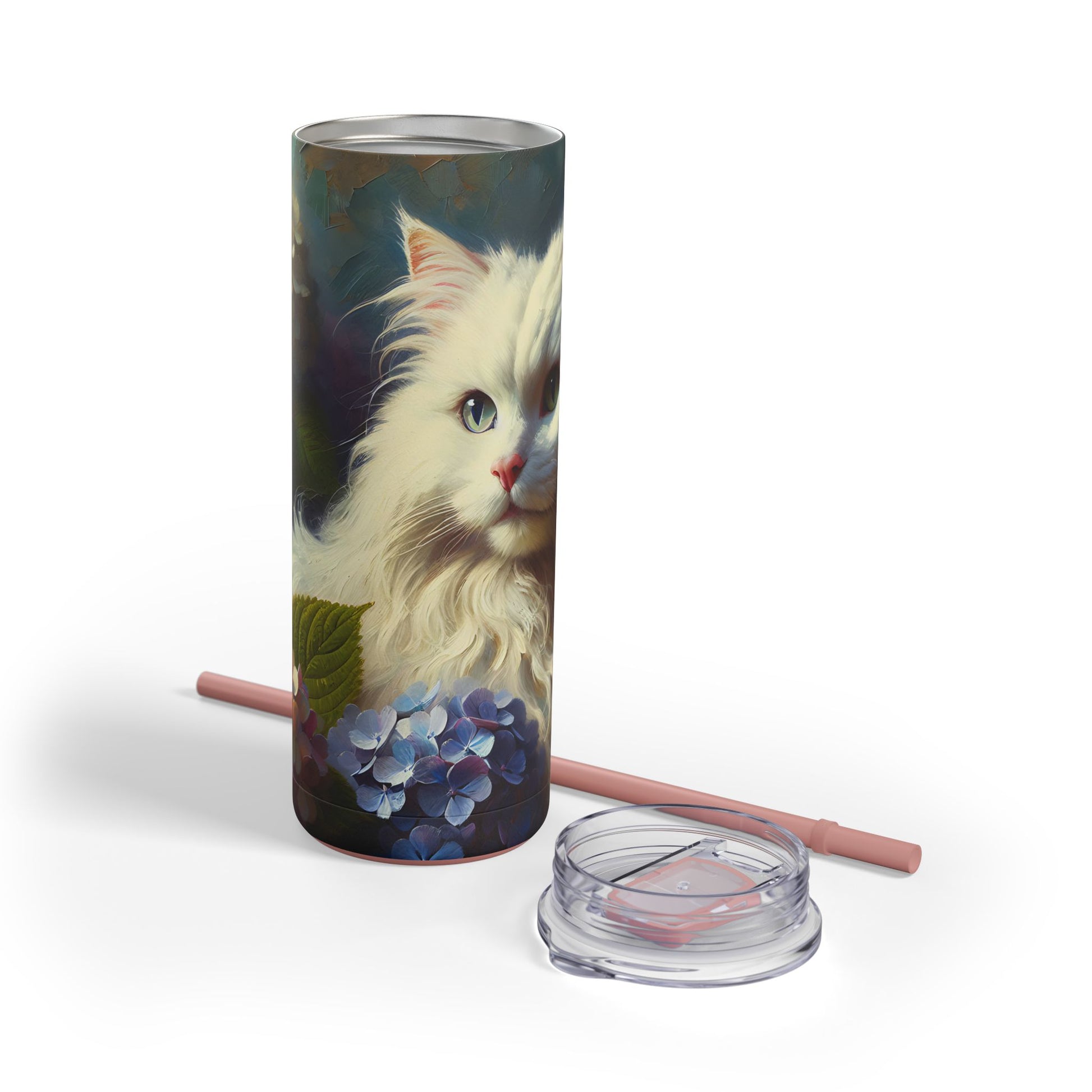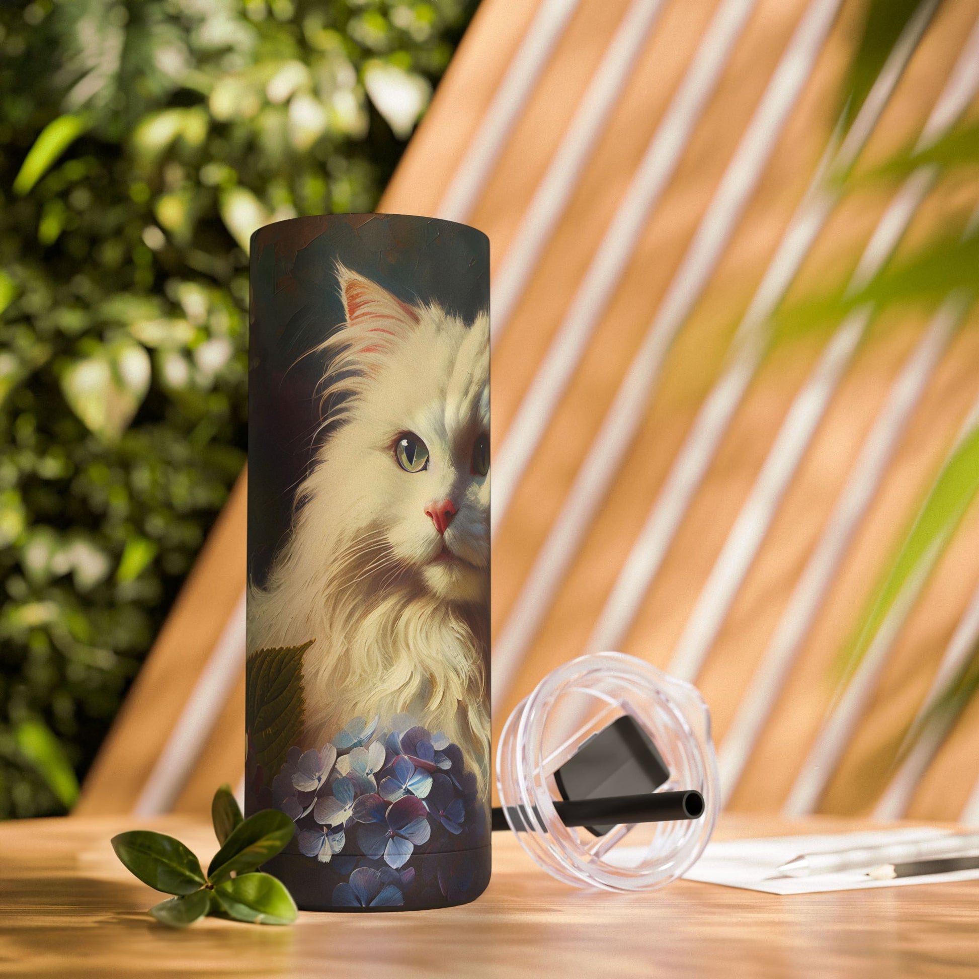 This 20oz Matte Skinny Travel Mug features The Artist's White Cat with Hydrangeas in an Impressionist Art Style. With double-wall insulation, vibrant colors, and a lid with a color-matching straw, this tumbler is perfect for art lovers and cat enthusiasts. Keep your drinks warm for up to 12 hours or cold for up to 24 hours in style.
