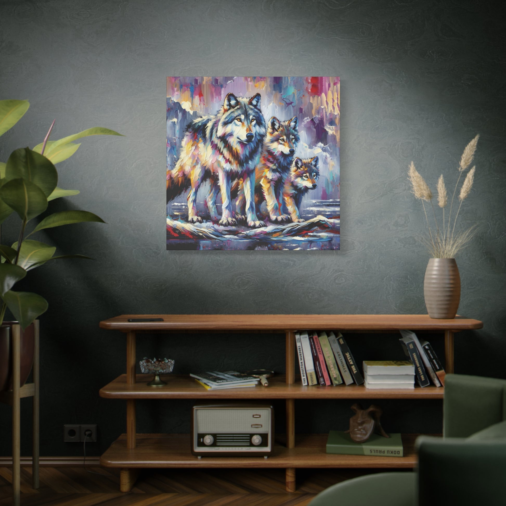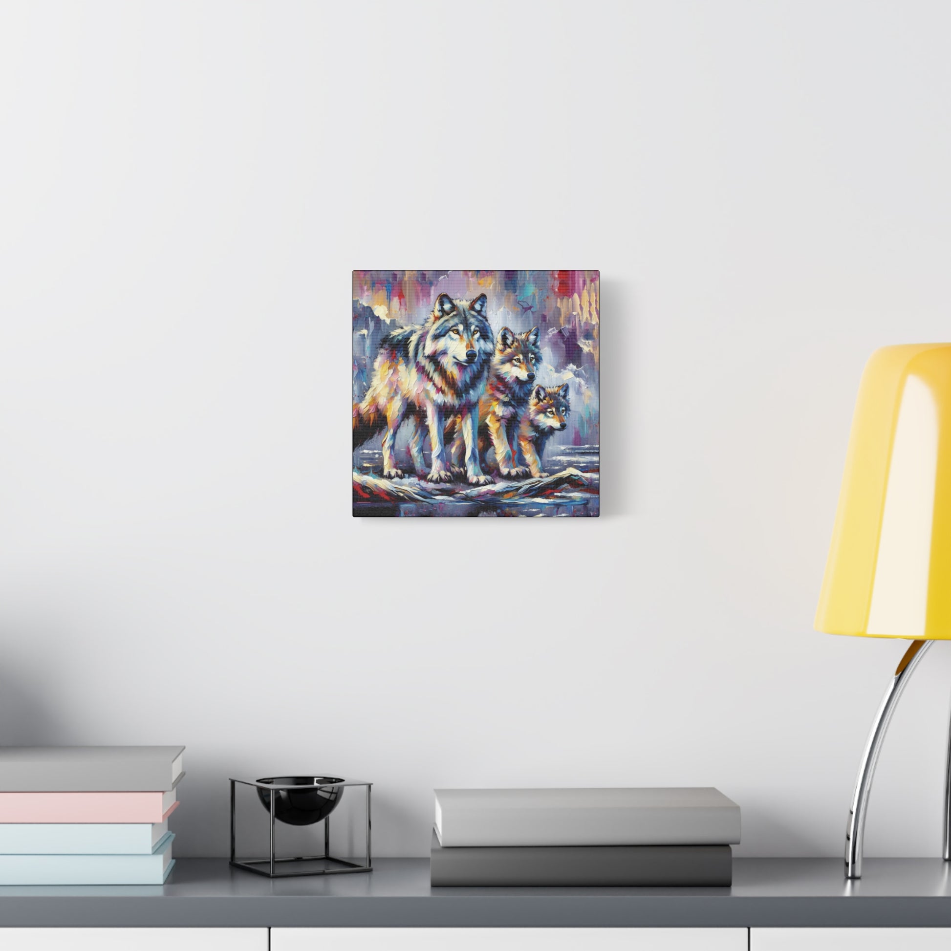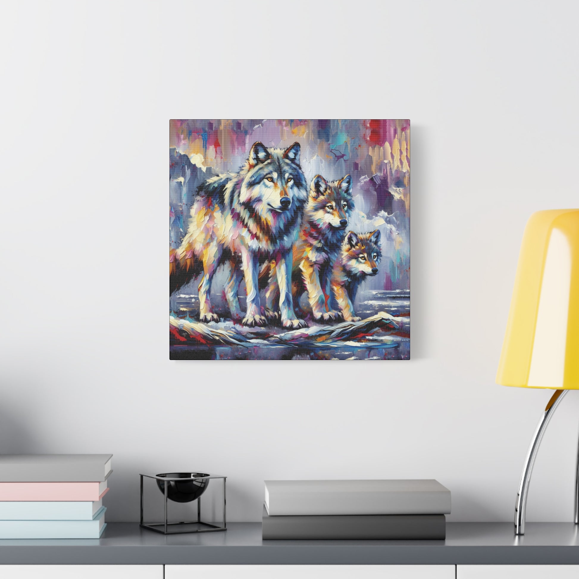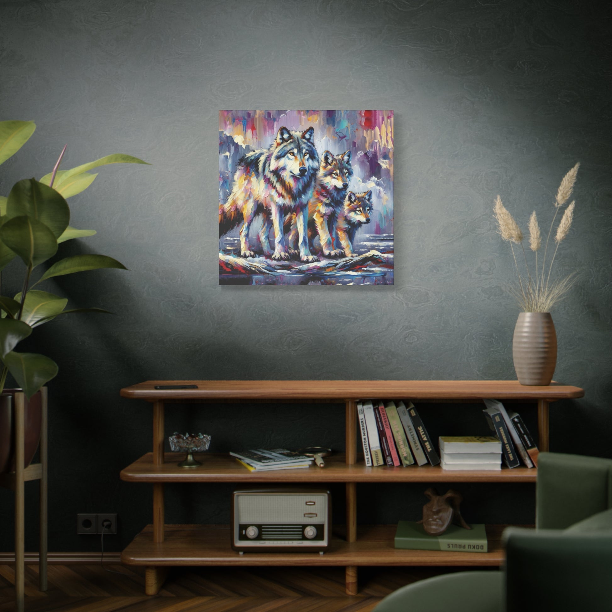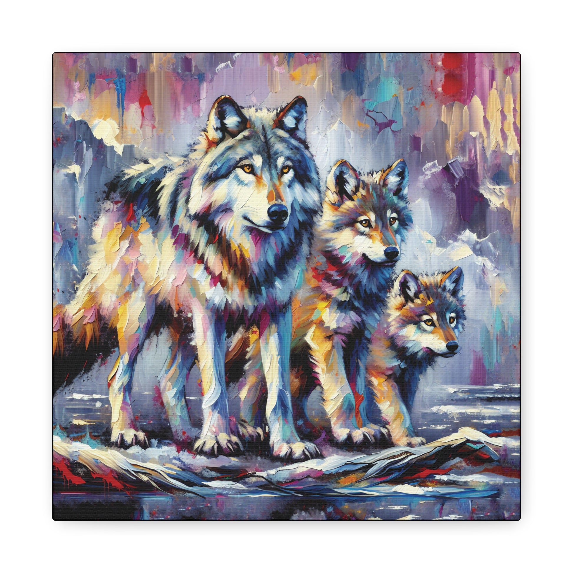 The adult wolf is teaching this year's young how to navigate the pitfalls of winter. This canvas will add a touch of strength and determination to any room and is perfect for wolf lovers or those who appreciate expressive art. Ideal for home decor, office spaces, or as a gift for nature enthusiasts.