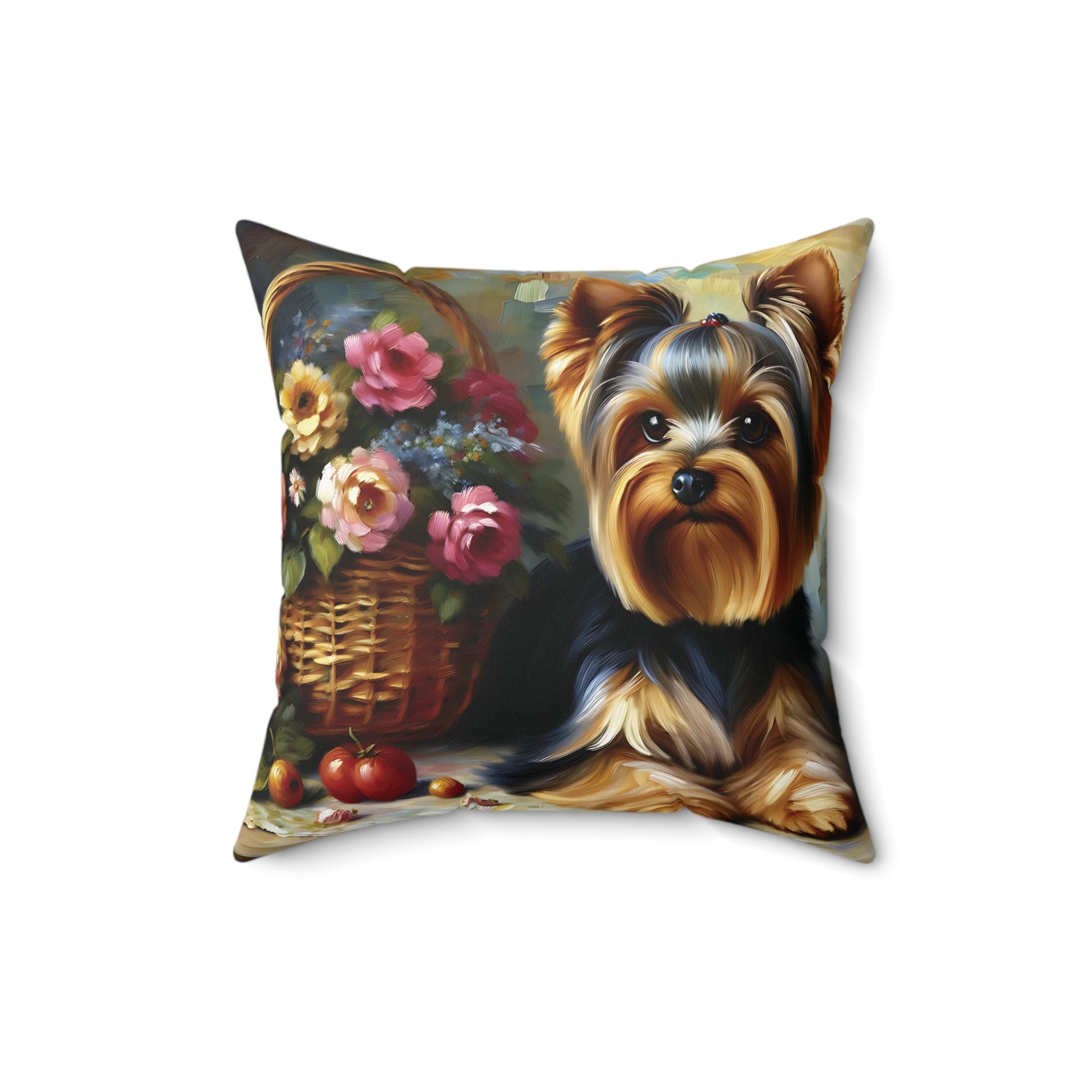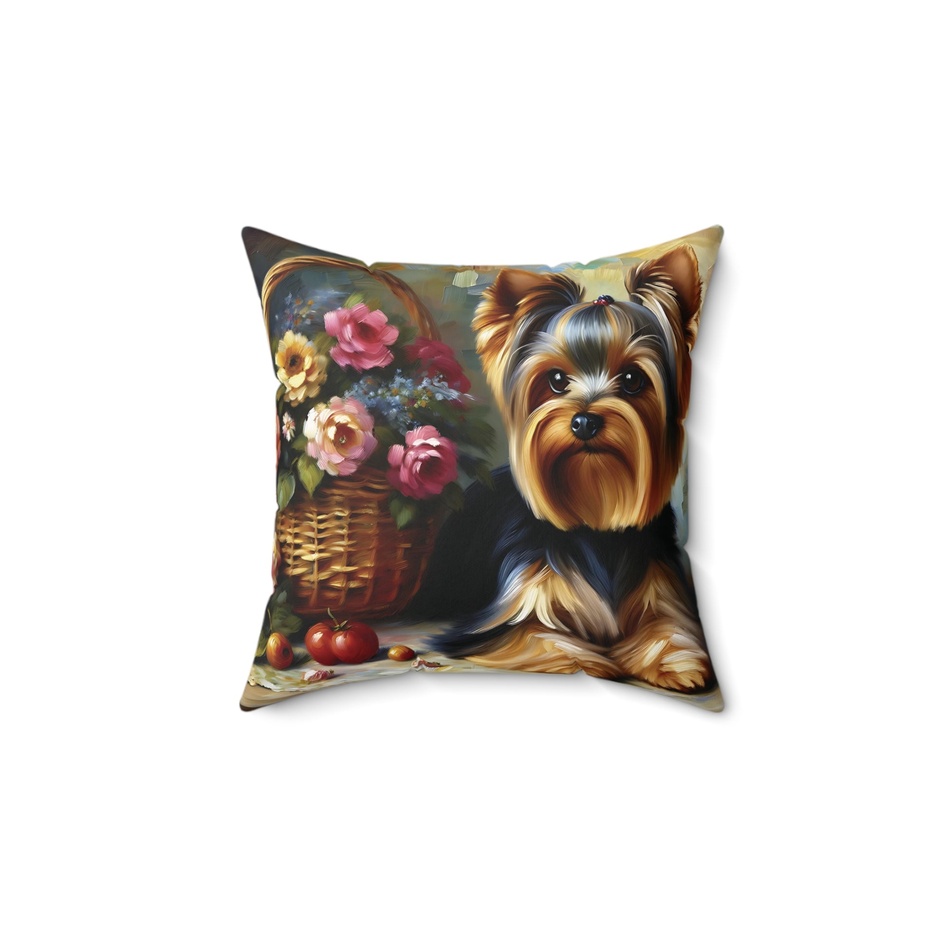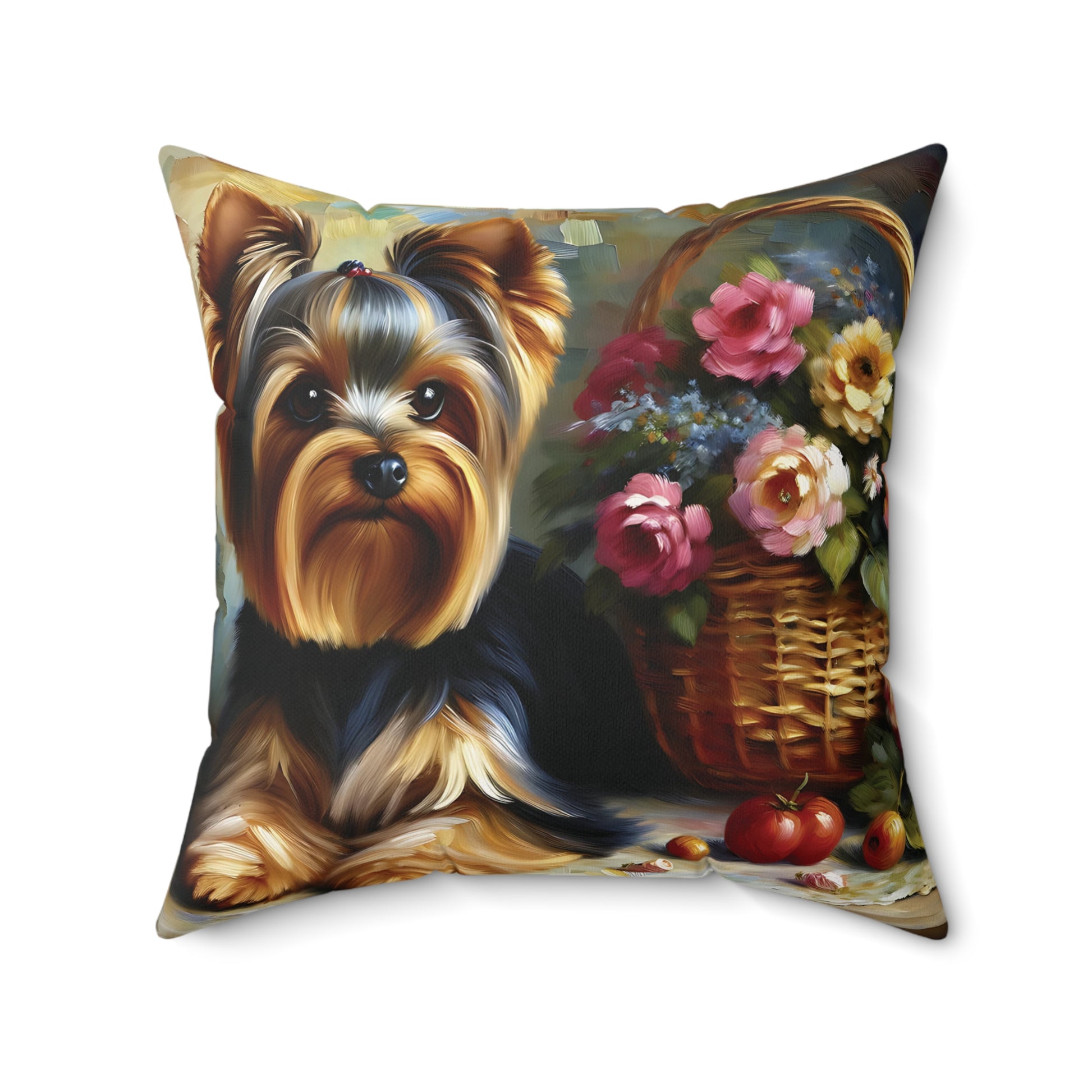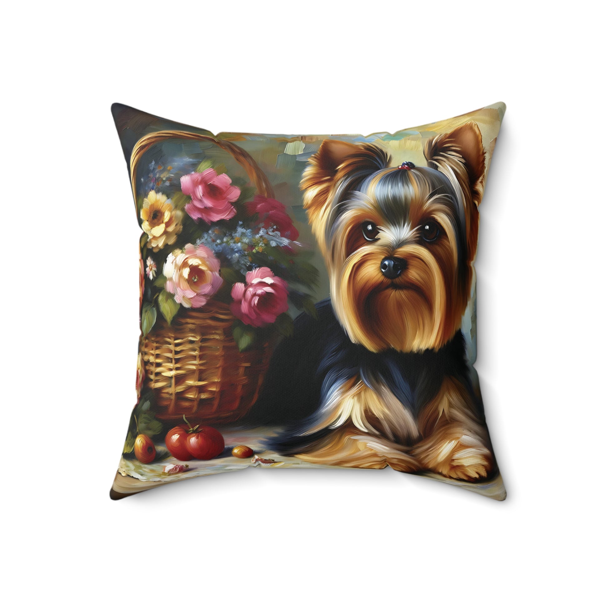 This adorable item features "Yorkshire Terrier with a Basket of Flowers" on a Faux Suede Square Pillow. The Impressionist Style Art adds a cozy and artsy touch to any living space, perfect for dog lovers and art enthusiasts. Ideal for gifting on occasions like birthdays, holidays, and housewarmings. Yorkie lovers yip with joy!